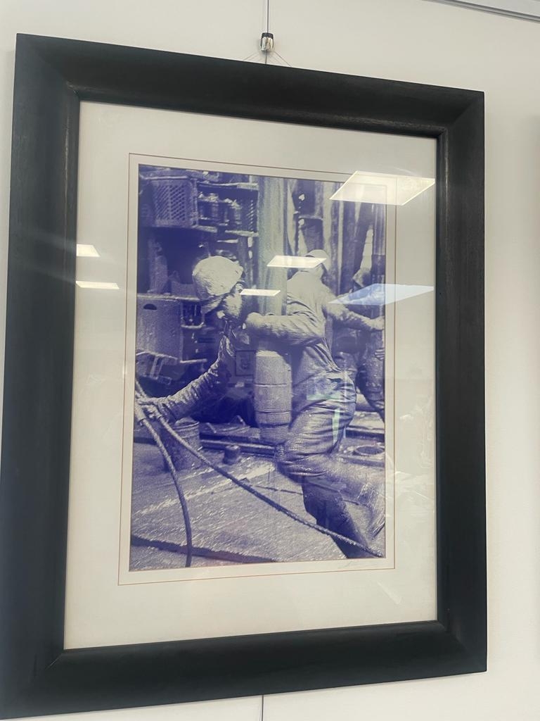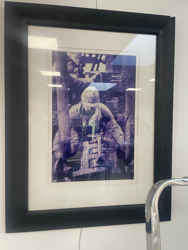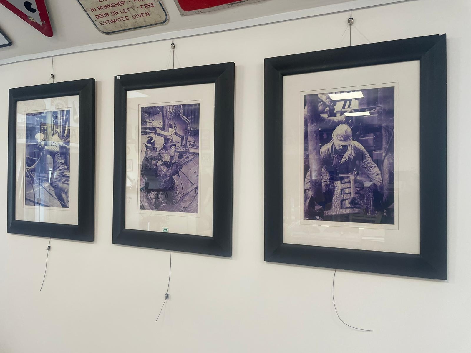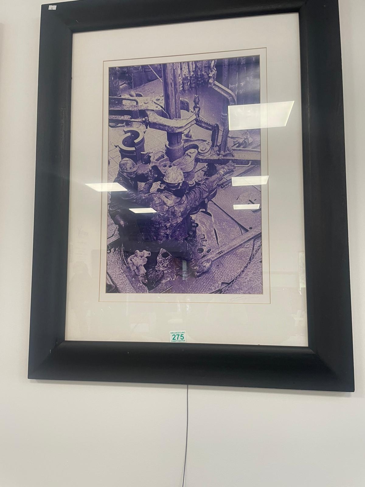 3 framed signed photographic prints, oil rig workers, approx 96cm x 75cm each
