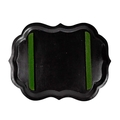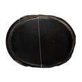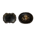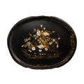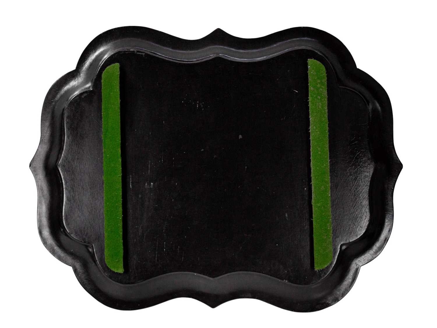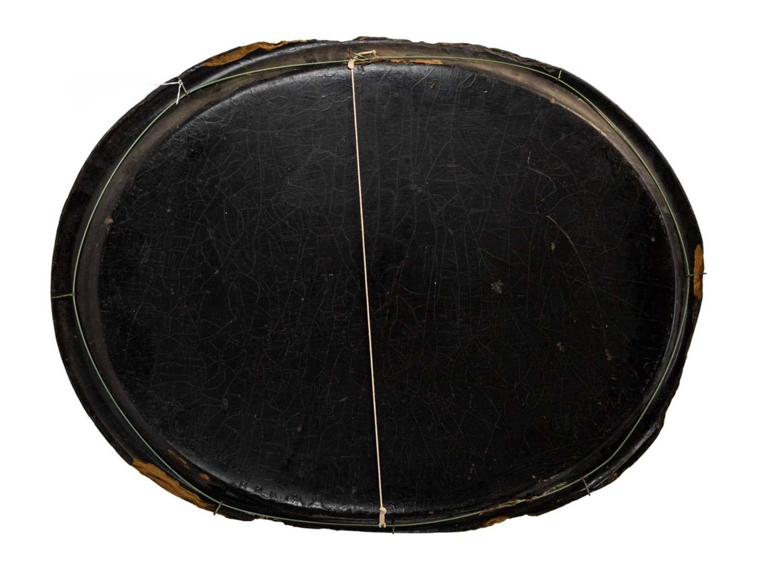 An early Victorian black lacquered tea tray. The bracketed border painted with iron red, green and gilt foliate scrolls, 59 x 79cm, together with a similar oval tea tray (2).