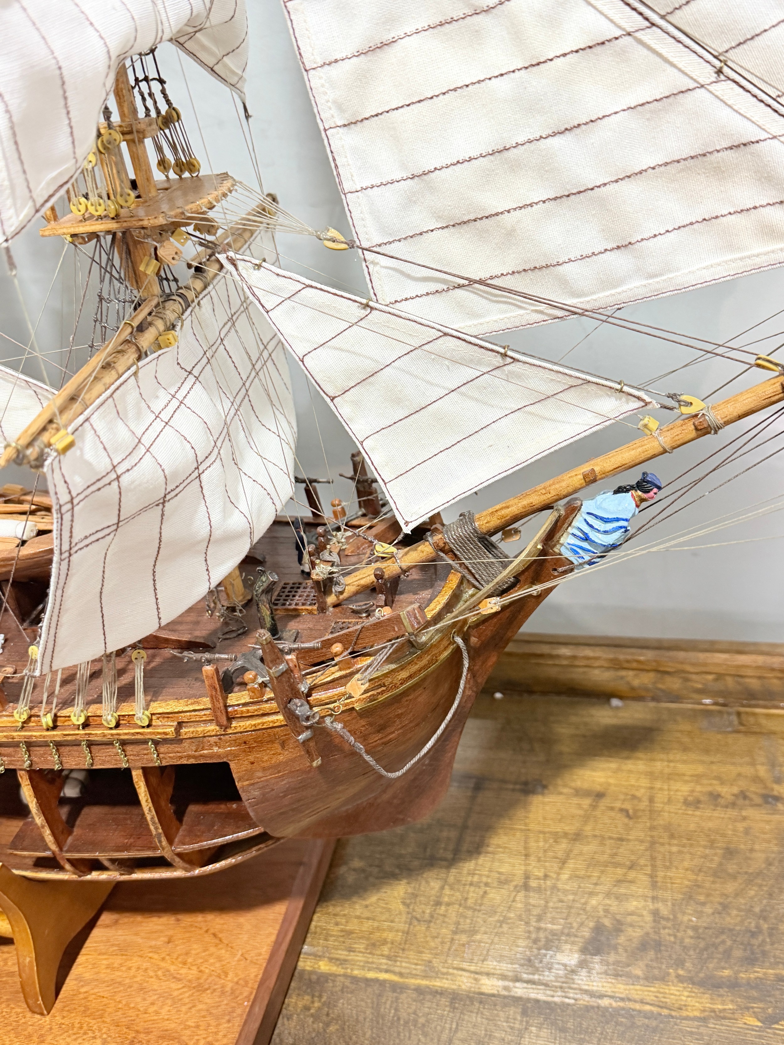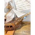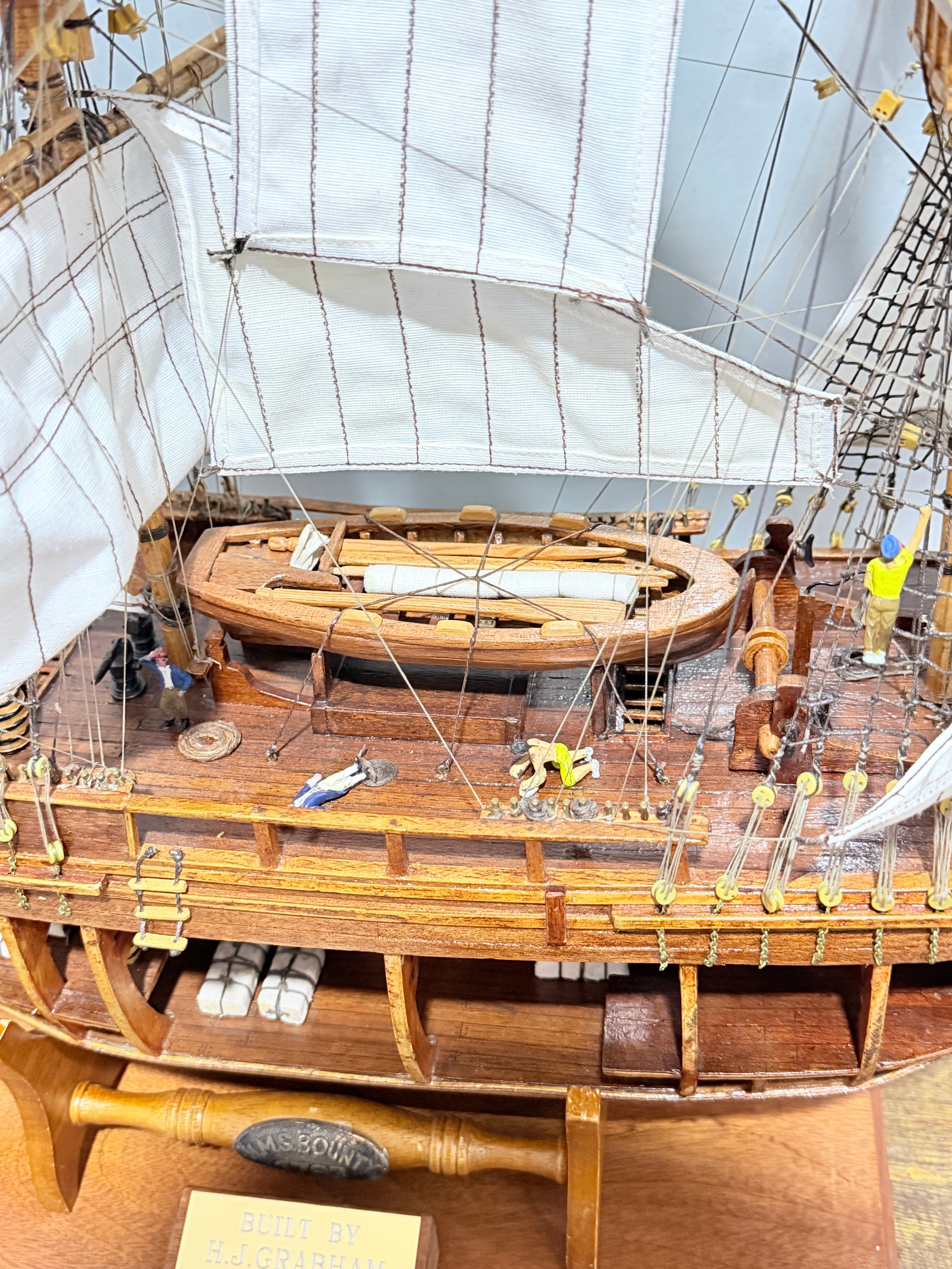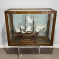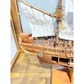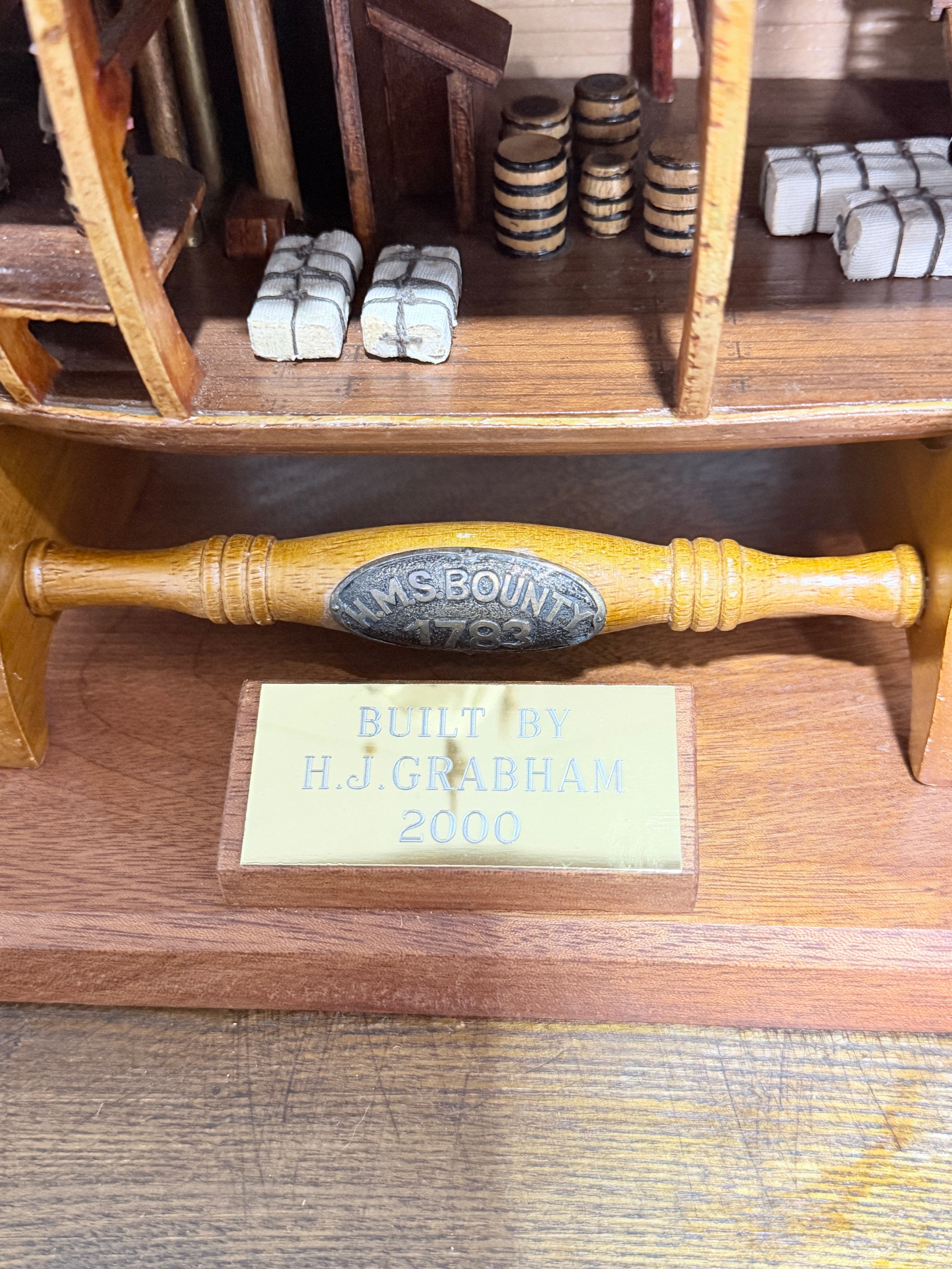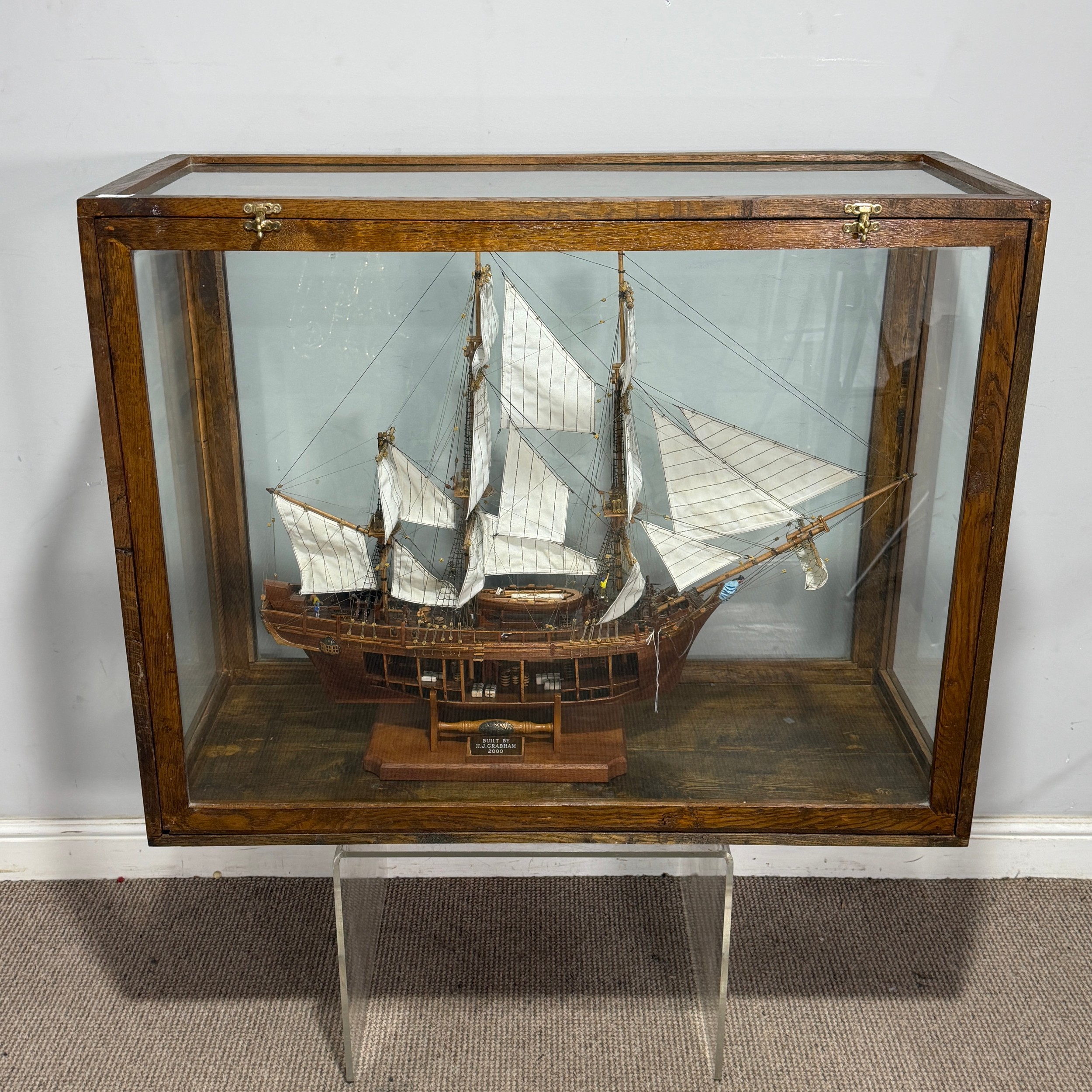 A scratch-built model of the H.M.S Bounty, built by H.J Brabham, 2000, housed in an oak glazed Case, together with a 1992 'Ships & Explorers, Bounty' coin from The official silver commemorative coin Collection, a half penny 1965, and related provenance, (ship) W 90 cm x H 75 cm x D 22 cm, (case) W 105 cm x H 83 cm x D 22 cm. This ship proudly came in at second place in the Fleet Air Arm Museum model show of 2002.