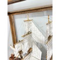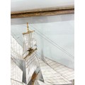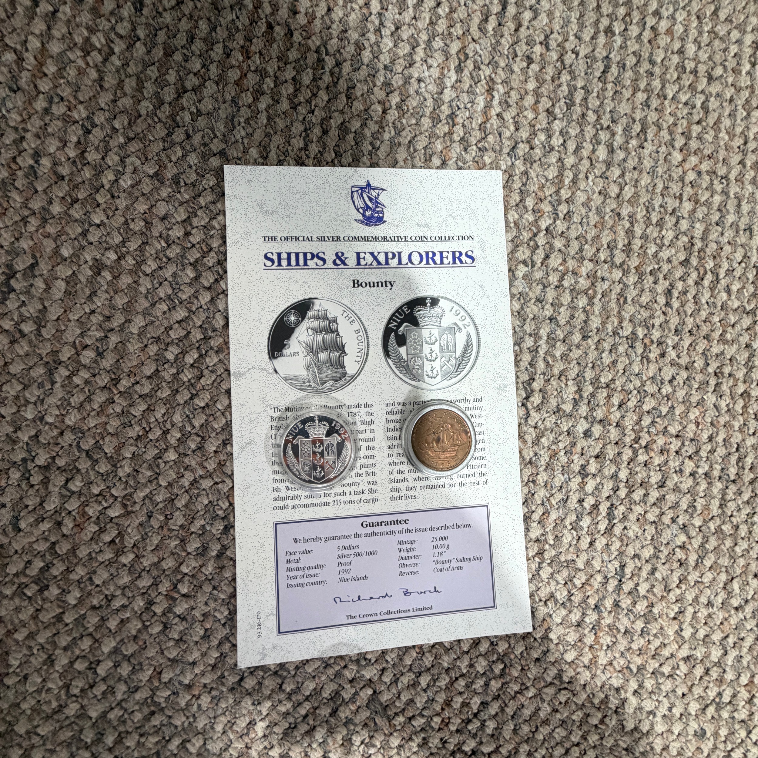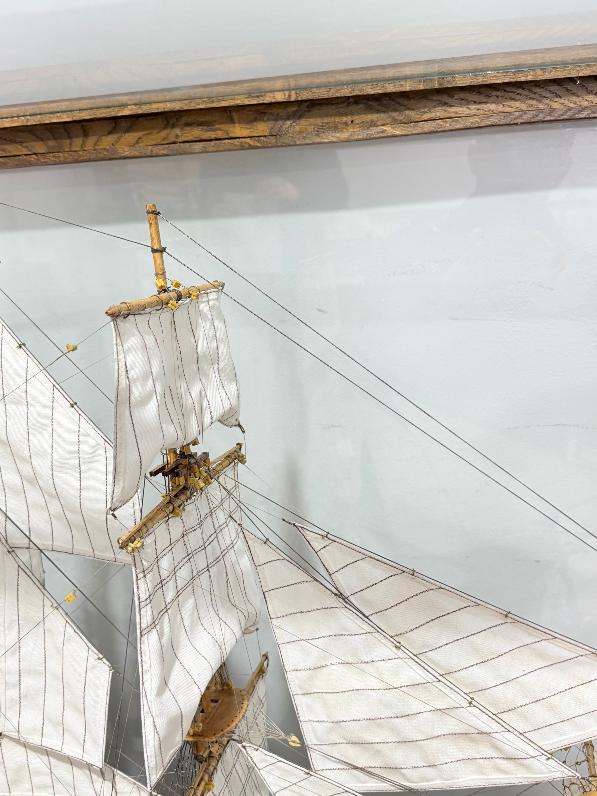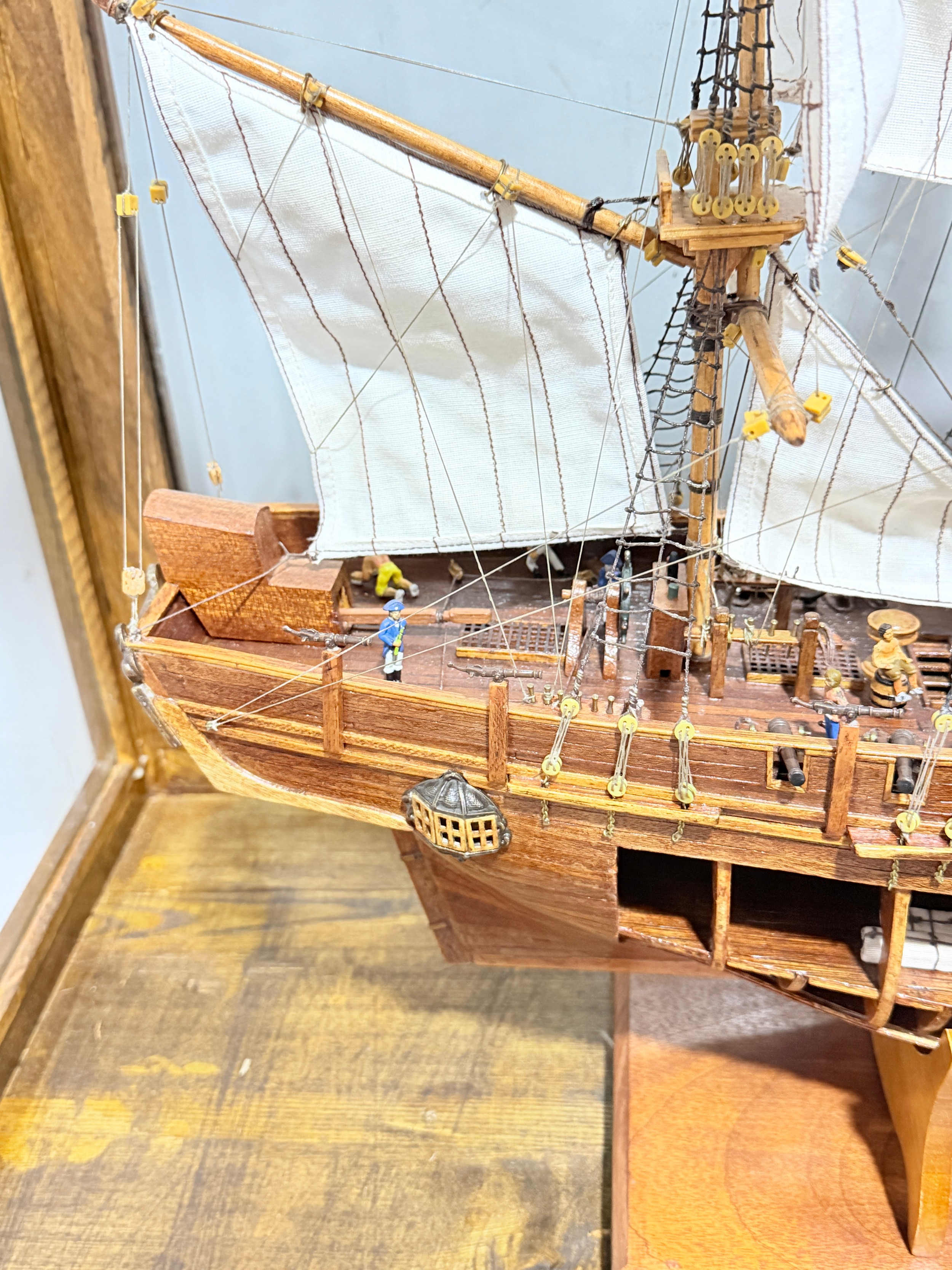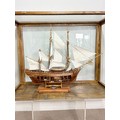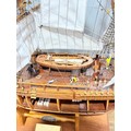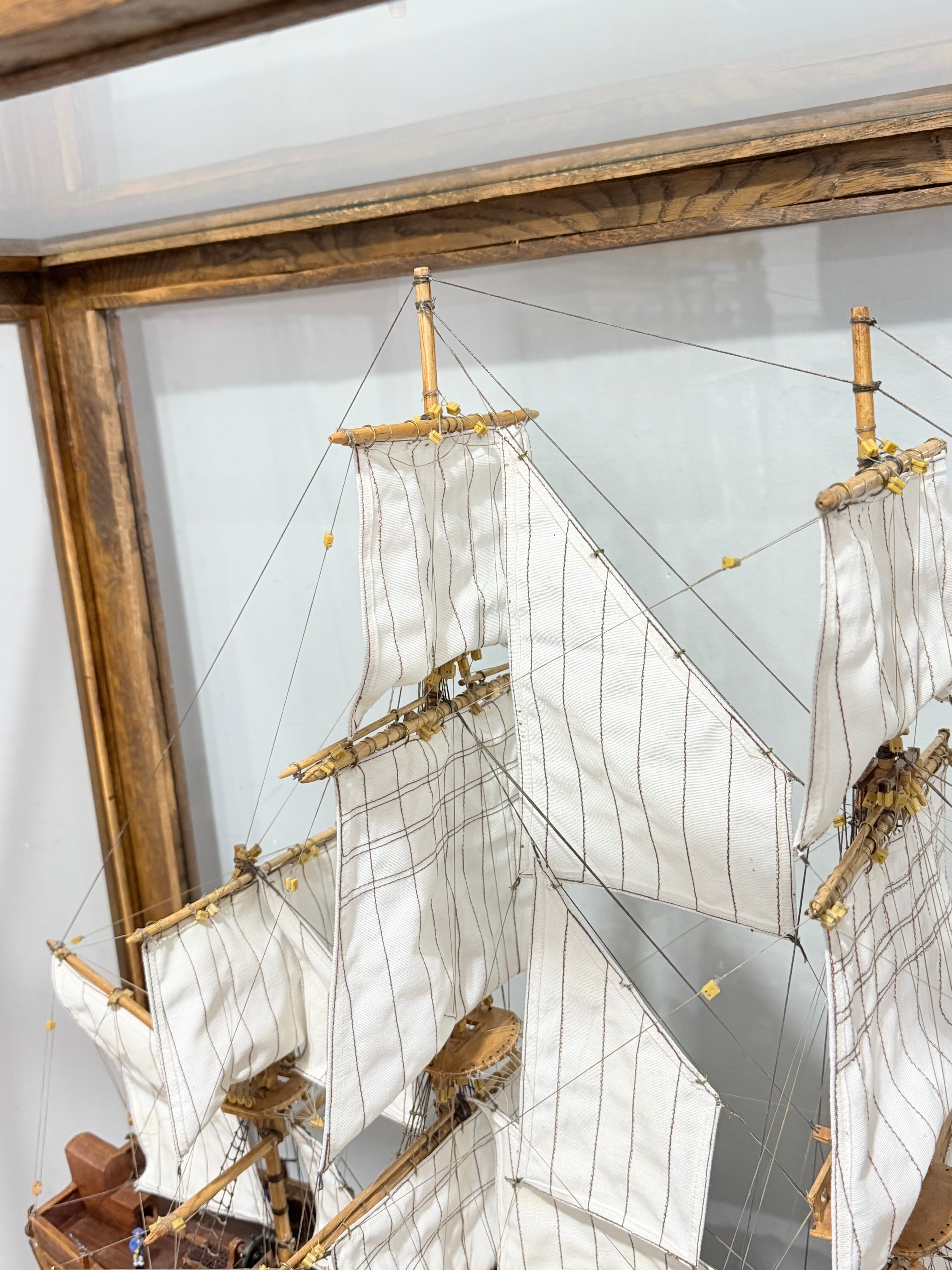 A scratch-built model of the H.M.S Bounty, built by H.J Brabham, 2000, housed in an oak glazed Case, together with a 1992 'Ships & Explorers, Bounty' coin from The official silver commemorative coin Collection, a half penny 1965, and related provenance, (ship) W 90 cm x H 75 cm x D 22 cm, (case) W 105 cm x H 83 cm x D 22 cm. This ship proudly came in at second place in the Fleet Air Arm Museum model show of 2002.
