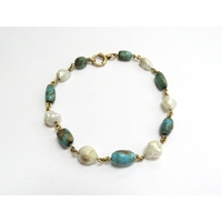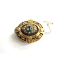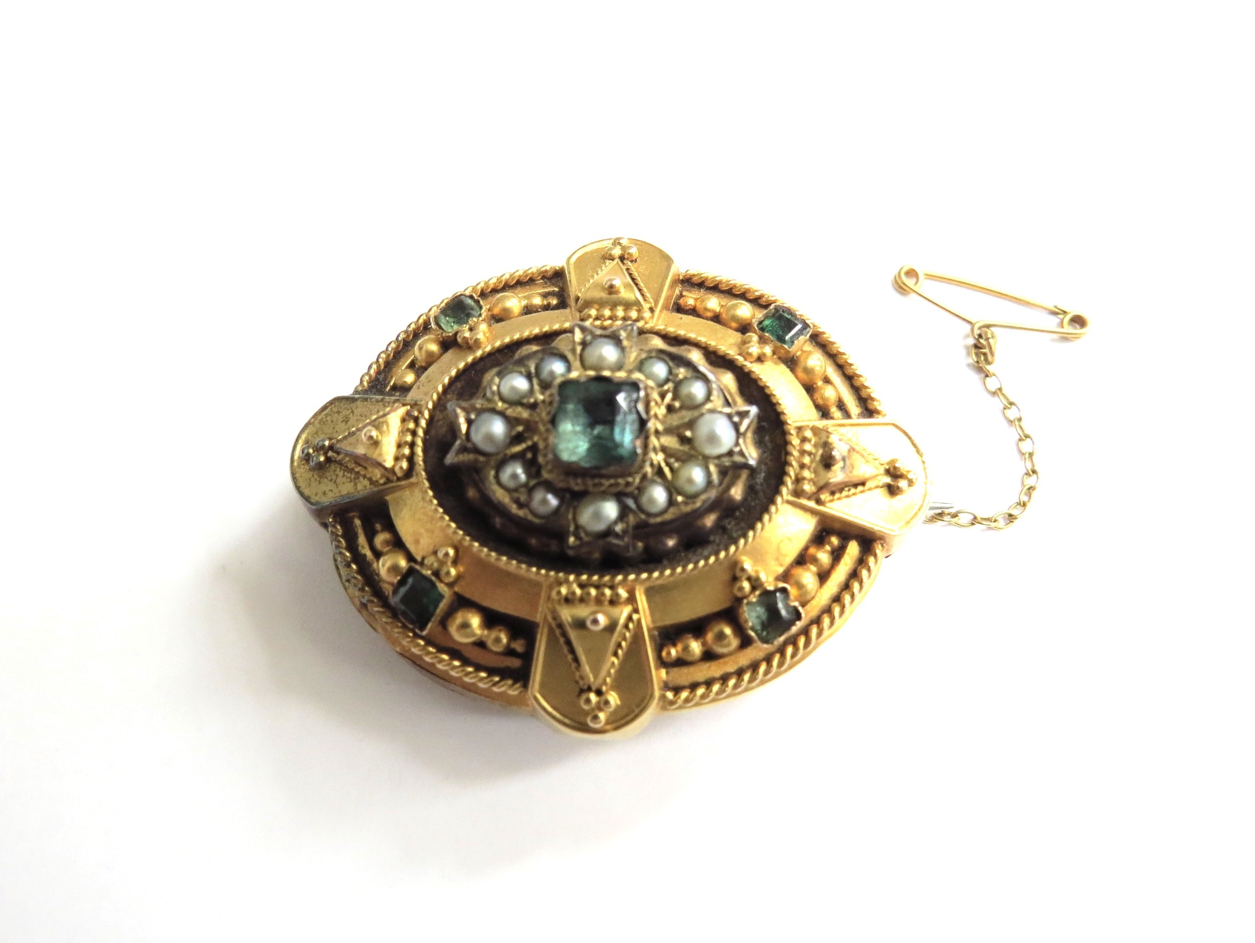 A Victorian/Edwardian memorial brooch, set with seed pearl and green stones, unmarked, glass back missing