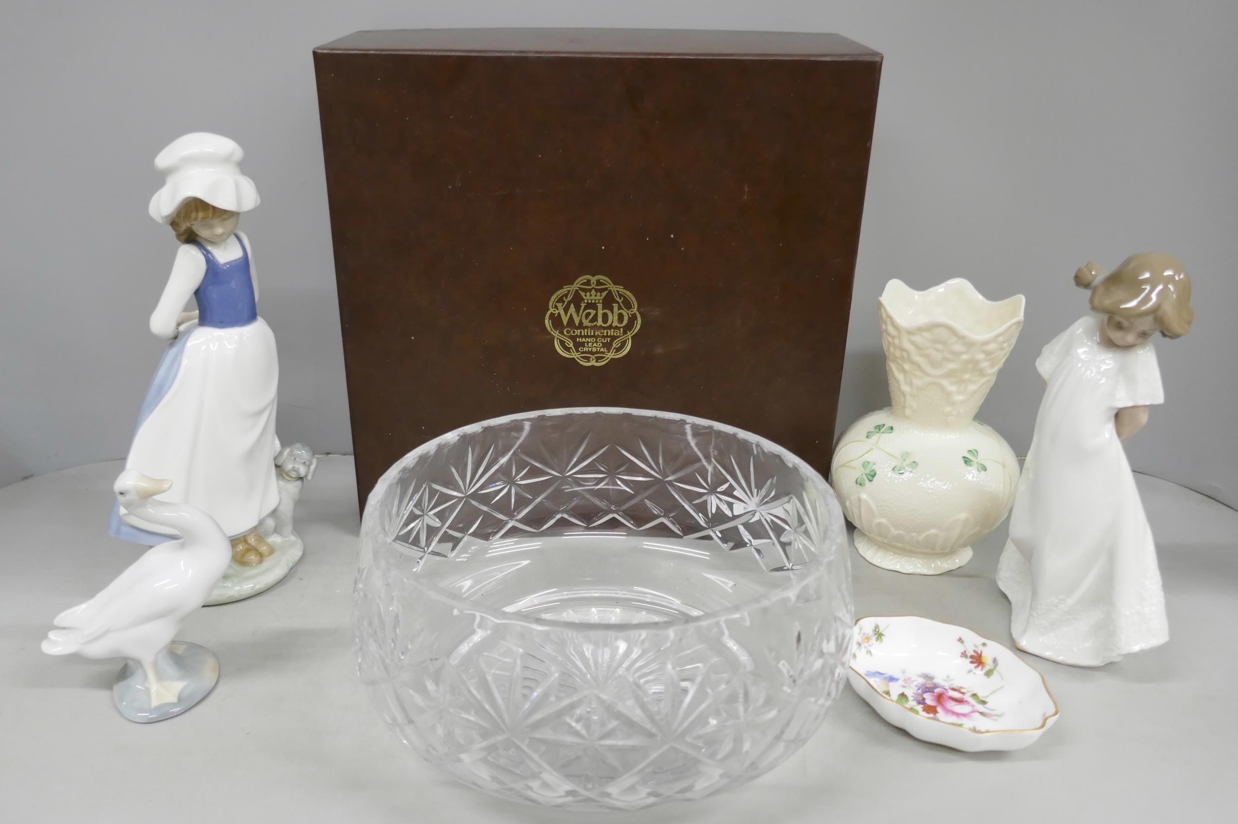 A Belleek vase, a Lladro model goose, two Nao figures, a Derby Posies dish and a boxed Webb crystal glass bowl