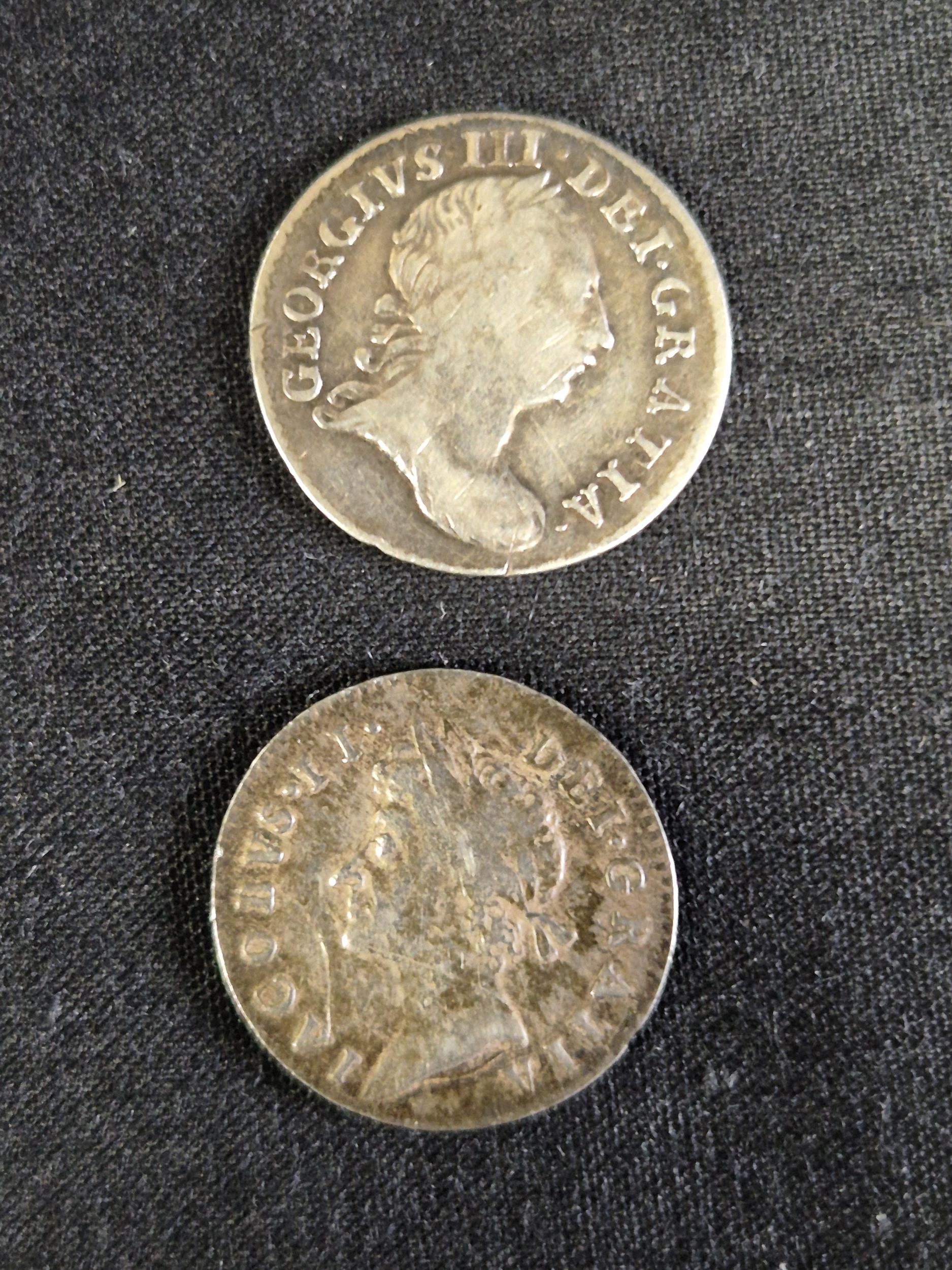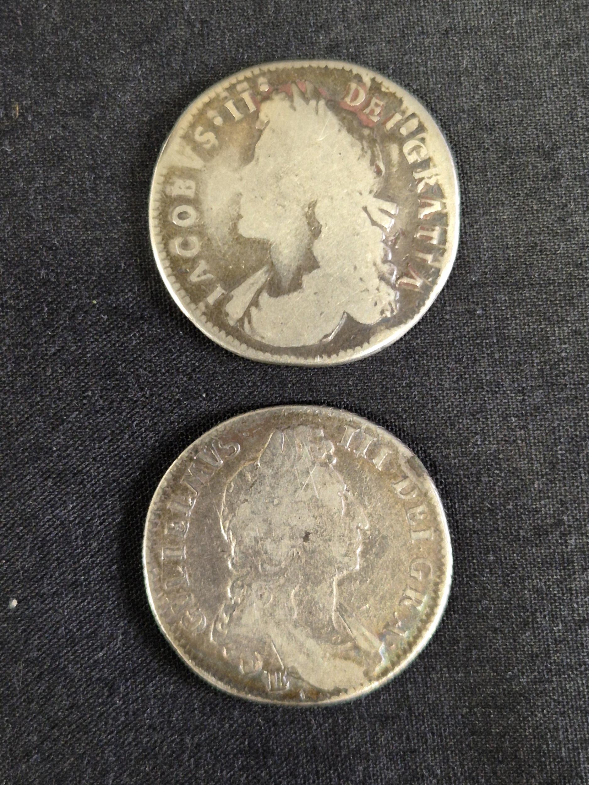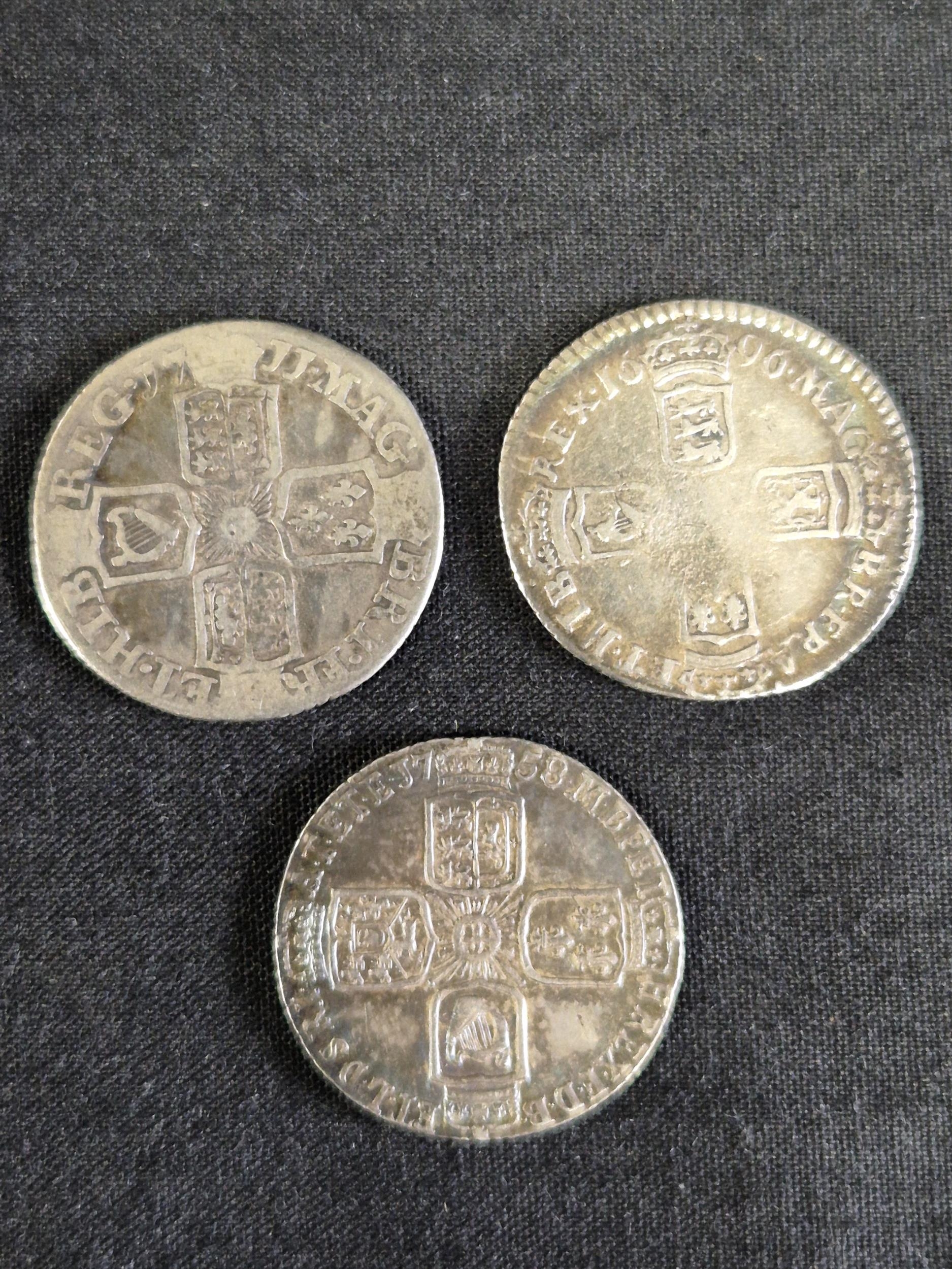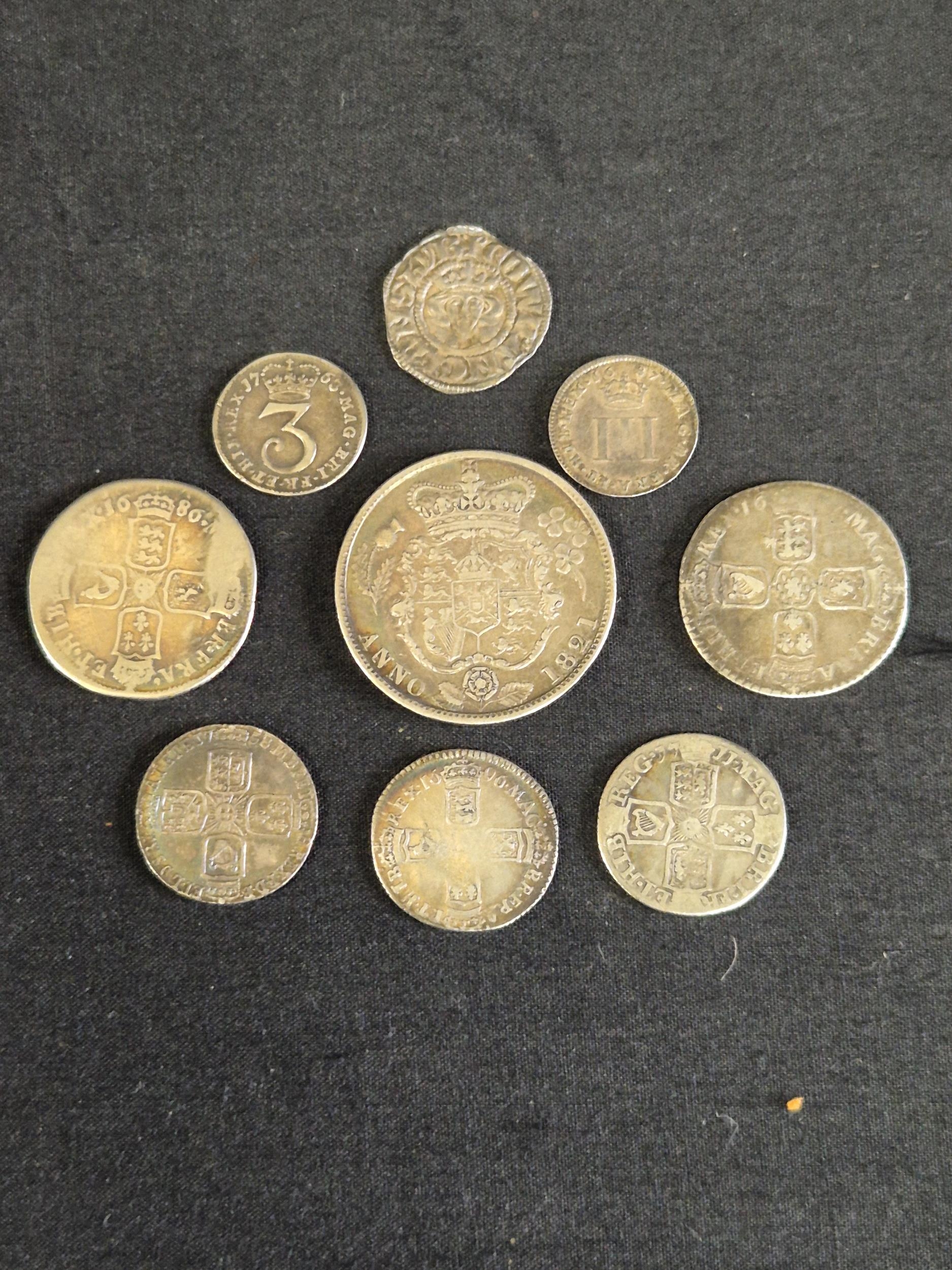 Group of nine silver pre decimal coins to include: George III 1821 Half Crown, George III 1763 3d, James II 1687 3d, George II 1758 Sixpence, George III 1696 Sixpence, James II 1686 Shilling and two other milled and one hammered coins