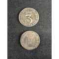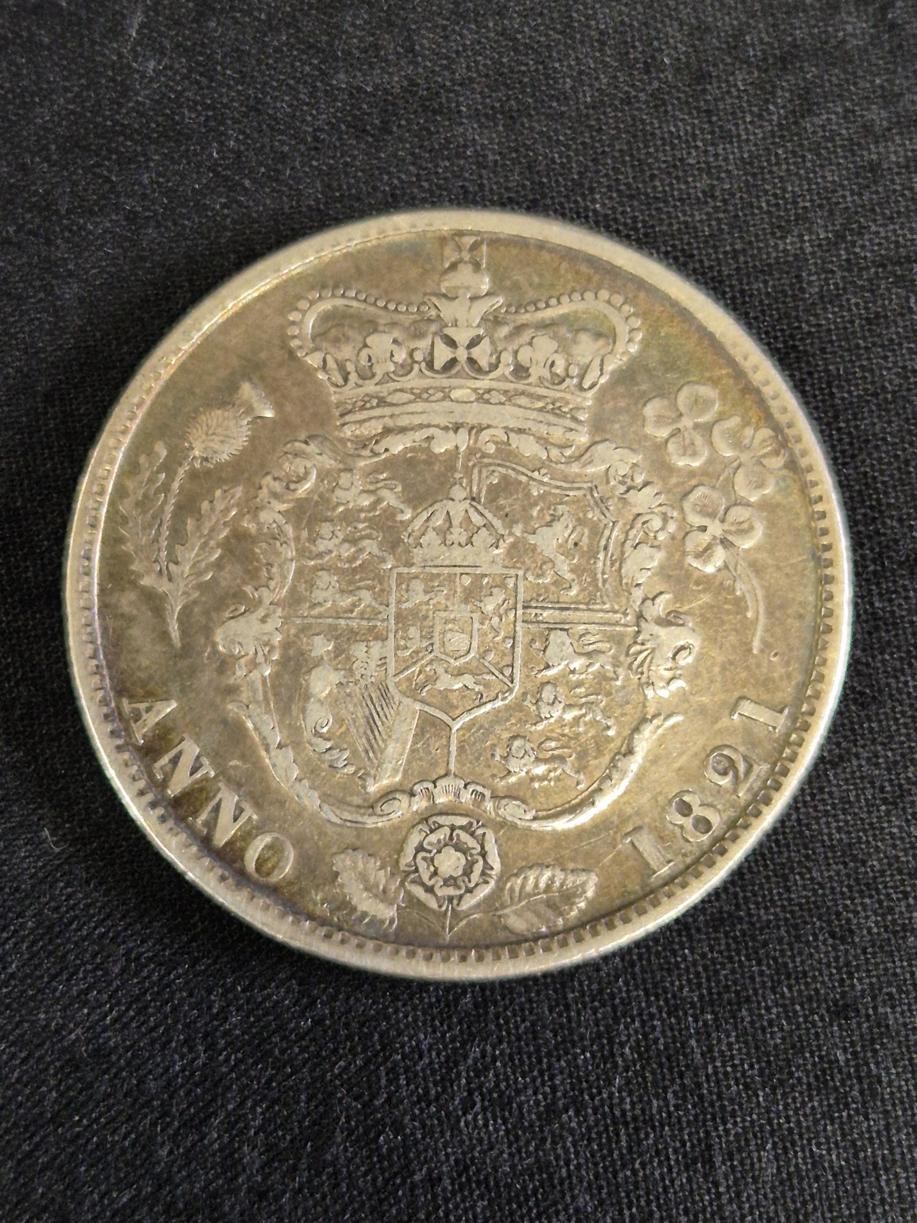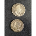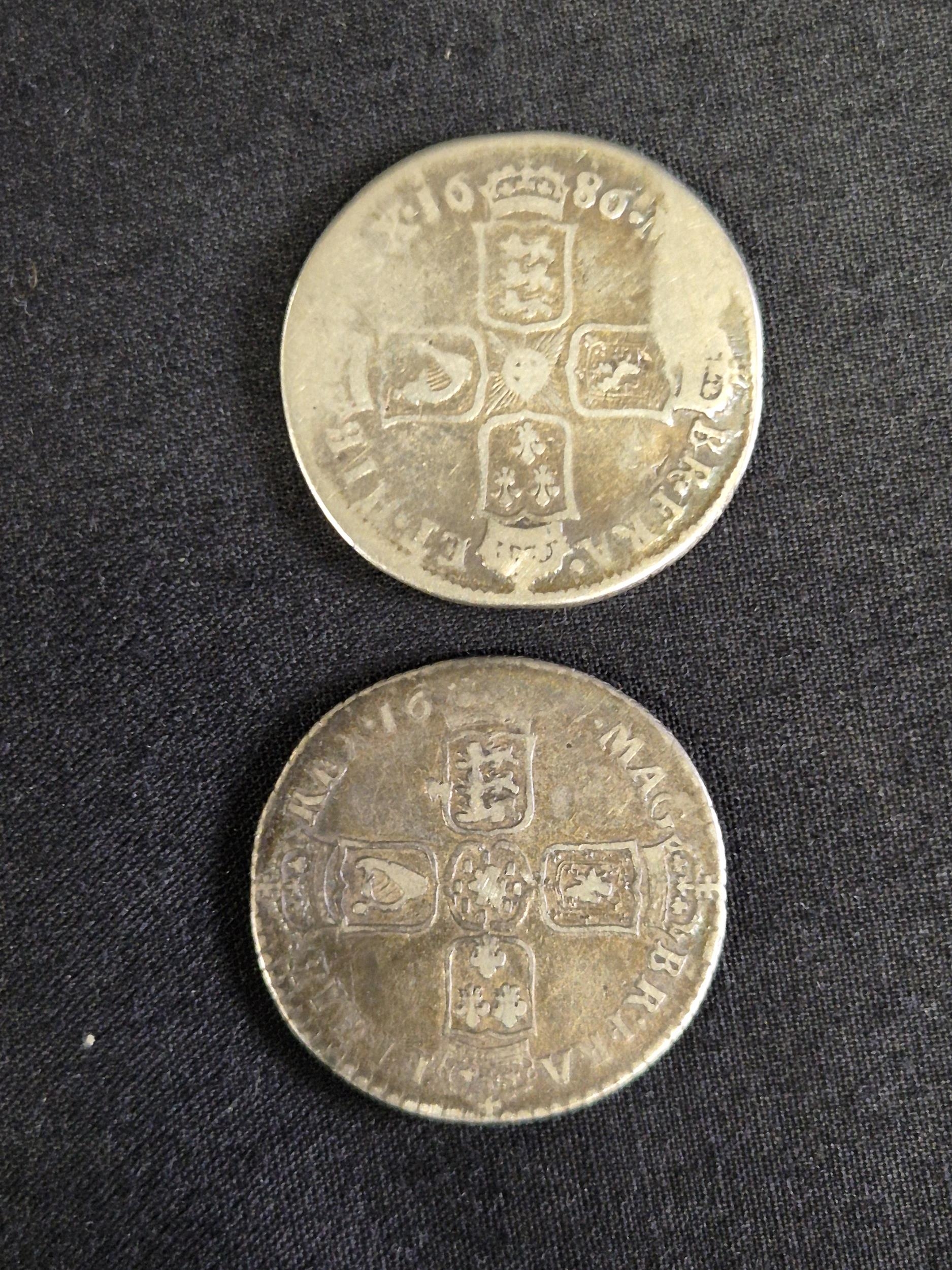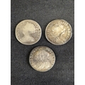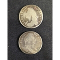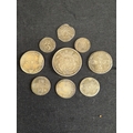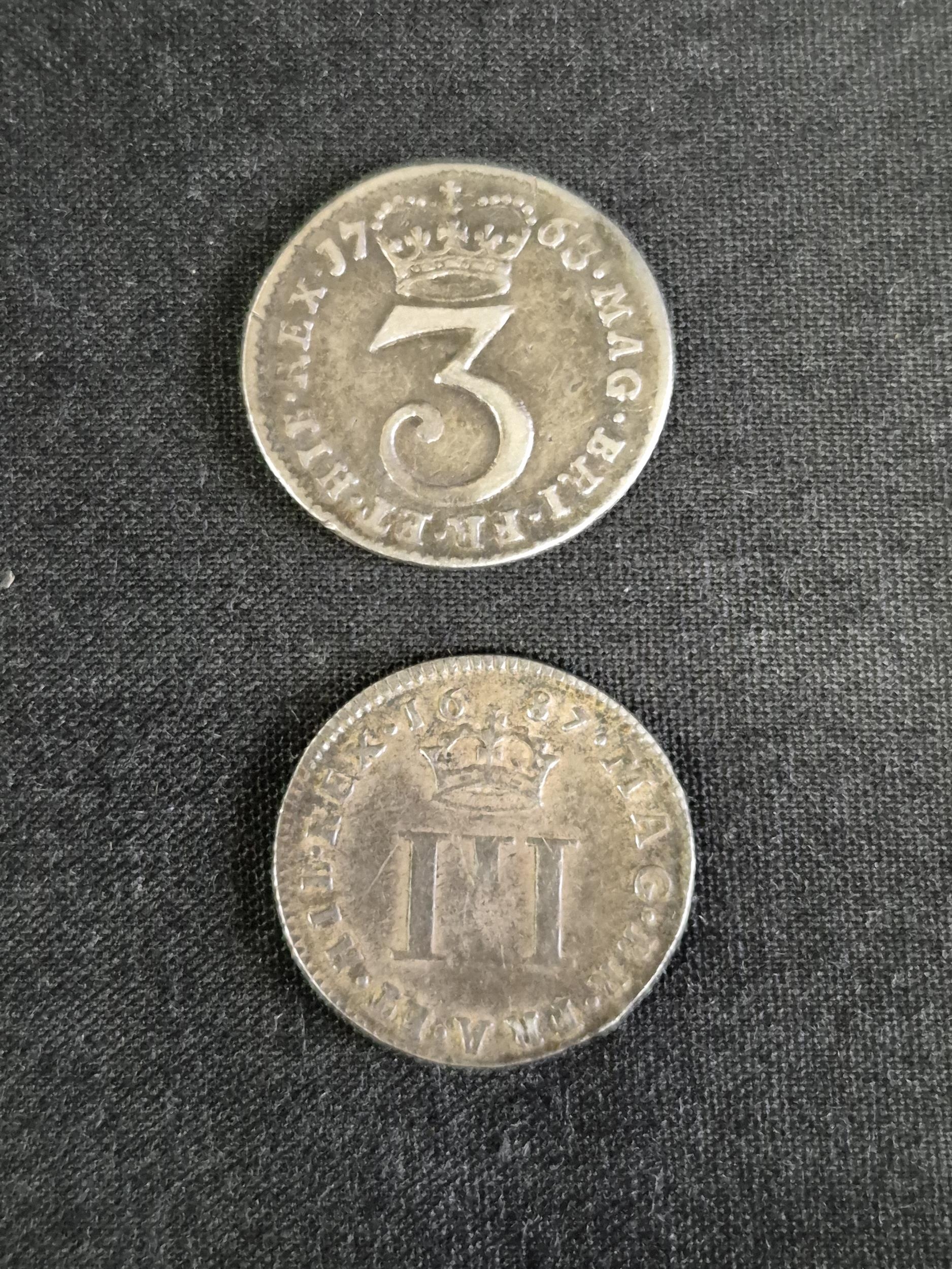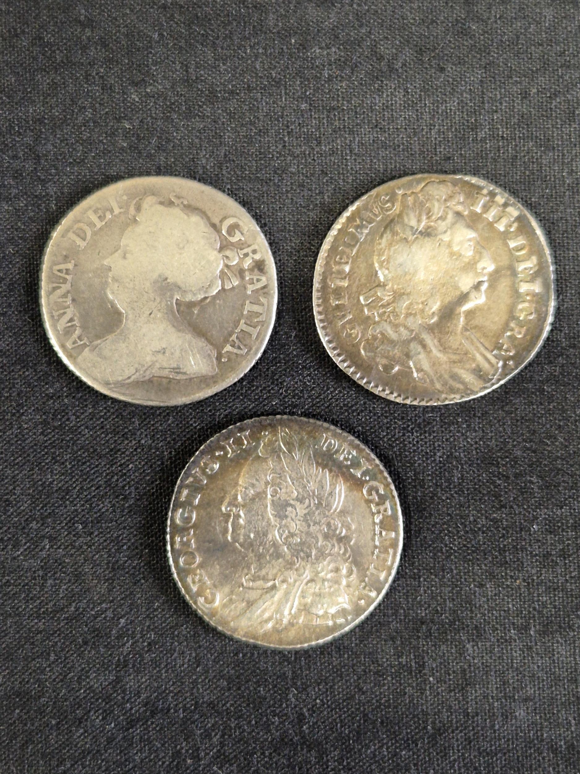 Group of nine silver pre decimal coins to include: George III 1821 Half Crown, George III 1763 3d, James II 1687 3d, George II 1758 Sixpence, George III 1696 Sixpence, James II 1686 Shilling and two other milled and one hammered coins