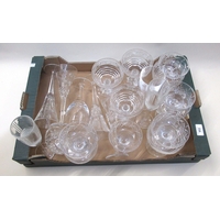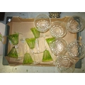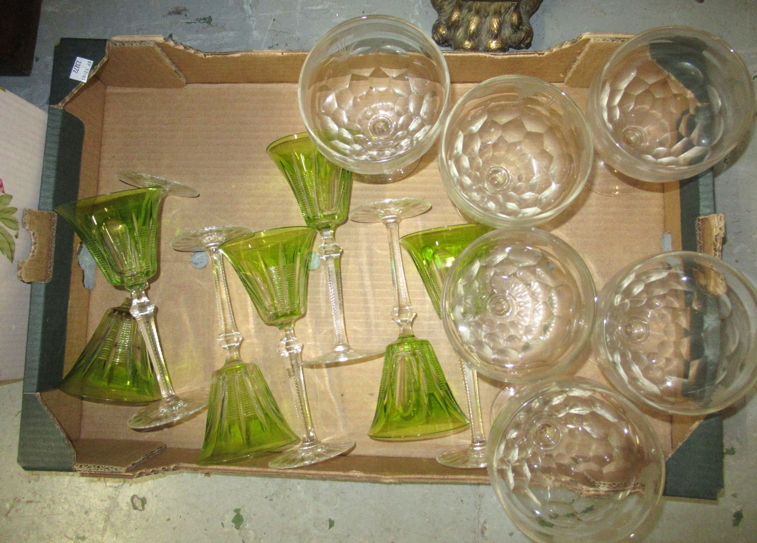 Set of seven green overlay glass goblets, together with a set of six good quality cut glass pedestal sundae dishes