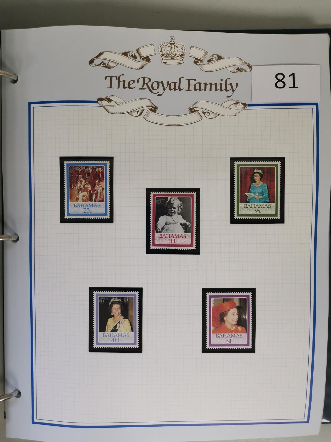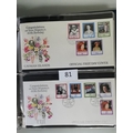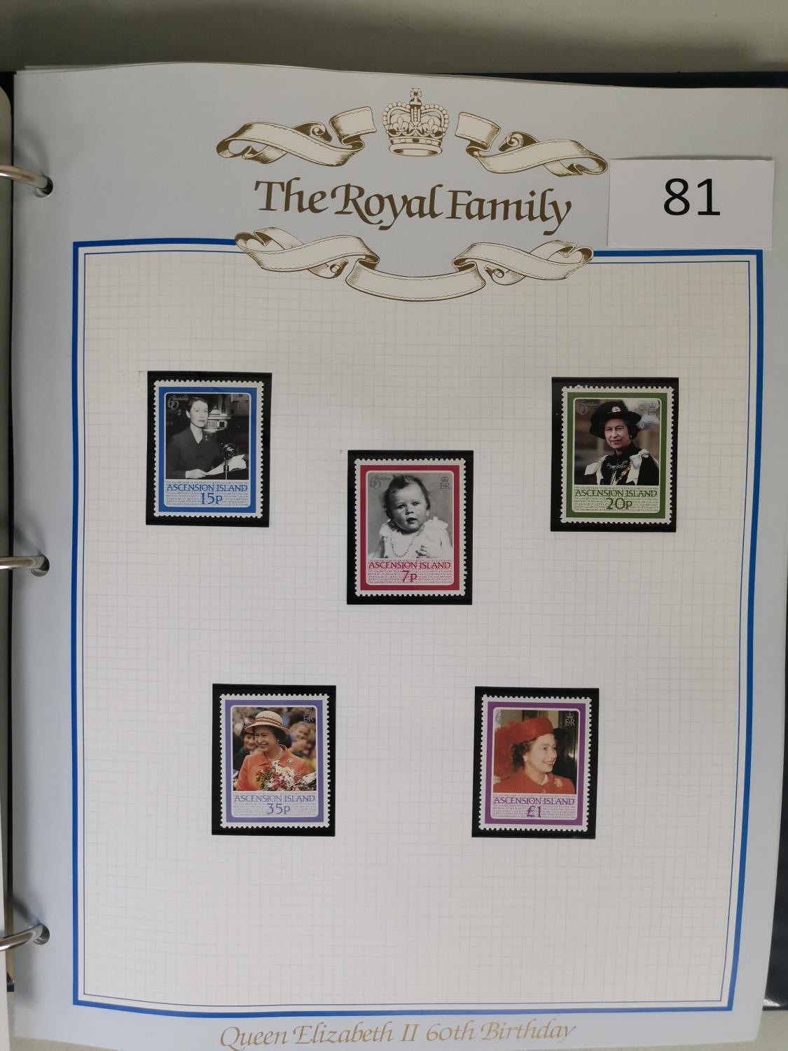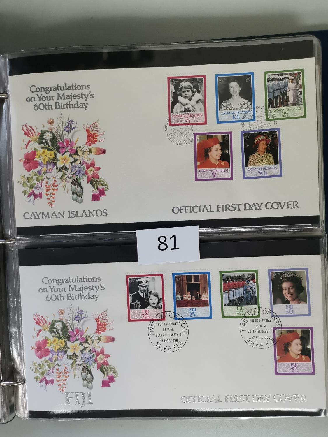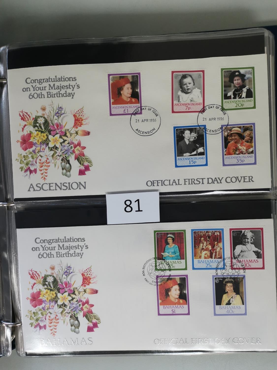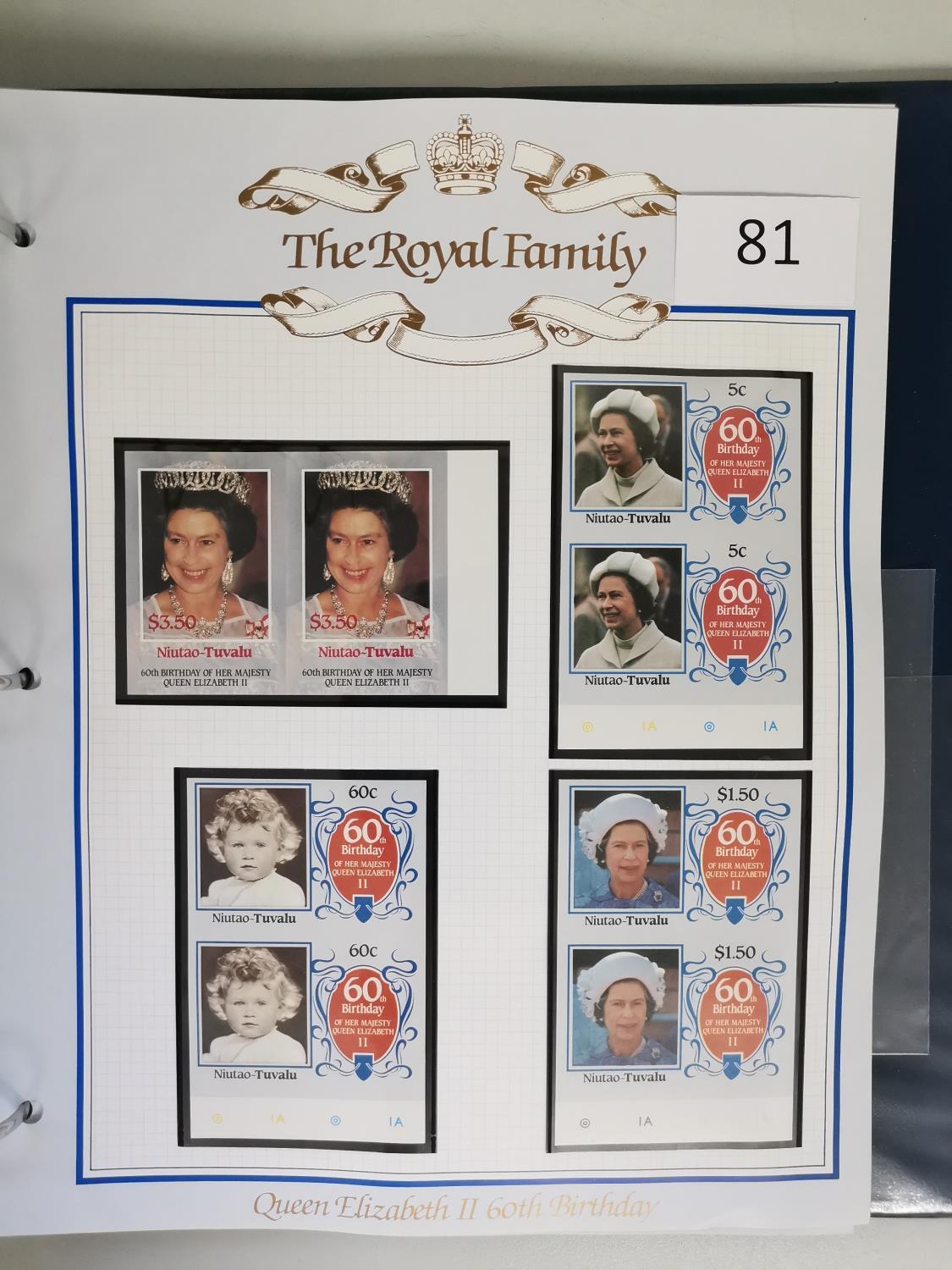 MIXED WORLD. 1986 QE 60th BIRTHDAY. Comprehensive UM collection in special album incl. SPECIMEN sets m/s's and 8 imperf pairs and a further volume of FDC's for the issue.(approx. quantity 330 + 40 m/s's and 92 FDC's)