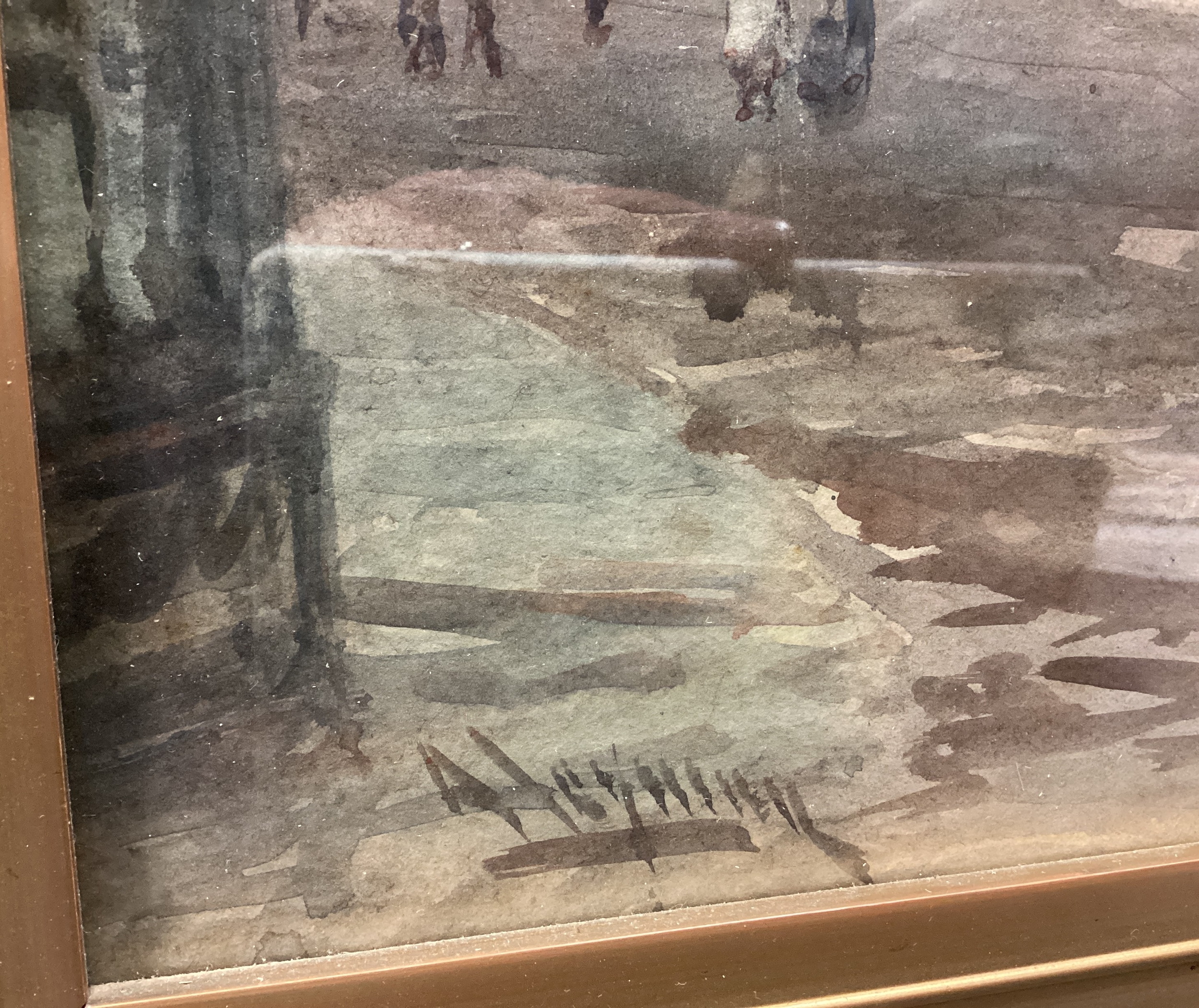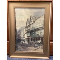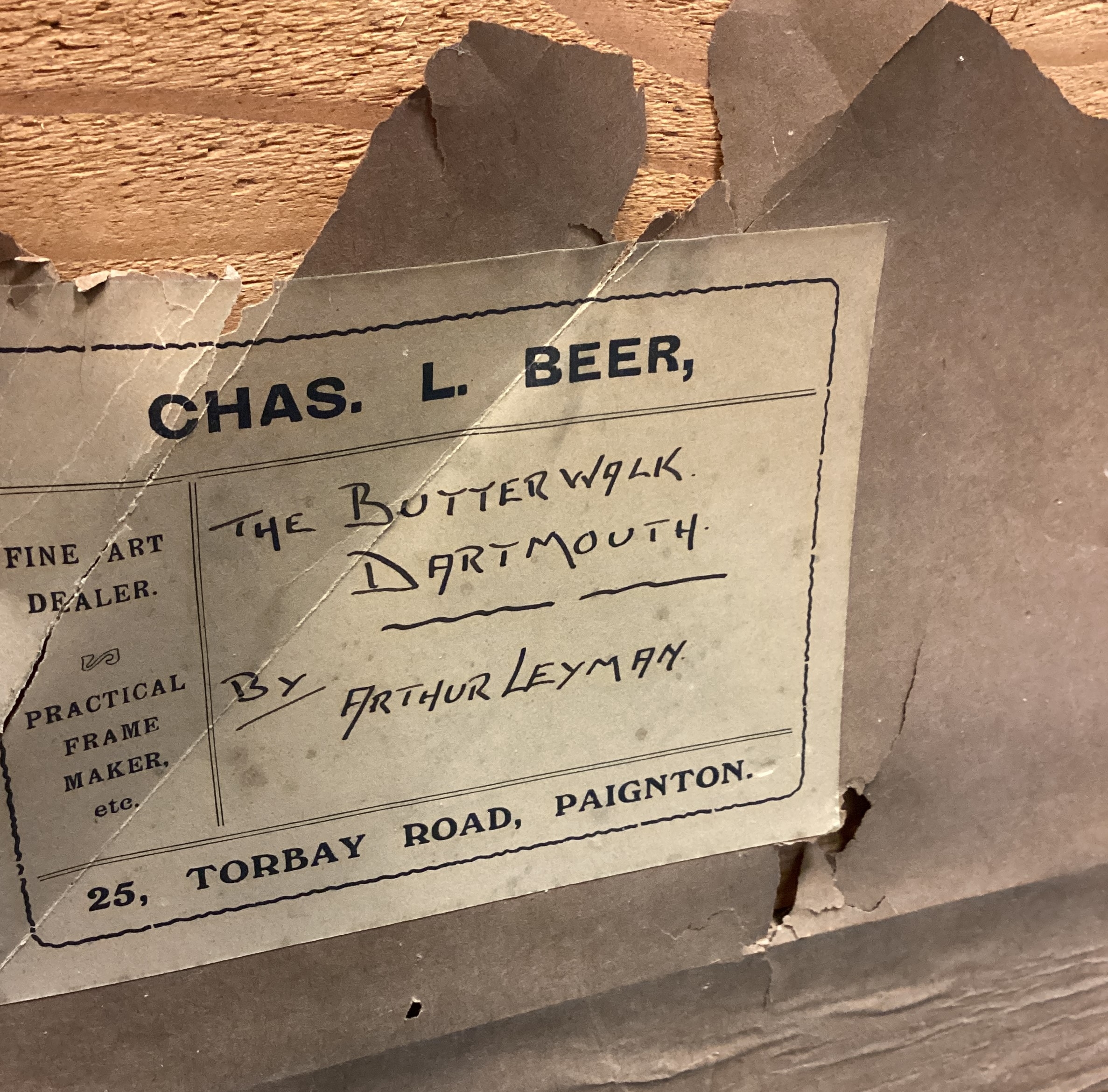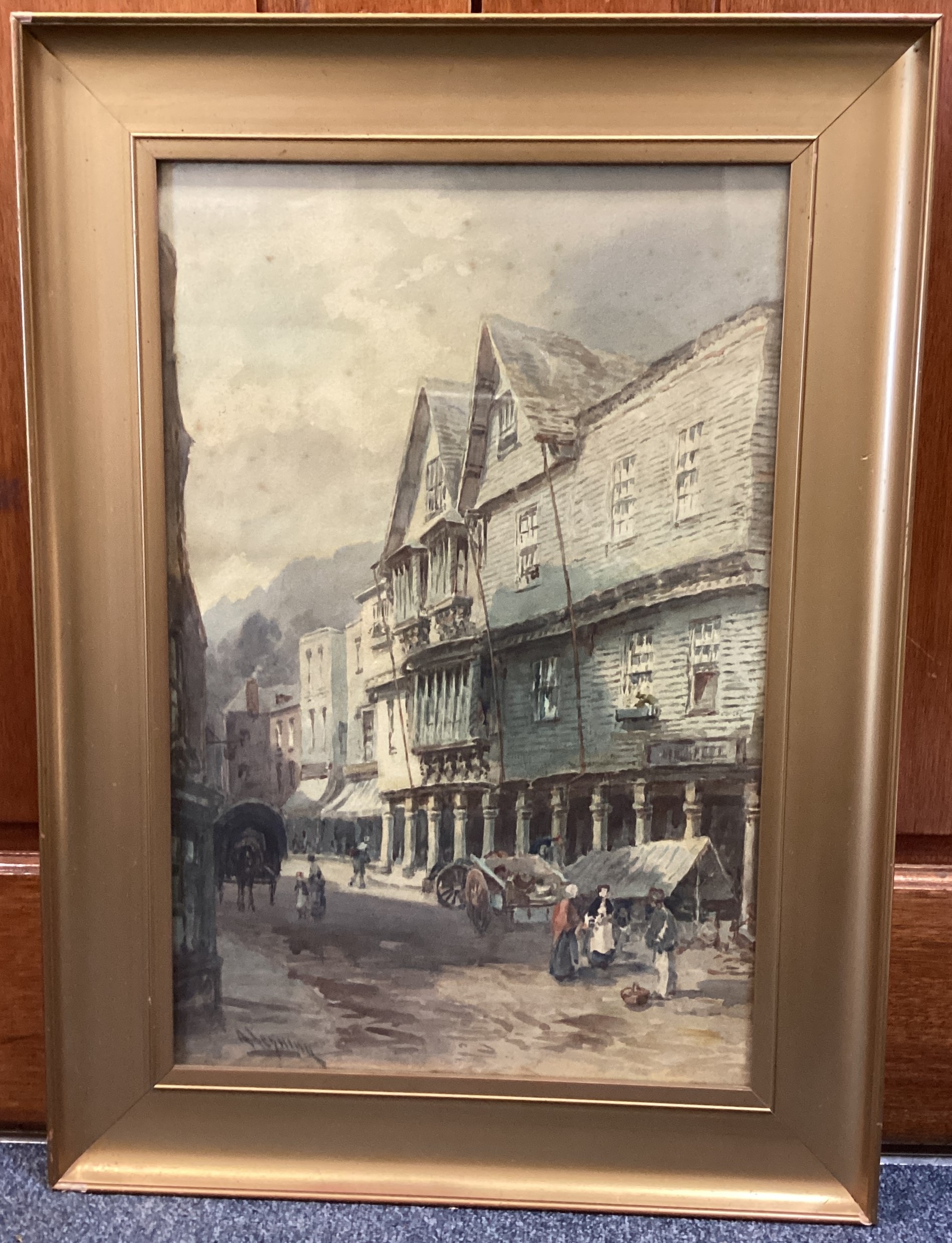 ALFRED LEYMAN: (British, 1856 - 1933): A gilt framed and glazed watercolour entitled 'The Butterwalk, Dartmouth' depicting a Dartmoor town street scene. Signed to bottom left. Labelled verso. Approx. 35 cm x 53.5 cm (ss). Est. £100 - £150.