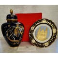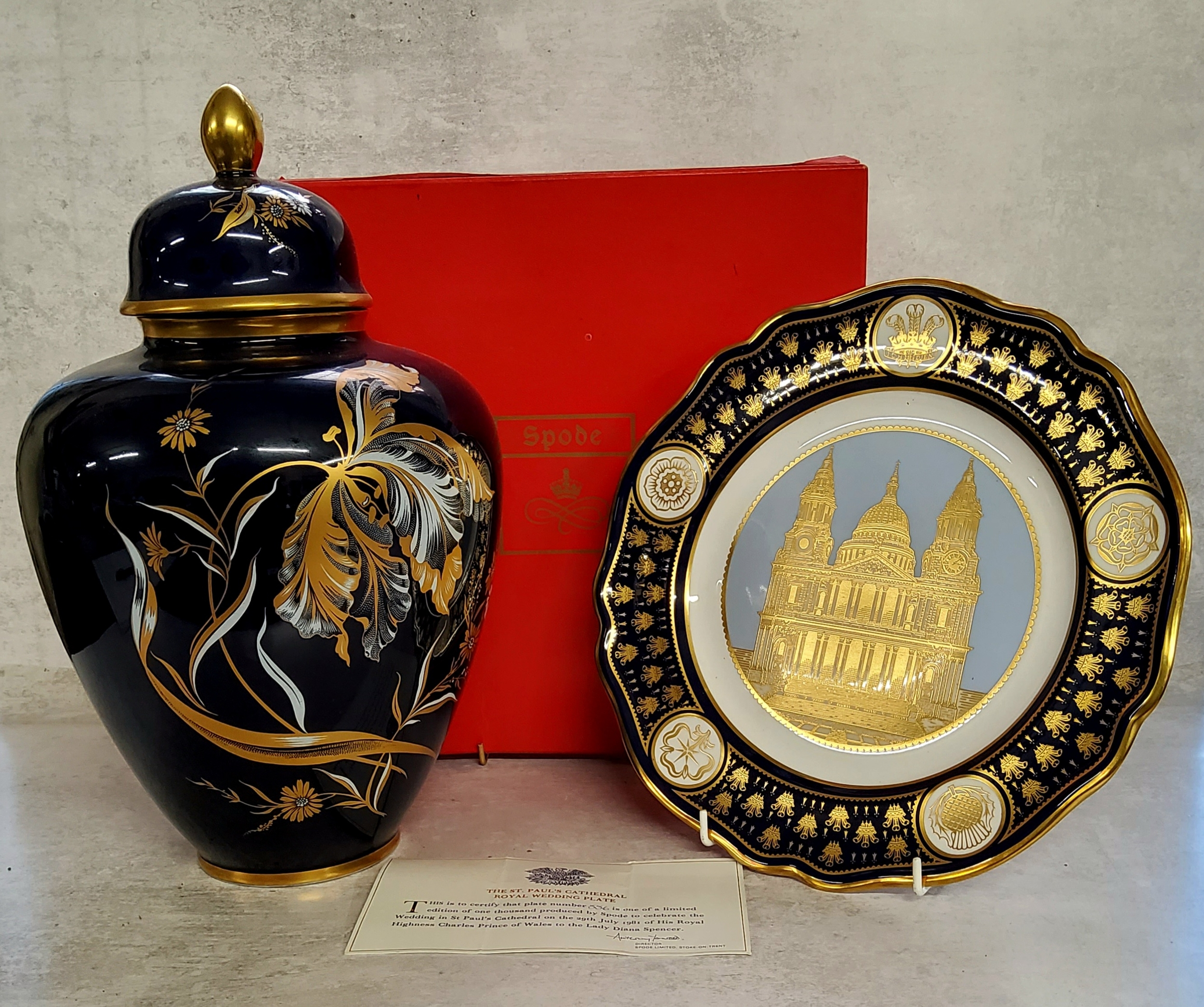 Decorative Ceramics - a Spode limited edition The St. Paul's Royal Wedding cabinet plate, no.836/1,000, boxed with certificate; a Jaeger Ceramics urn and cover, cobalt blue ground with gilded flower decoration.(2)