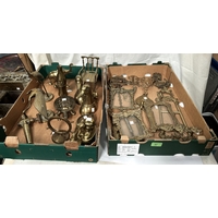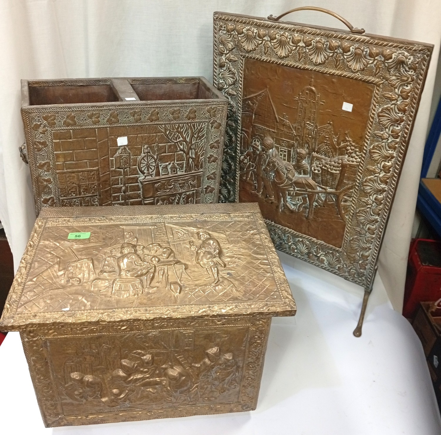 An embossed brass log box and similar firescreen, stick stand etc.