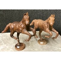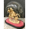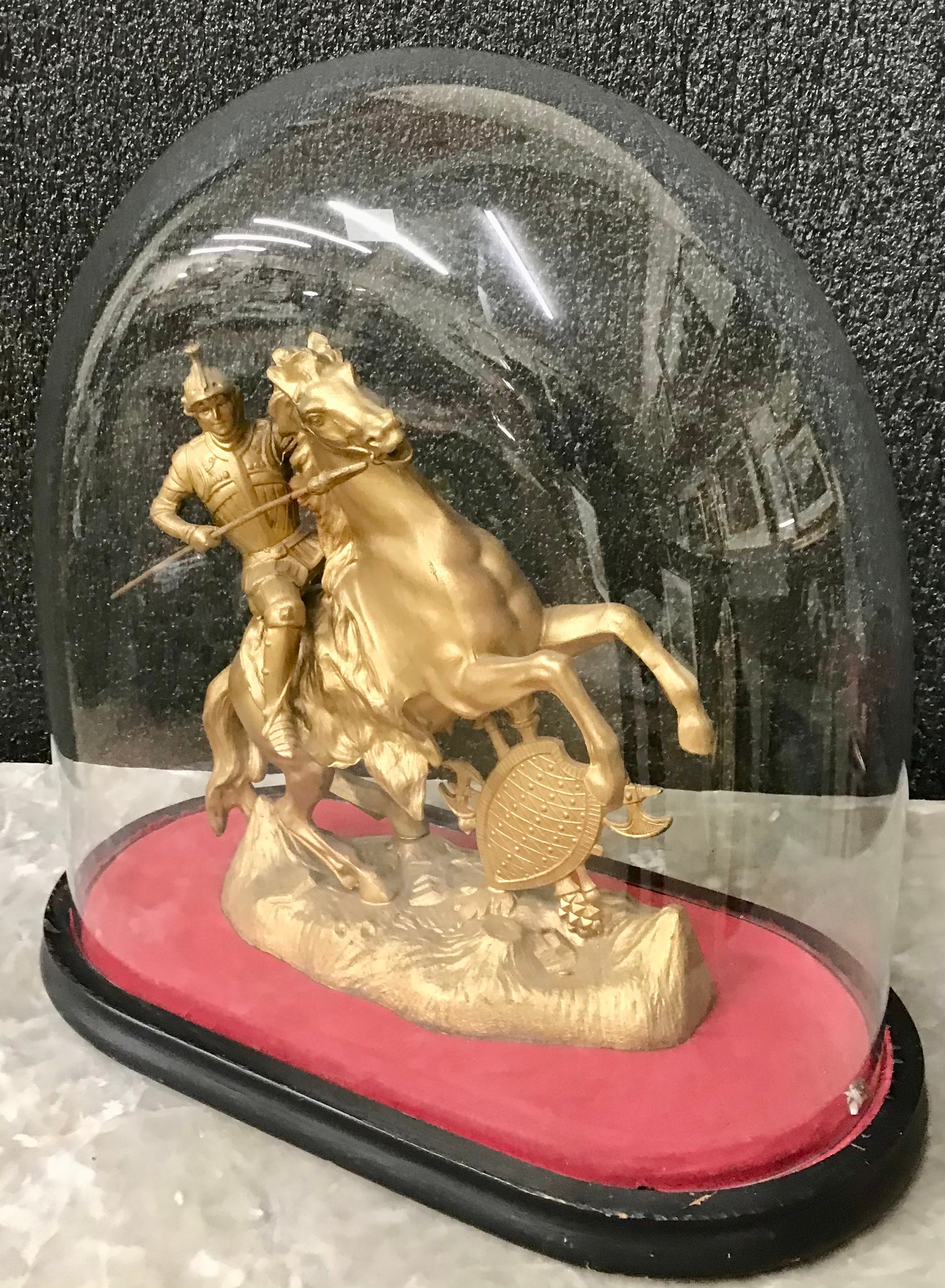 A gilt figure of a soldier on horseback in a Victorian glass dome case