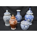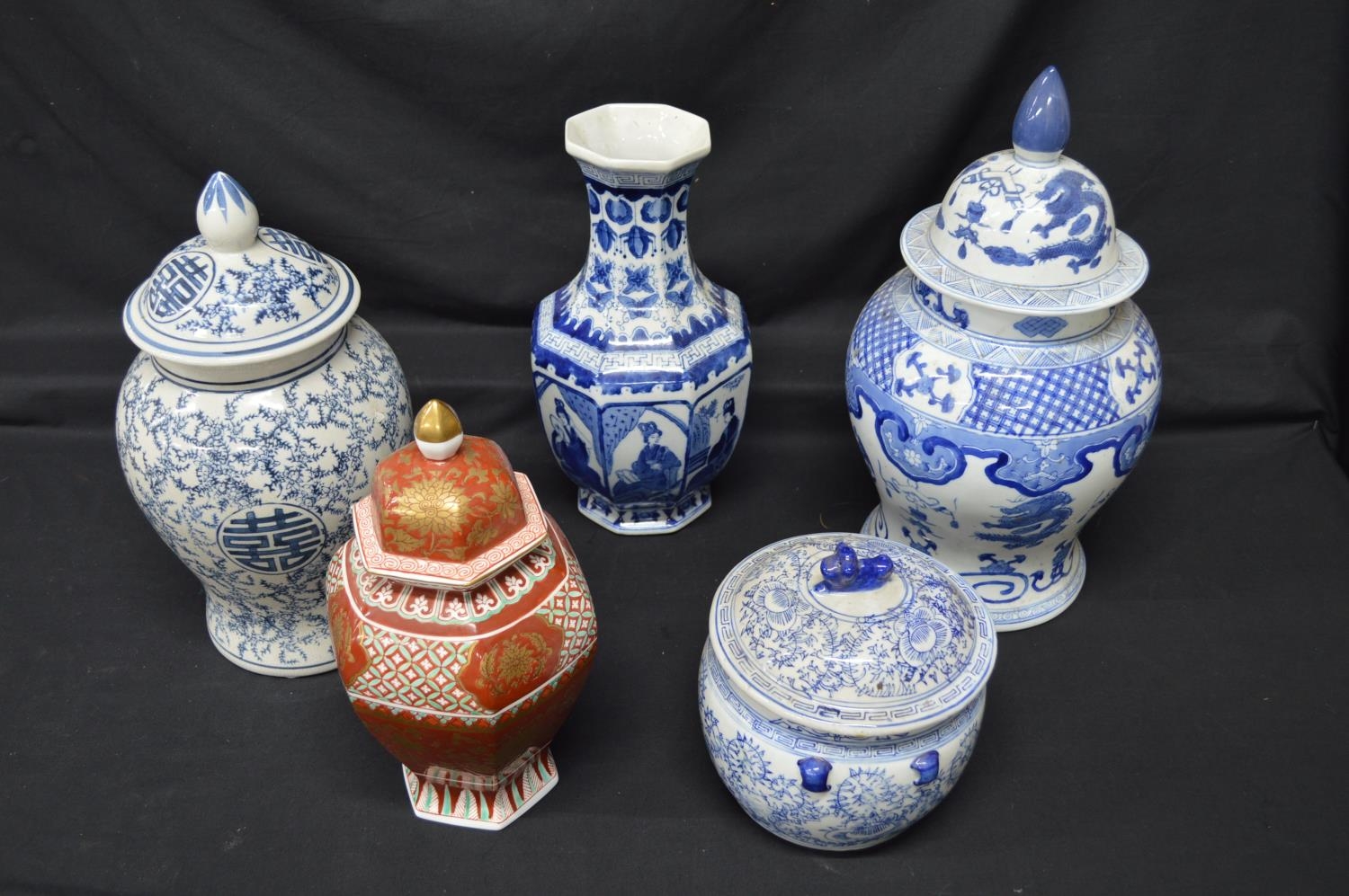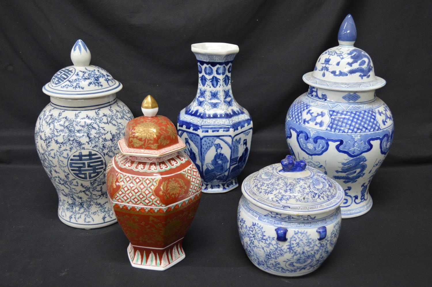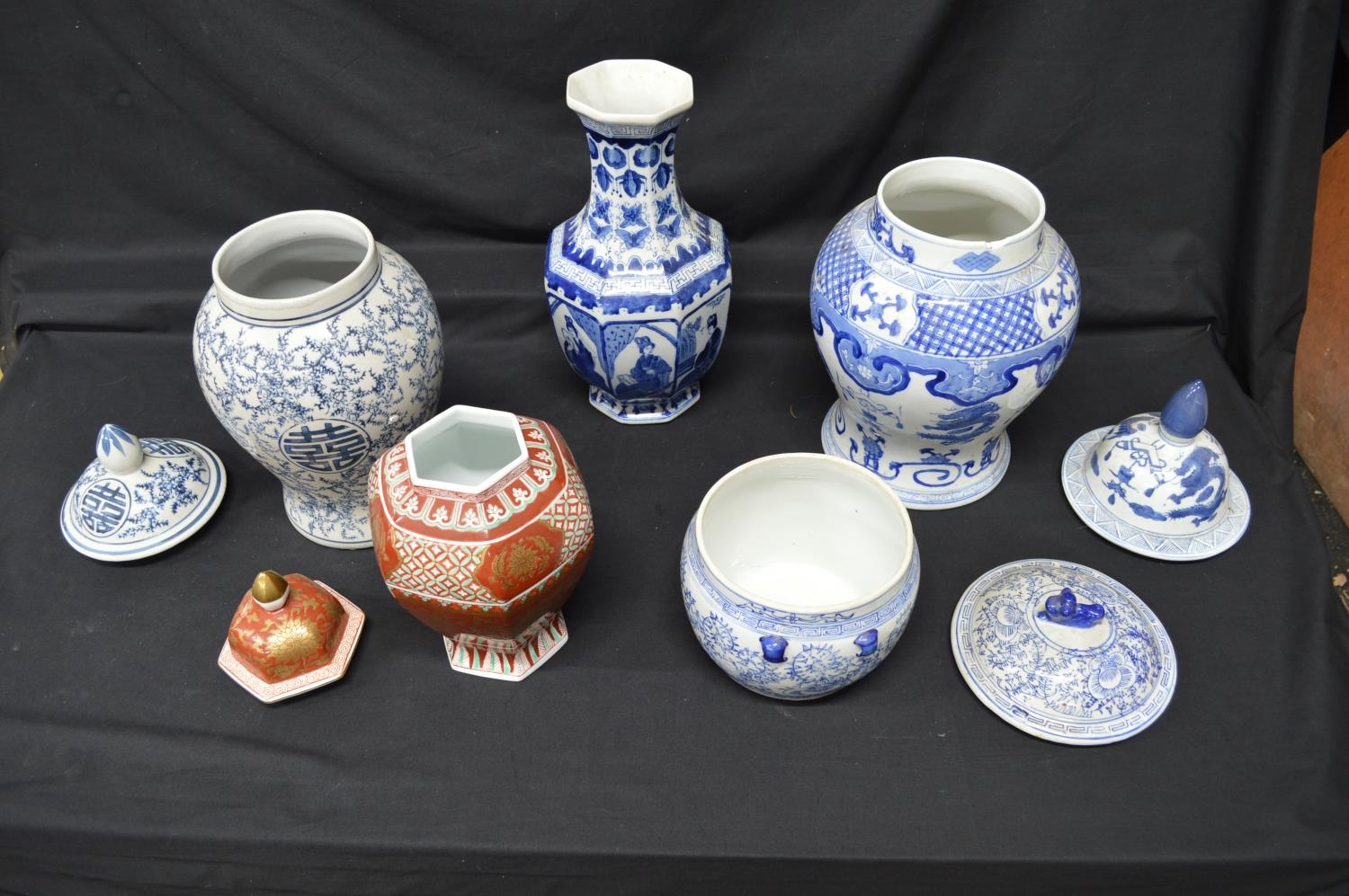 Group of late 20th century Chinese decorated ceramics to comprise: three urns and covers - tallest 17.5" high, bowl and cover - 8.25" tall and octagonal bulbous vase - 14" tall