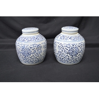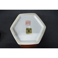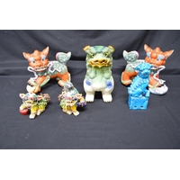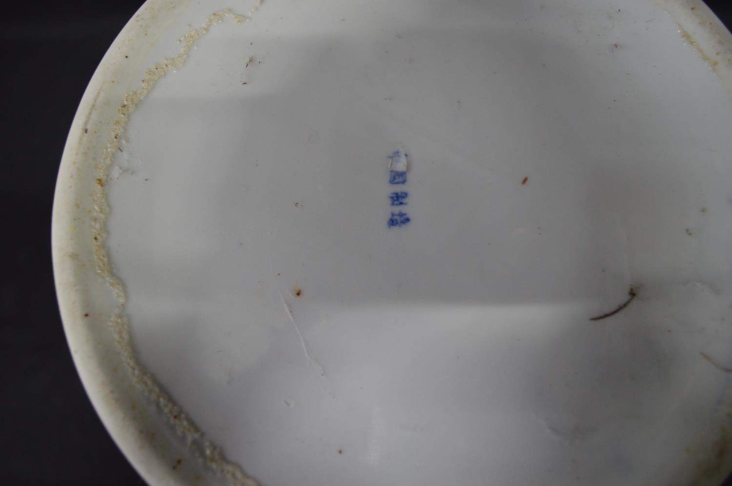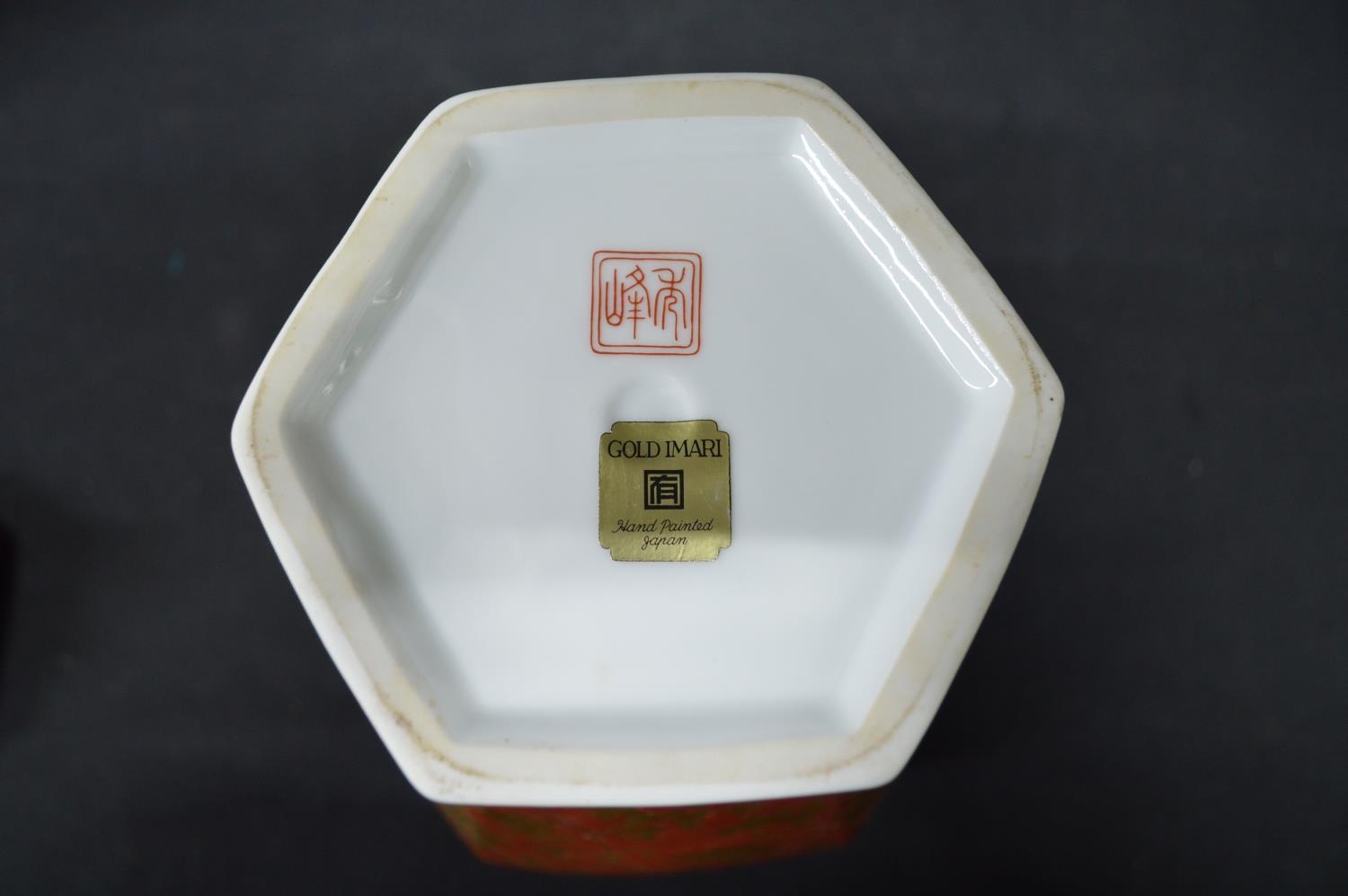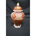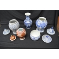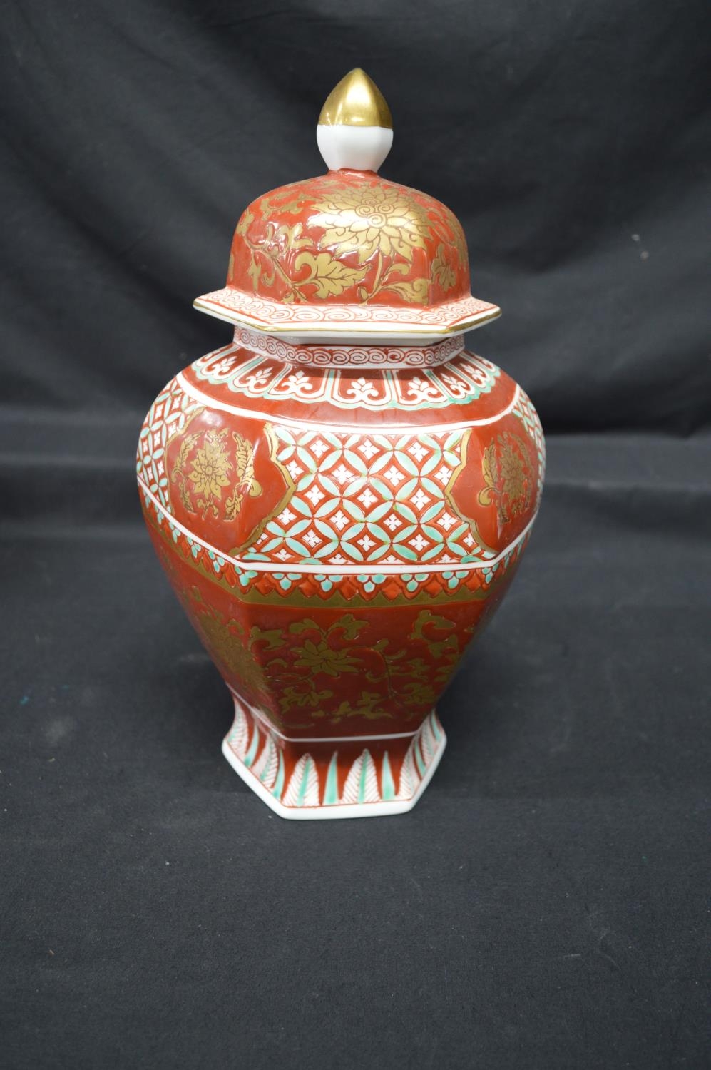 Group of late 20th century Chinese decorated ceramics to comprise: three urns and covers - tallest 17.5" high, bowl and cover - 8.25" tall and octagonal bulbous vase - 14" tall