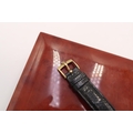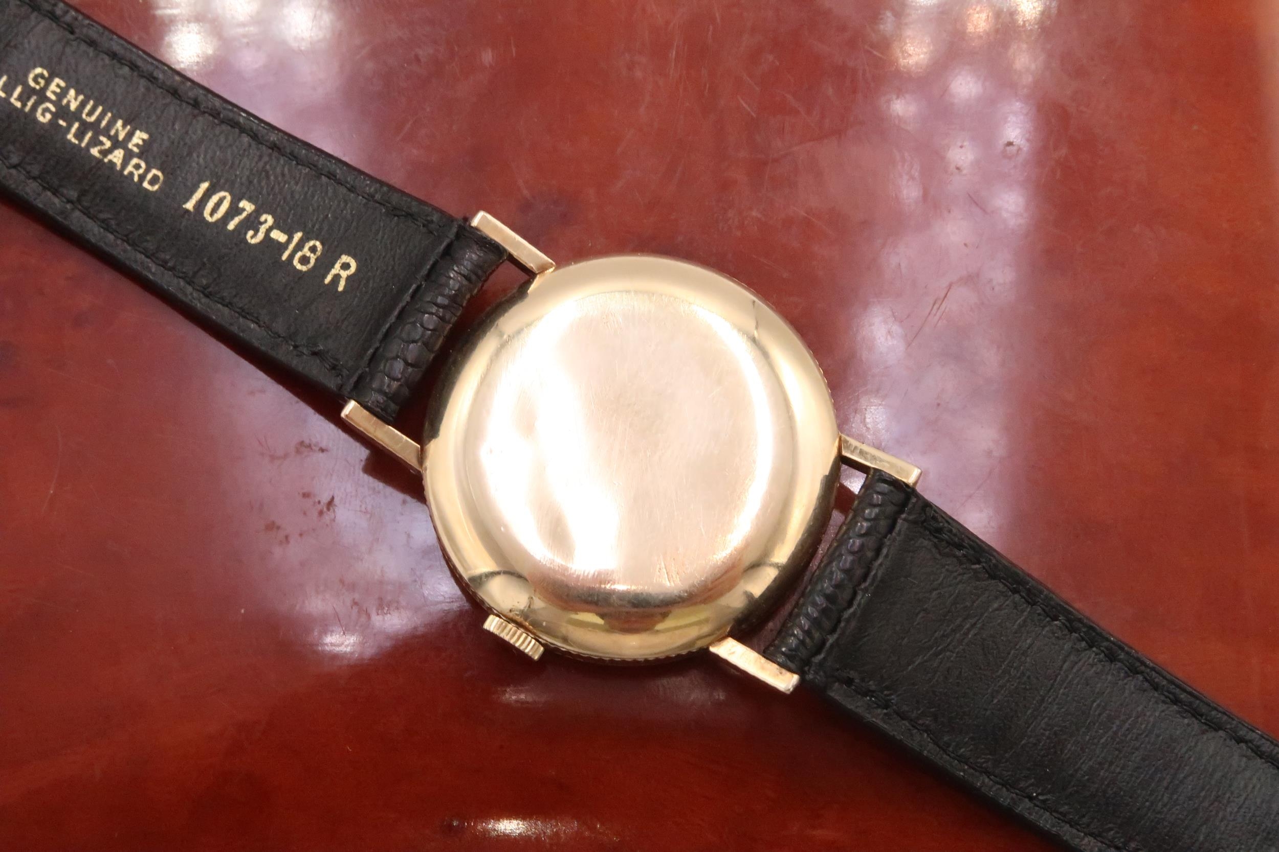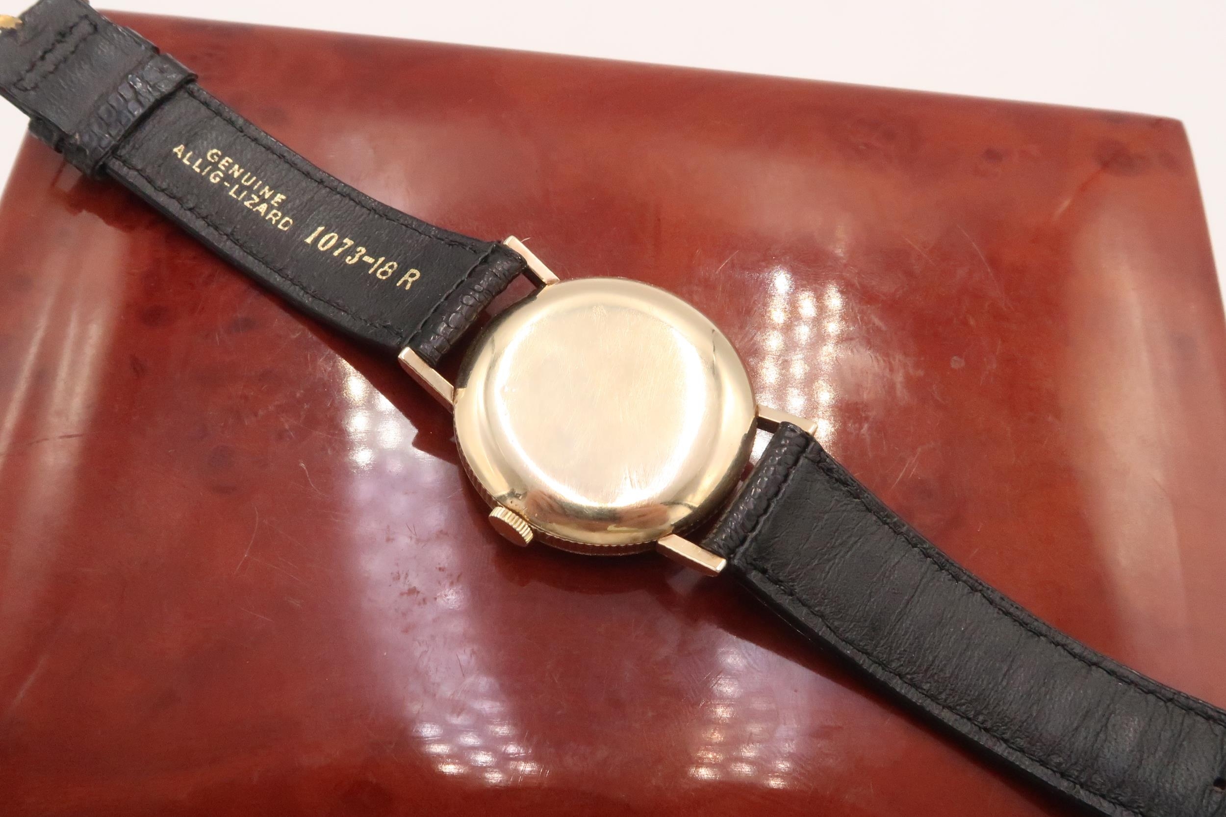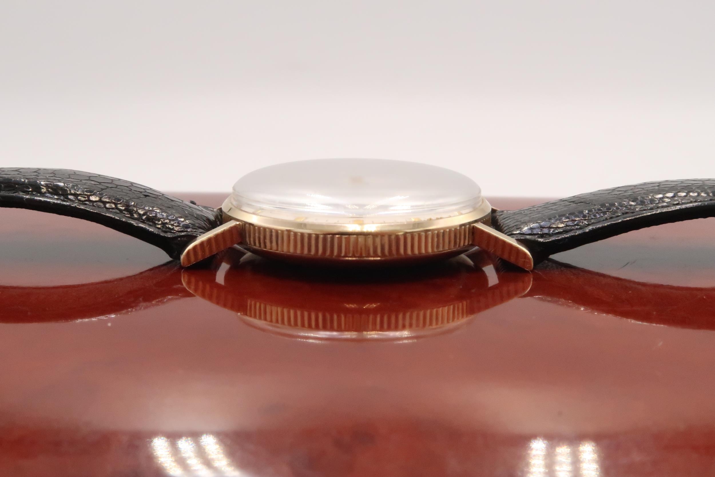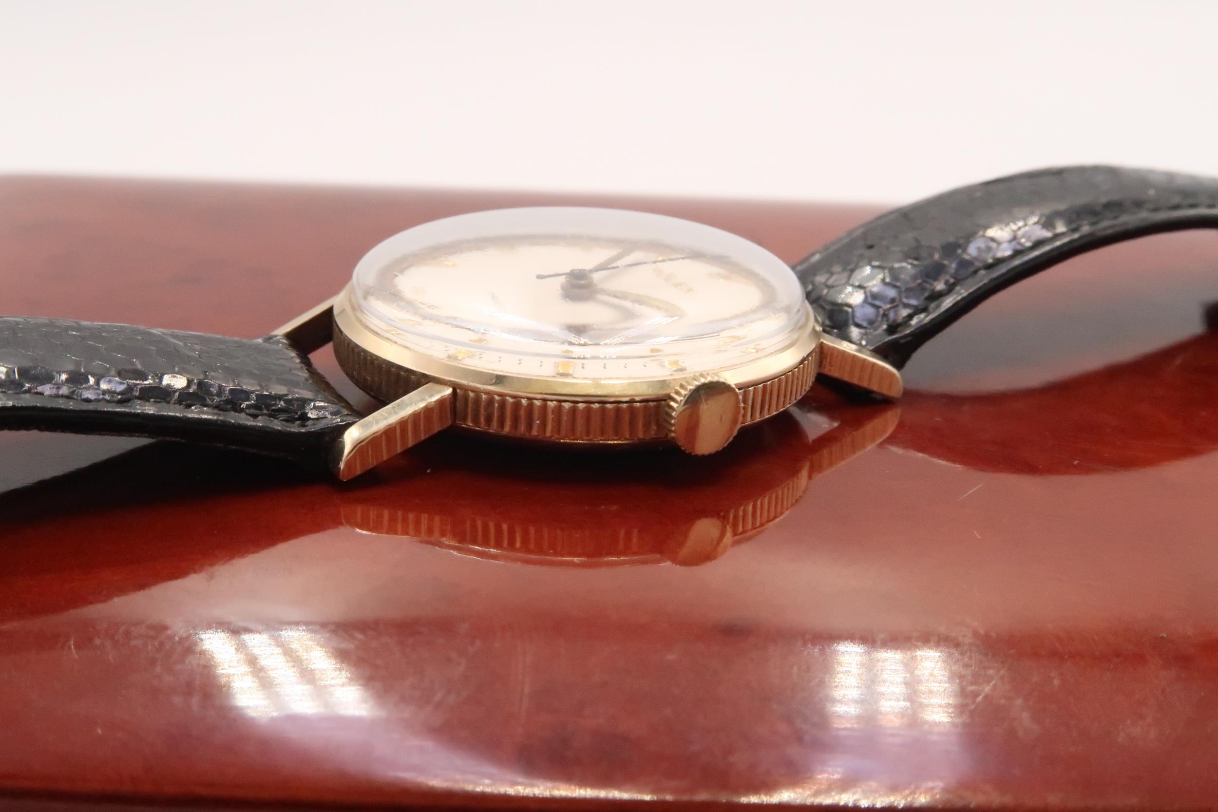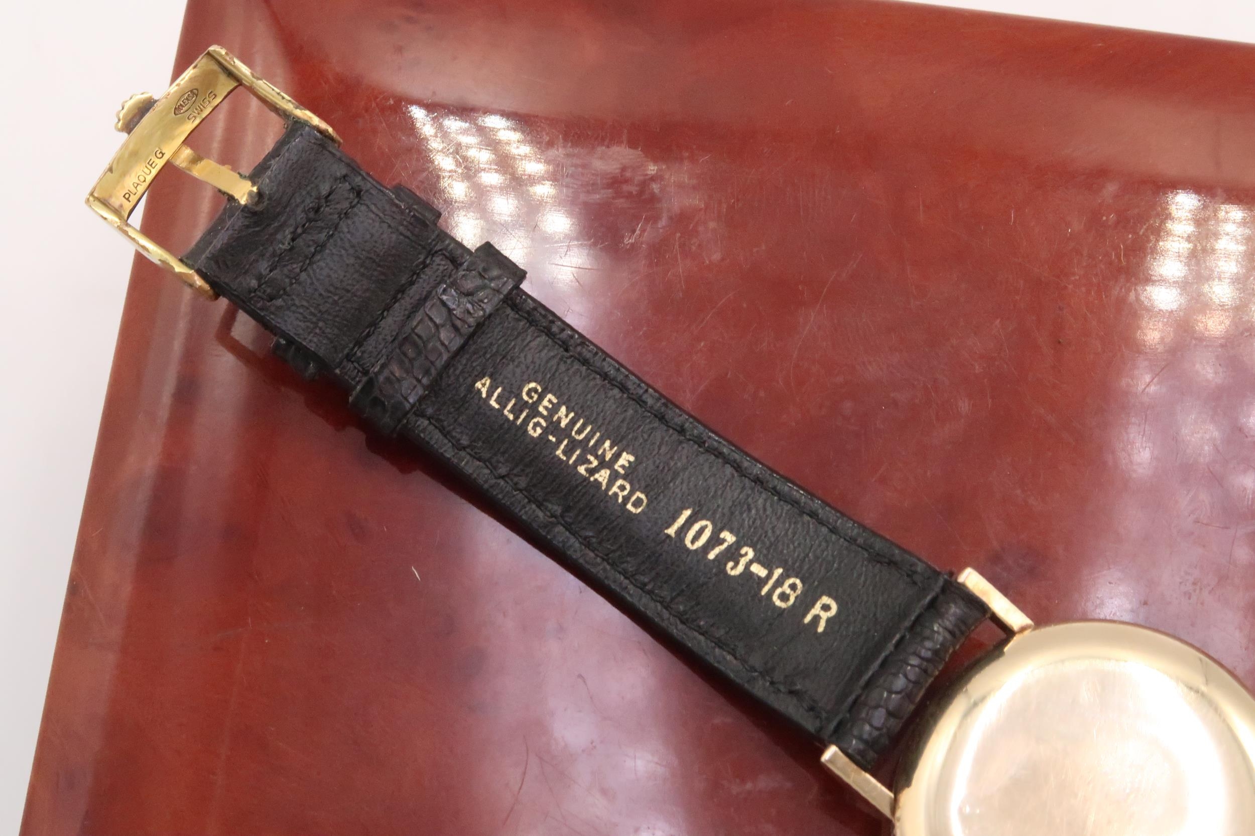 Featuring original gold plated buckle and cream dial with 'Arrowhead' hour markers, original unrestored 'lance' hands and milled case edge on a genuine lizard black strap. What makes this particular watch rare is the milled edge of the case.
