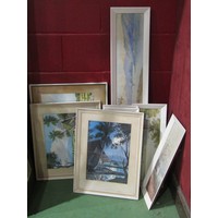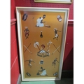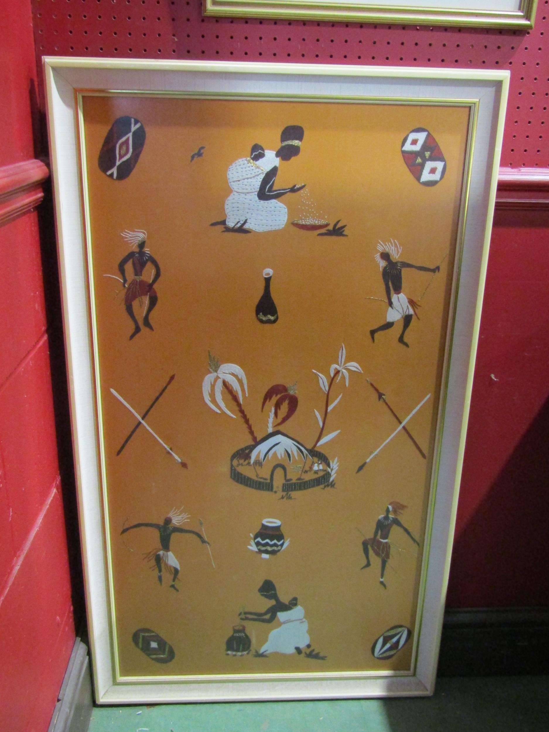 A needlepoint picture on fabric depicting a tribal village scene and surrounded by figures, cooking utensils and spears/shields. Framed. 95cm x 52cm image size