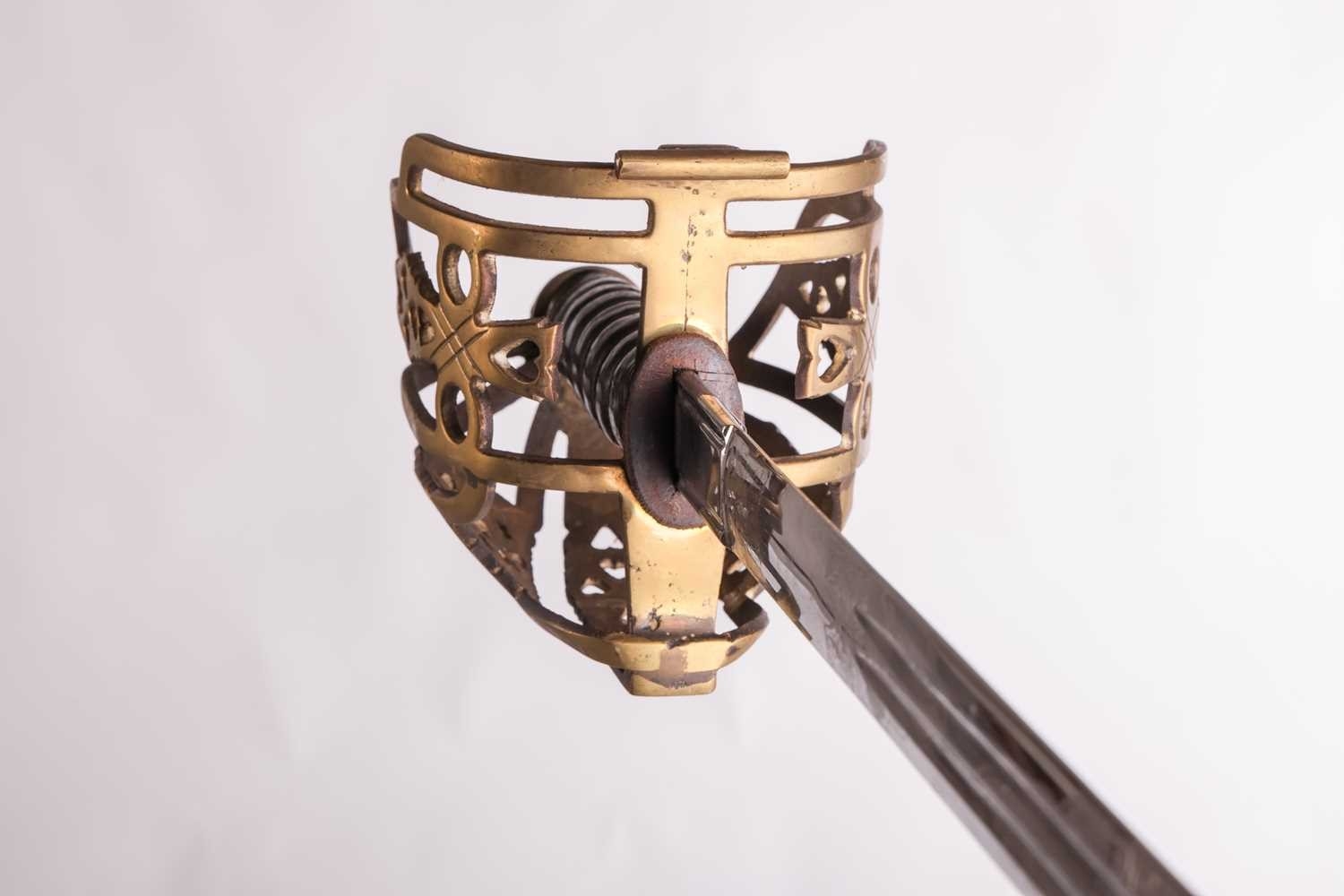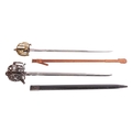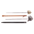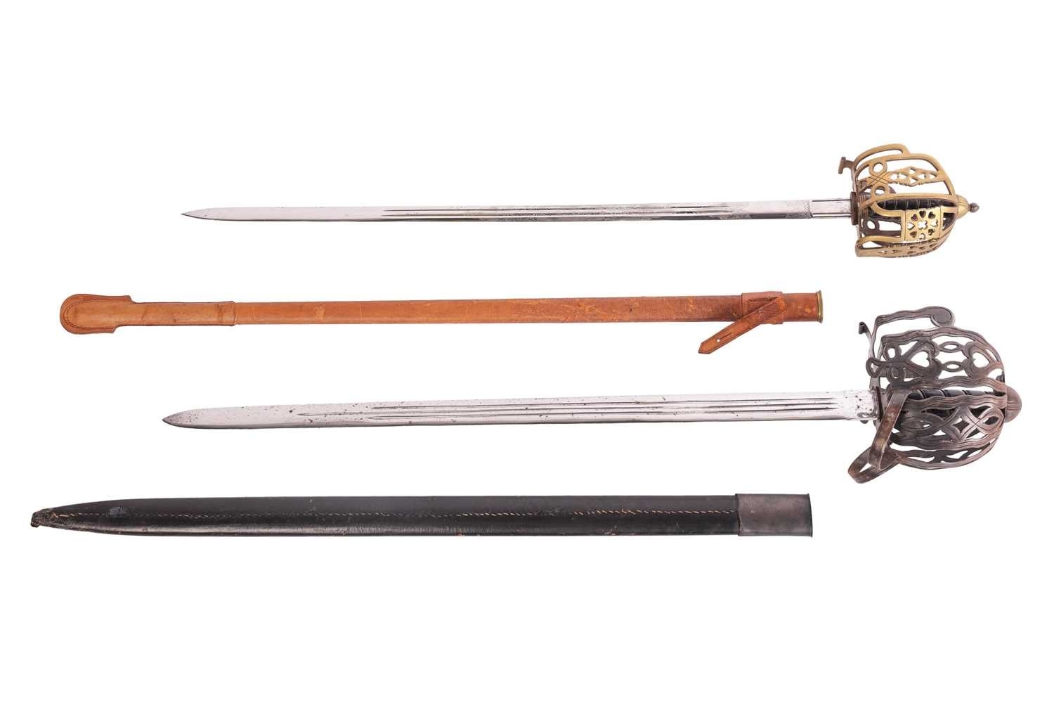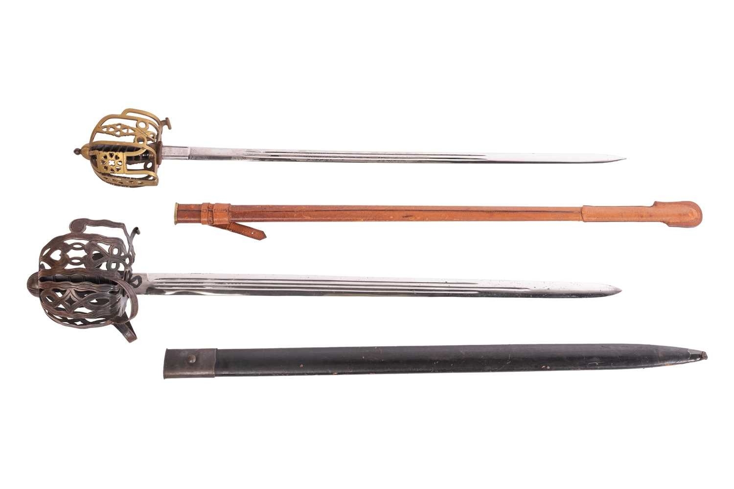 A Scottish officer's basket-hilted sword and leather-covered scabbard, 82 cm length of blade, together with a an iron basketed Scottish sword (copy) Qty: (2) This bladed product is not for sale to people under the age of 18. Please be aware that we are unable to send edged weapons or bladed products by postal courier to a UK residential address (Offensive Weapons Act 2019). International buyers must be aware of their country’s shipping and import policies regarding guns, knives, swords, and other offensive weapons prior to purchase. They are required to ensure that the lot can be delivered by a specialist shipper, whether in the UK, Europe or internationally. Please contact us if you require details of our suggested shippers.