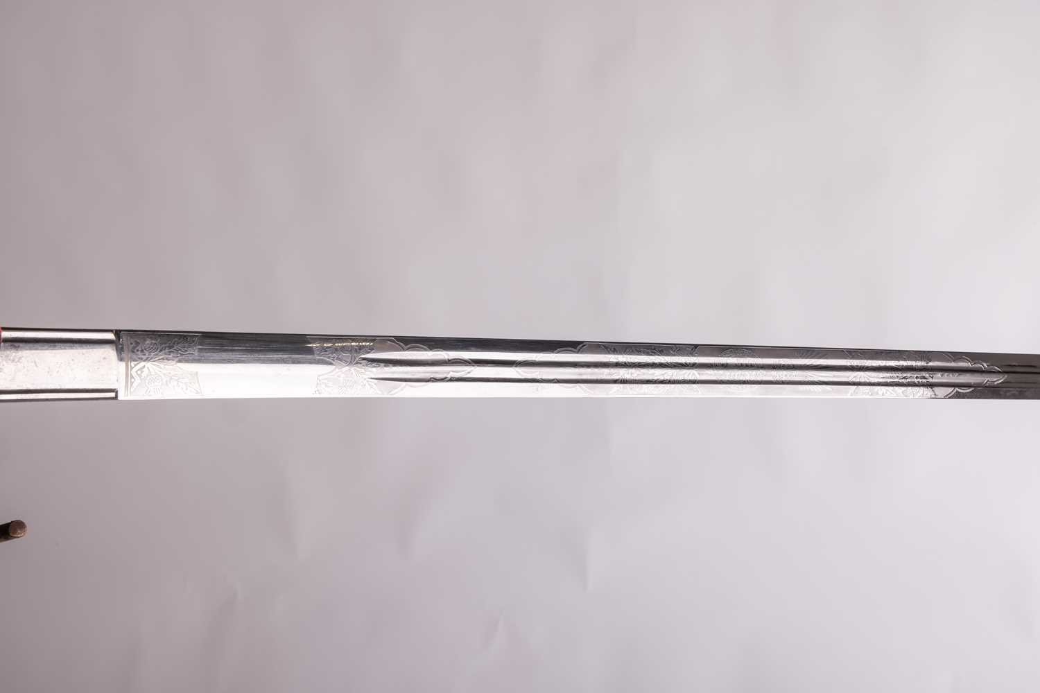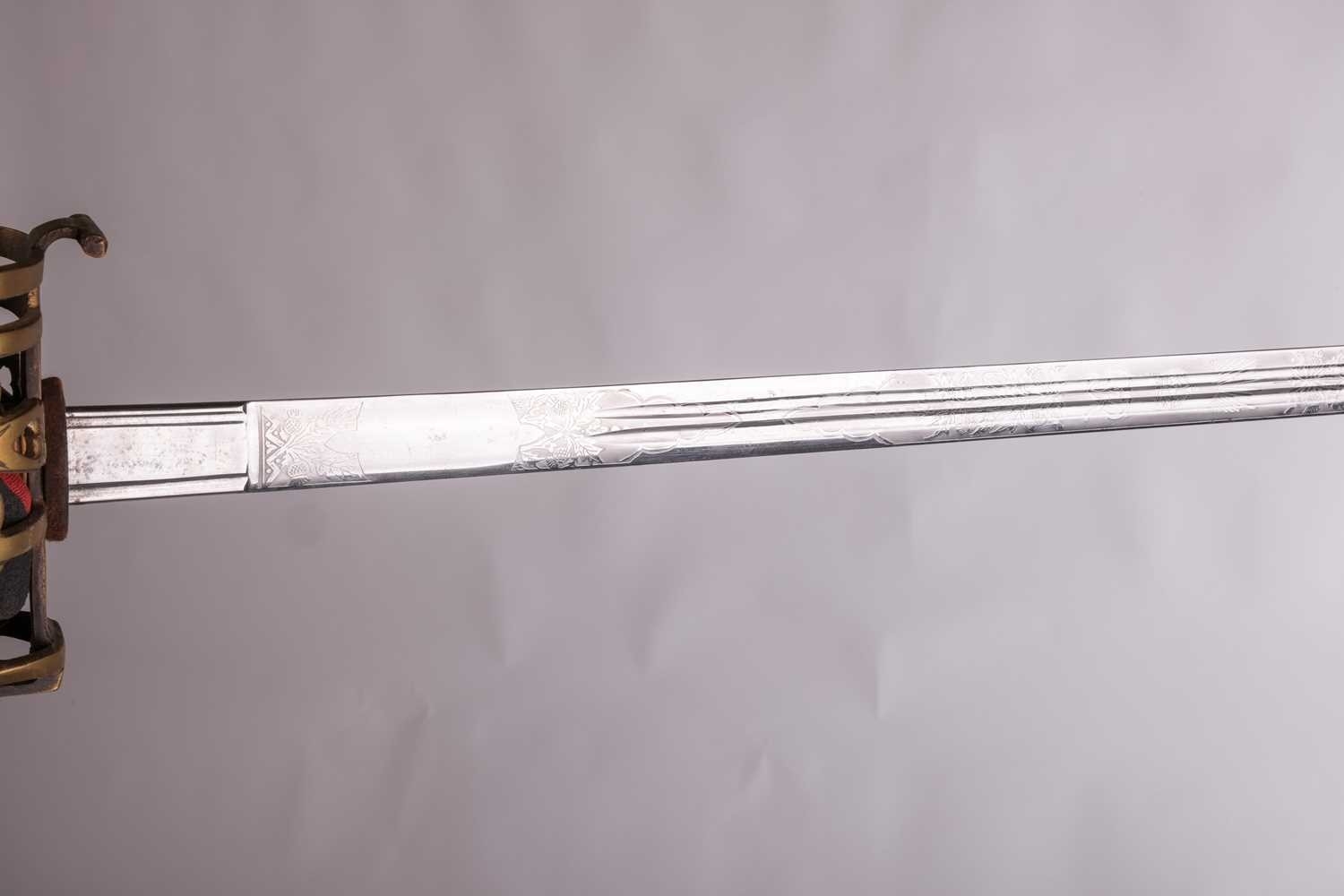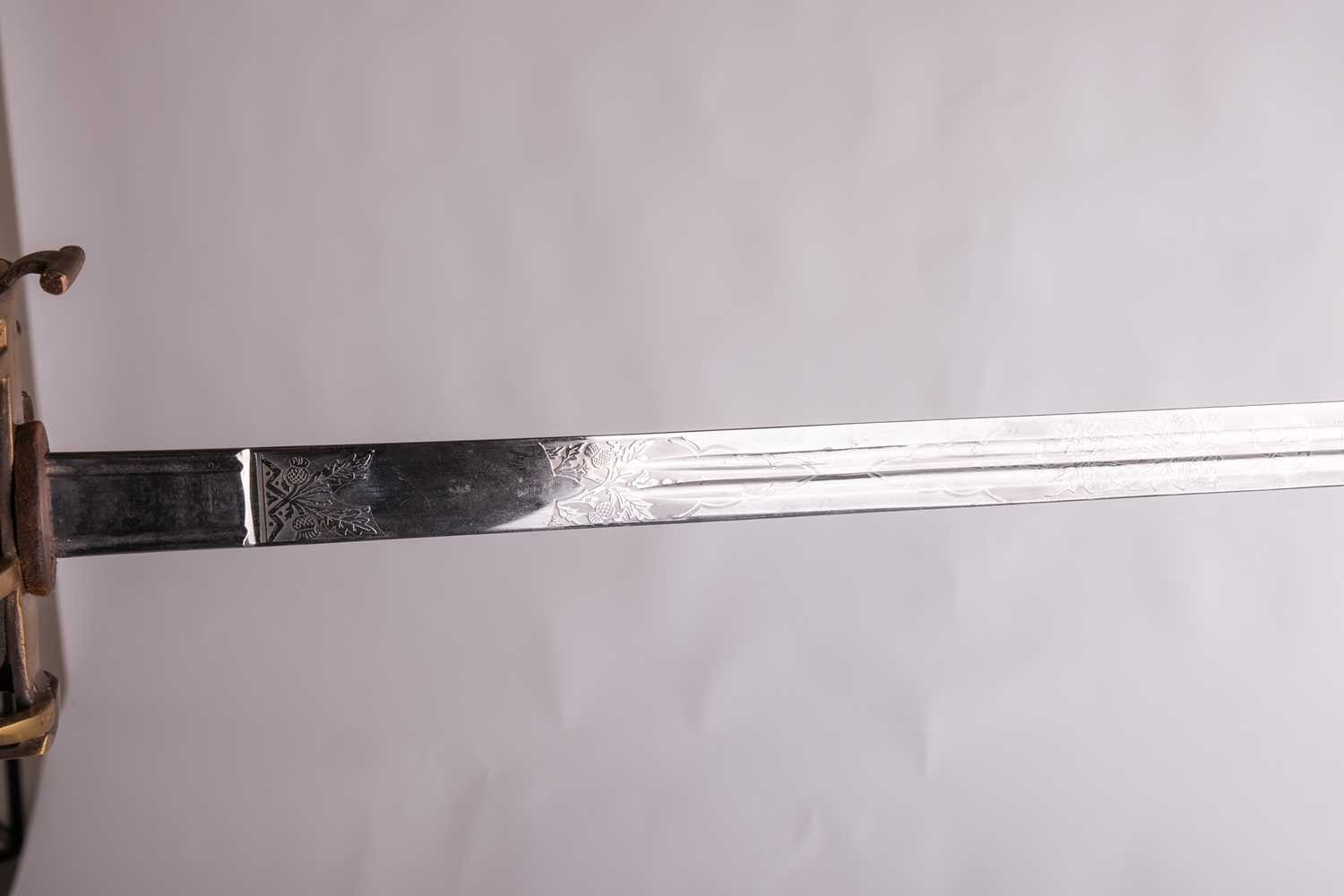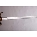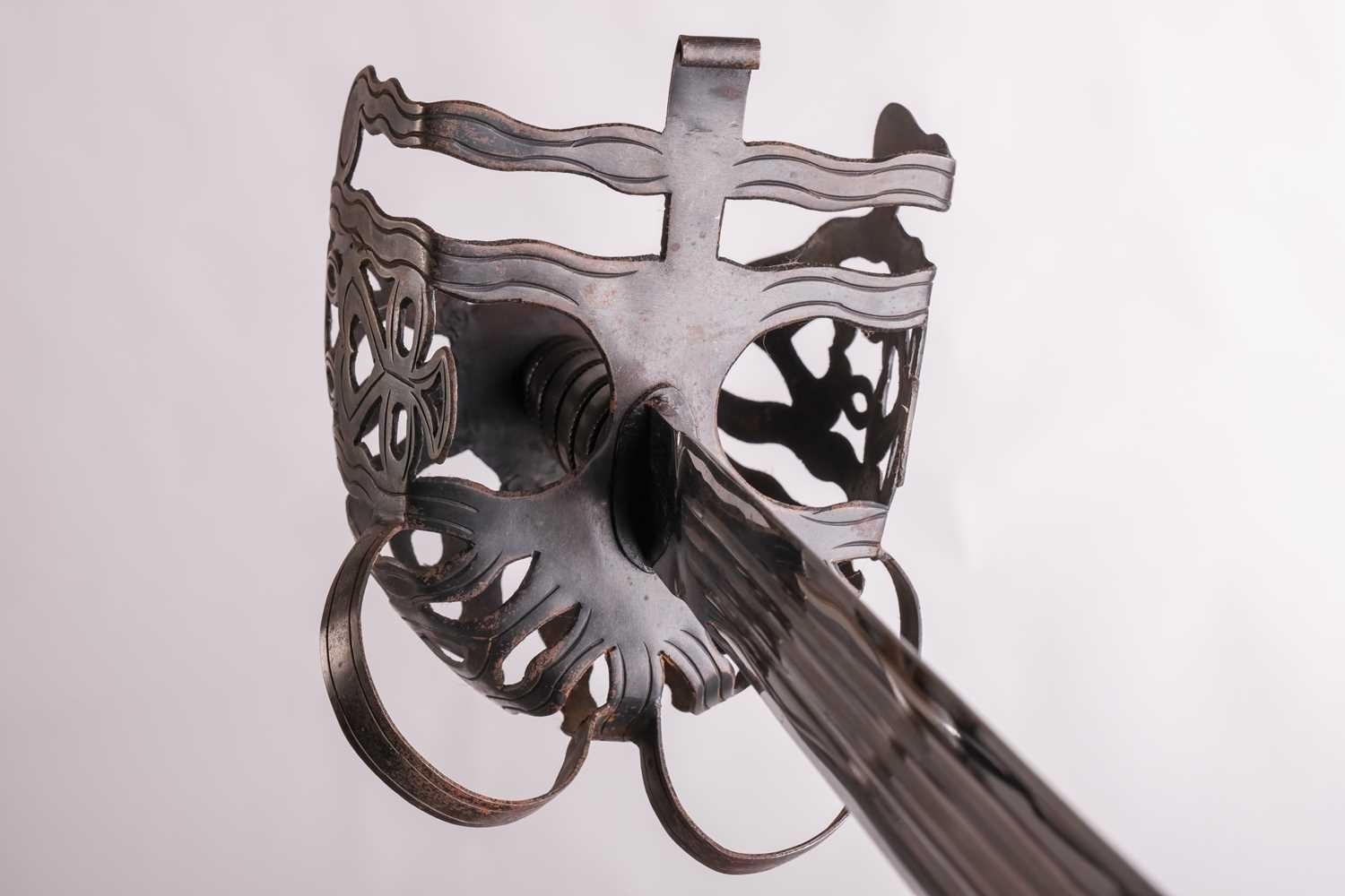 A Scottish officer's basket-hilted sword and leather-covered scabbard, 82 cm length of blade, together with a an iron basketed Scottish sword (copy) Qty: (2) This bladed product is not for sale to people under the age of 18. Please be aware that we are unable to send edged weapons or bladed products by postal courier to a UK residential address (Offensive Weapons Act 2019). International buyers must be aware of their country’s shipping and import policies regarding guns, knives, swords, and other offensive weapons prior to purchase. They are required to ensure that the lot can be delivered by a specialist shipper, whether in the UK, Europe or internationally. Please contact us if you require details of our suggested shippers.