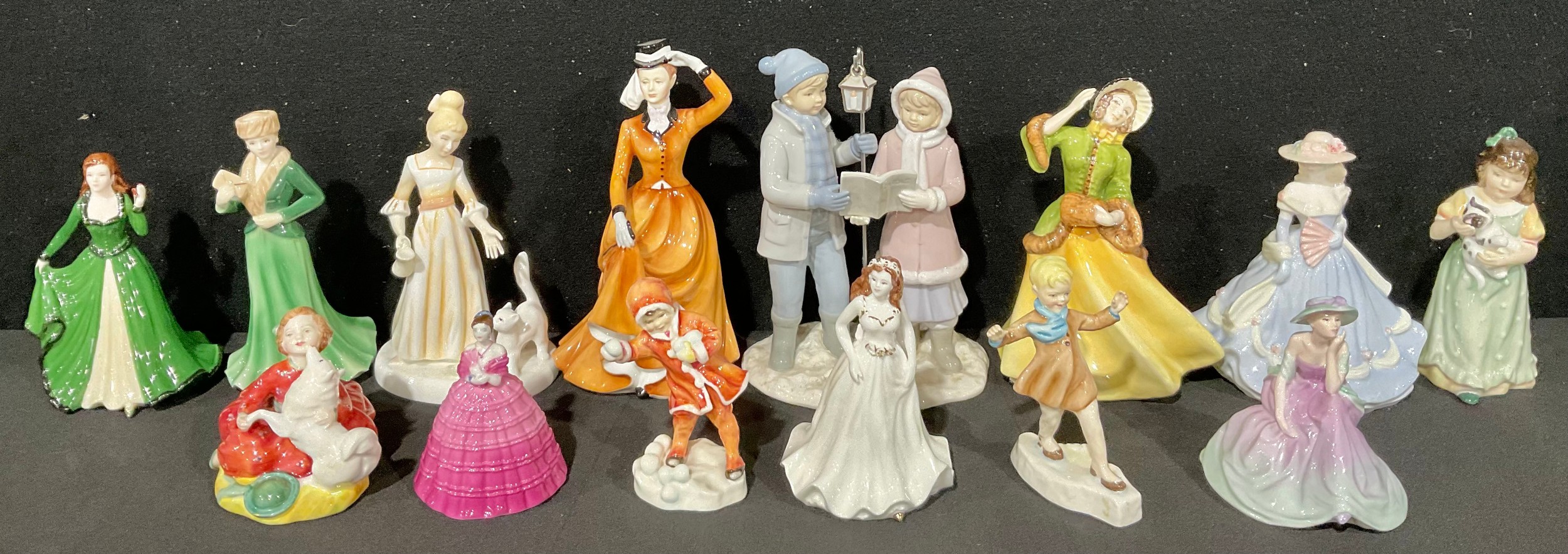 A Royal Worcester figure, The Slide, modelled by F.G. Doughty, 11cm high; another, Snowball; a Royal Doulton figure, Home Again, HN2167; others, Home at Last, HN3697; etc; Coalport figures; Francesca Art China figures; etc (14)