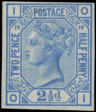 1880 2½d Blue Pl.19. Very fine unused o.g. imperforate (close at top right) imprimatur lettered OI, contemporary manuscript date in pencil on reverse ‘6 apr 80’. Scarce one of only 22 possible examples in private hands. SG142. Cat. £2500.