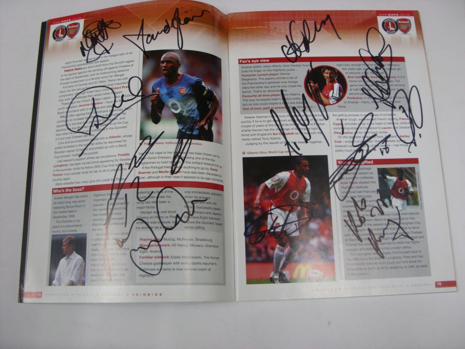 AUTOGRAPHED PROGRAMME, 2002/2003, Charlton Athletic v Arsenal, a Football Programme for the fixture played 14/09/2002, the programme is Hand Signed by 15 Arsenal Players, the signatures are on page 17, 18 & 19, the Signatures Include Thierry Henry, Patrick Vieira, Dennis Bergkamp, Lauren, Gilberton Silva, Robert Pires, Kolo Toure, Martin Keown etc. Estimate: £14/£16 - Opening Bid: £12