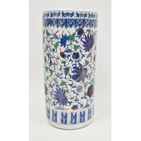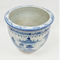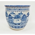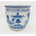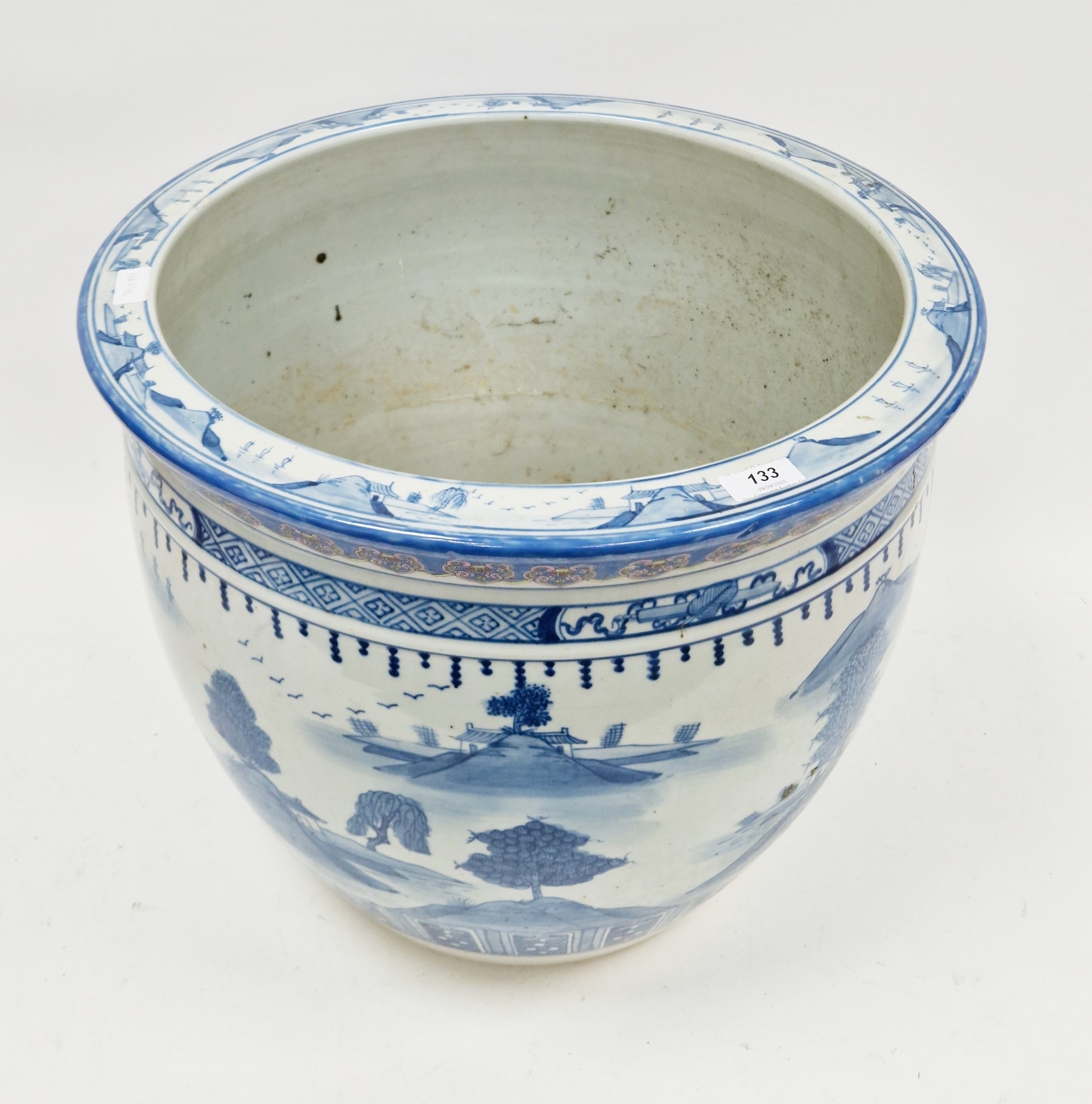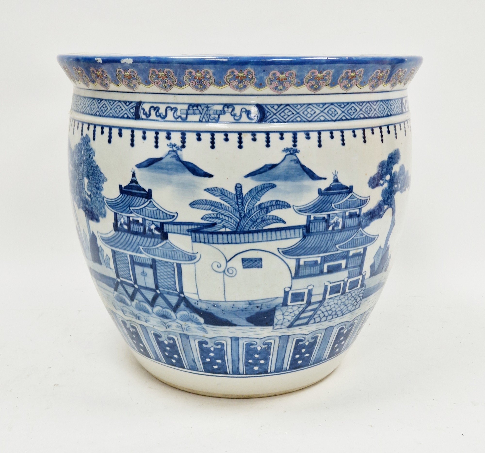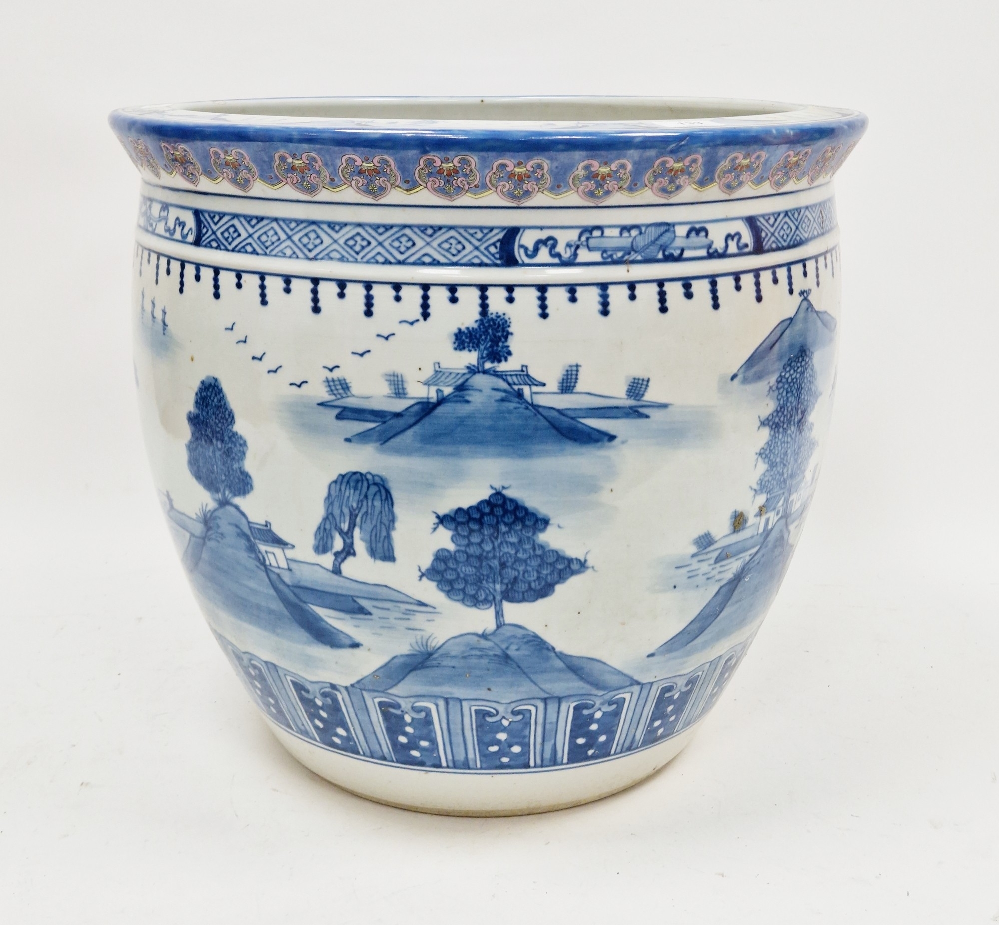 20th century Chinese porcelain large jardiniere, of baluster form decorated with pavilions on islands, pine trees and figures on boats within lappet-shaped borders, the upper rim decorated in polychrome enamels with interlocking lappets, 40.5cm high x 46.5cm diameter