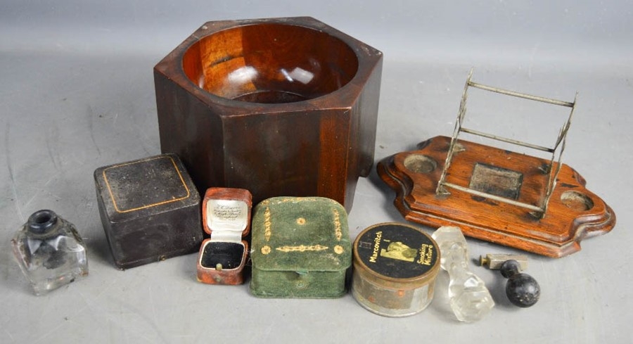 An antique pen stand, three antique jewellery boxes and other collectables.