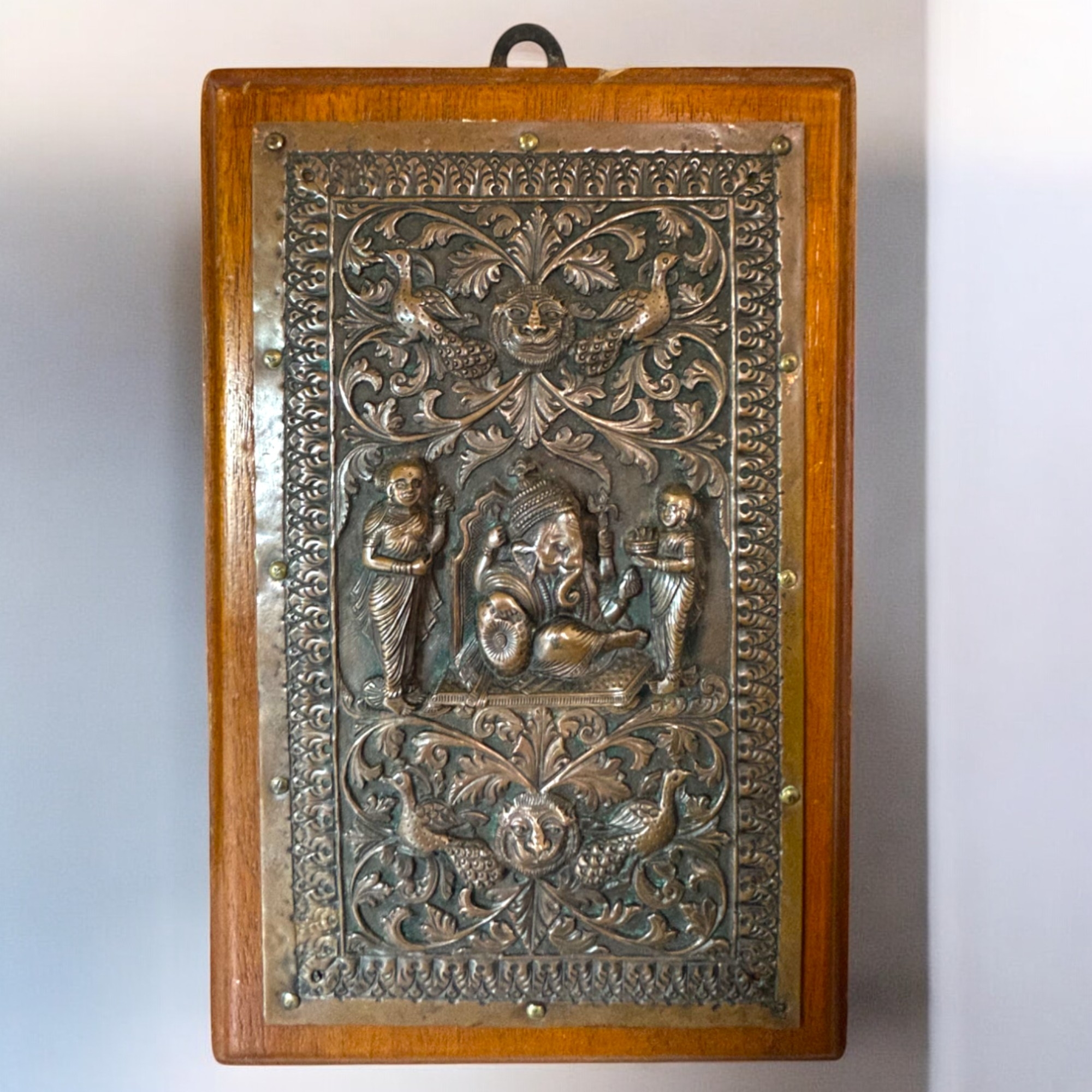 Mounted on wood. Finely decorated with Ganesh, Tiger heads and Peacocks.