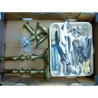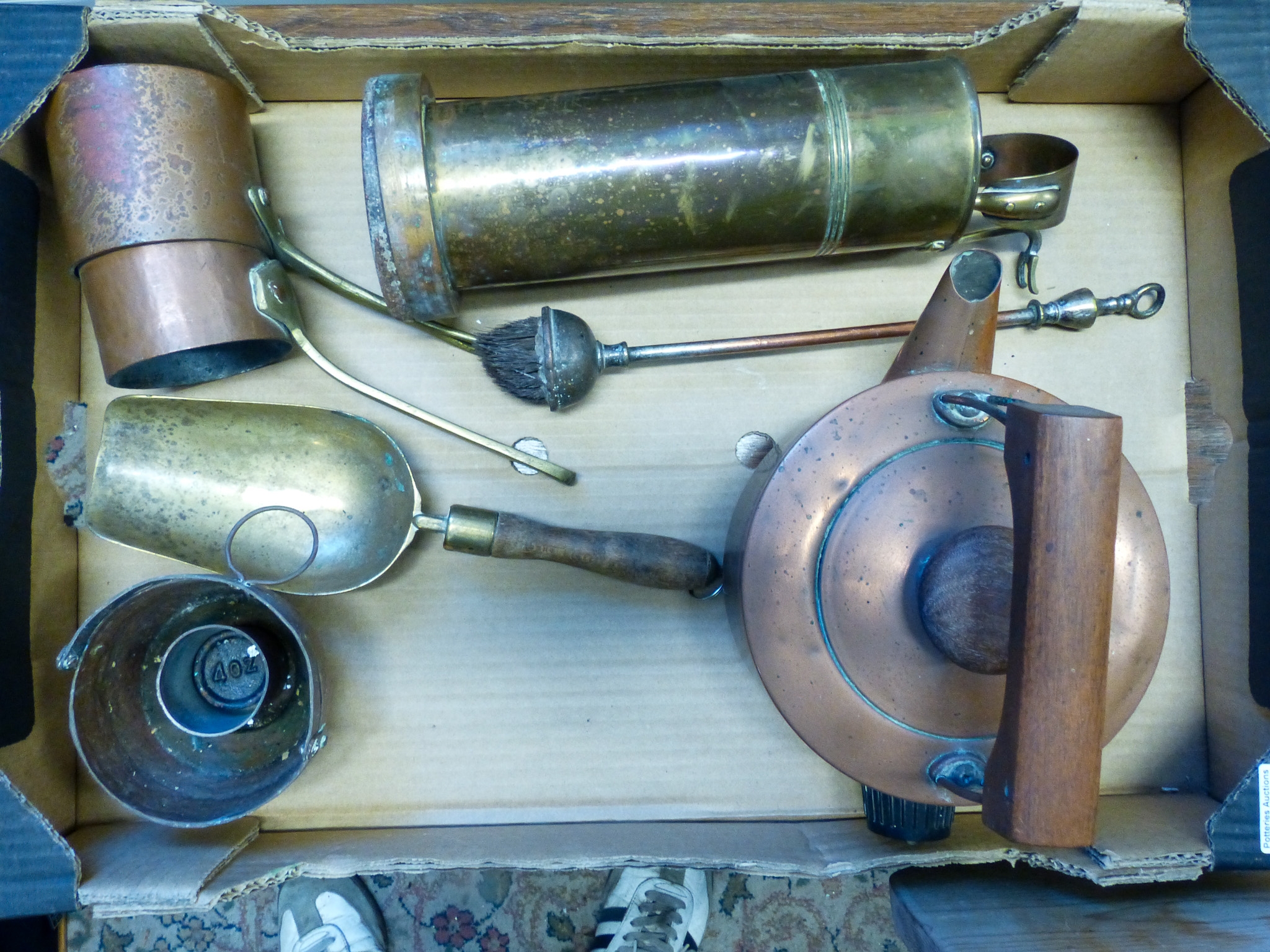 Tray of mixed metalware to include, copper kettle, various fireside implements, pots etc. (1 tray)