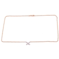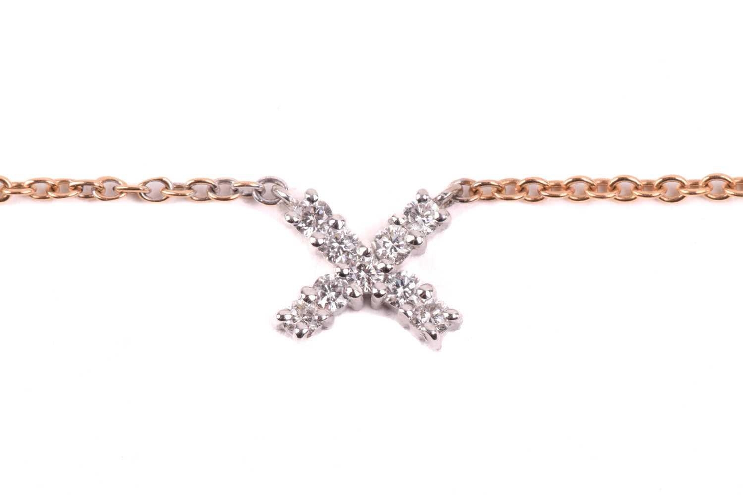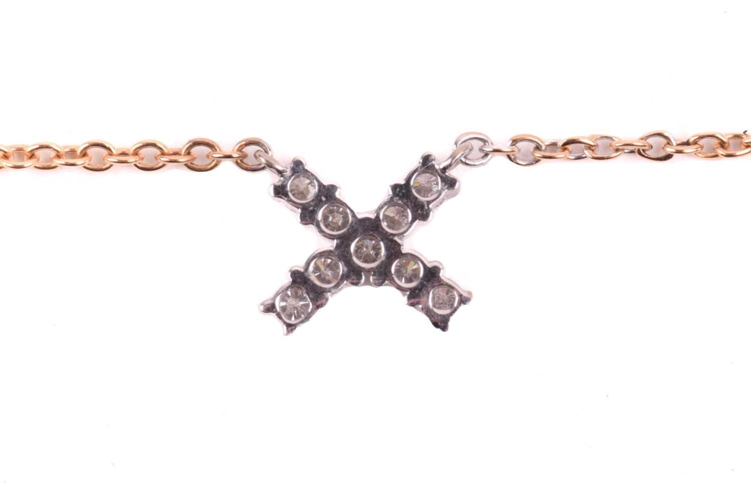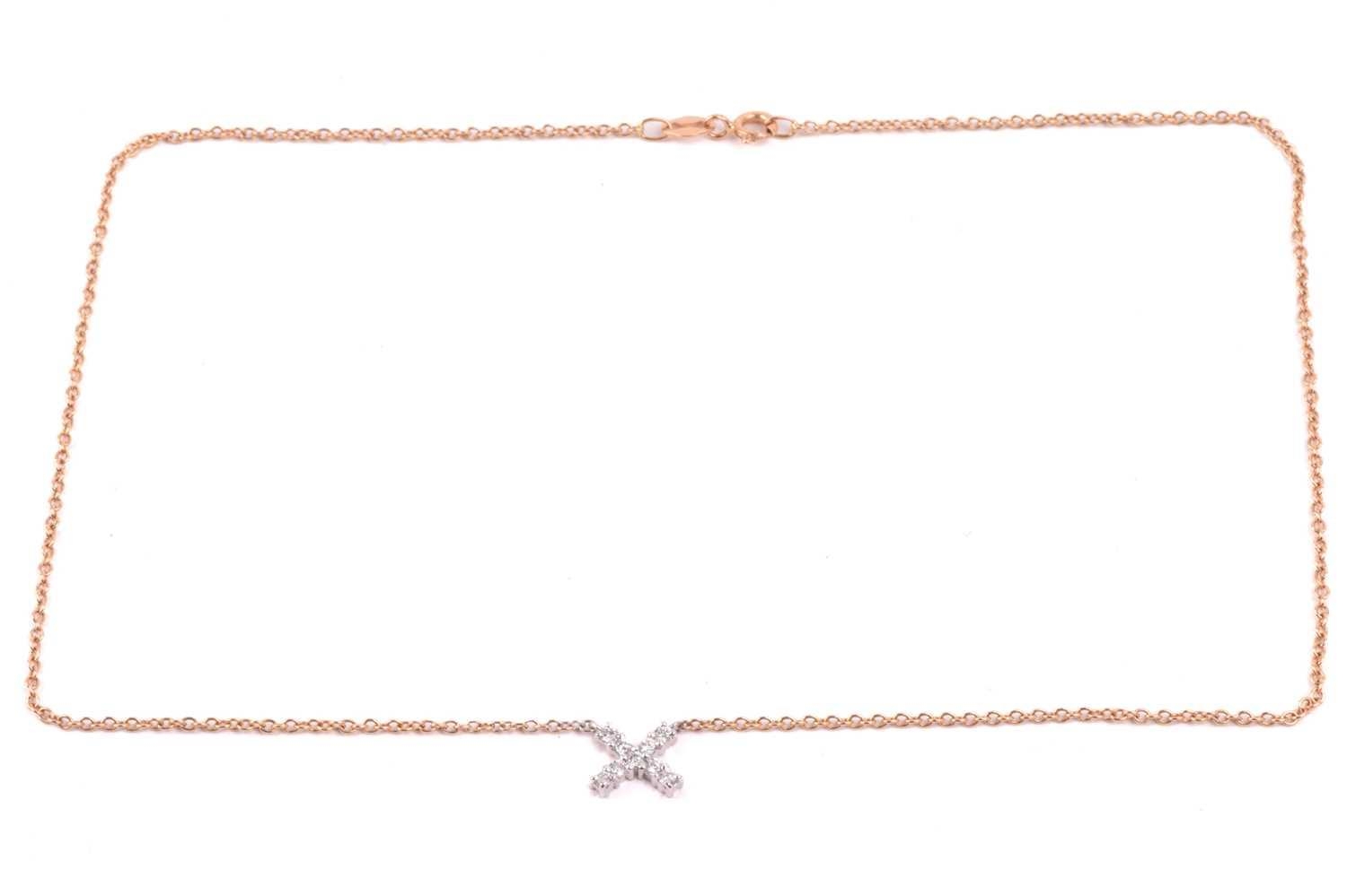 A diamond kiss pendant, set with round brilliant cut diamonds with a total estimated weight of 0.30ct, to a yellow metal chain marked '750', 41cm in length. Total weight 3.5g.