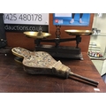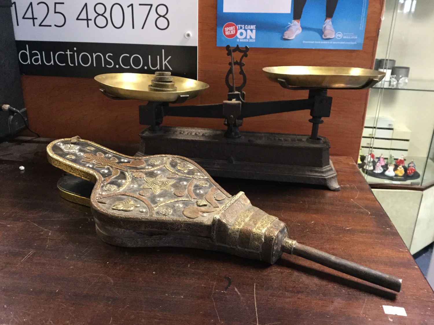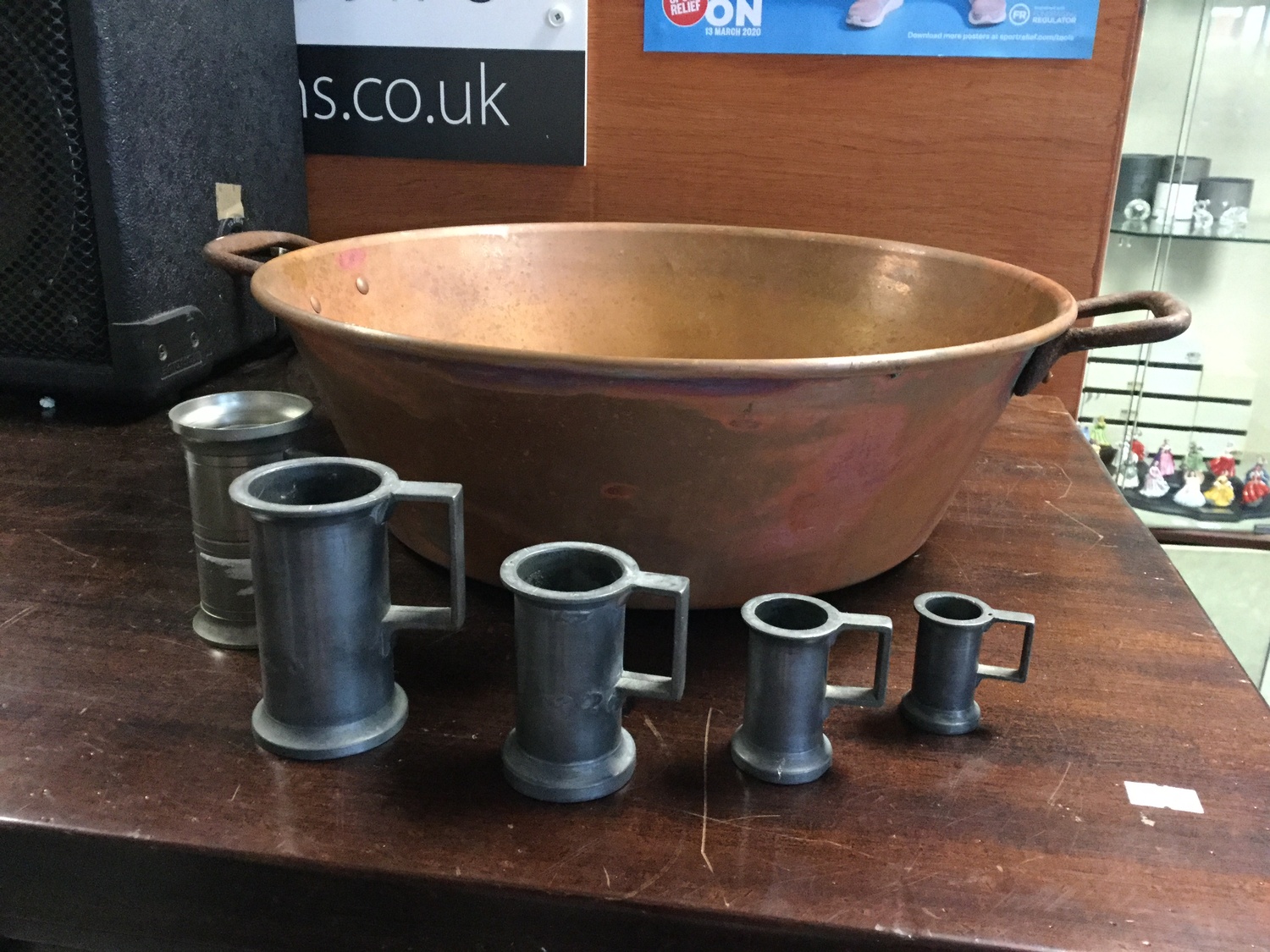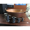 A mixed lot, to include French scales, pewter measures, copper pan and bellows -
