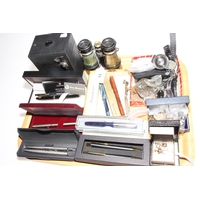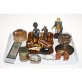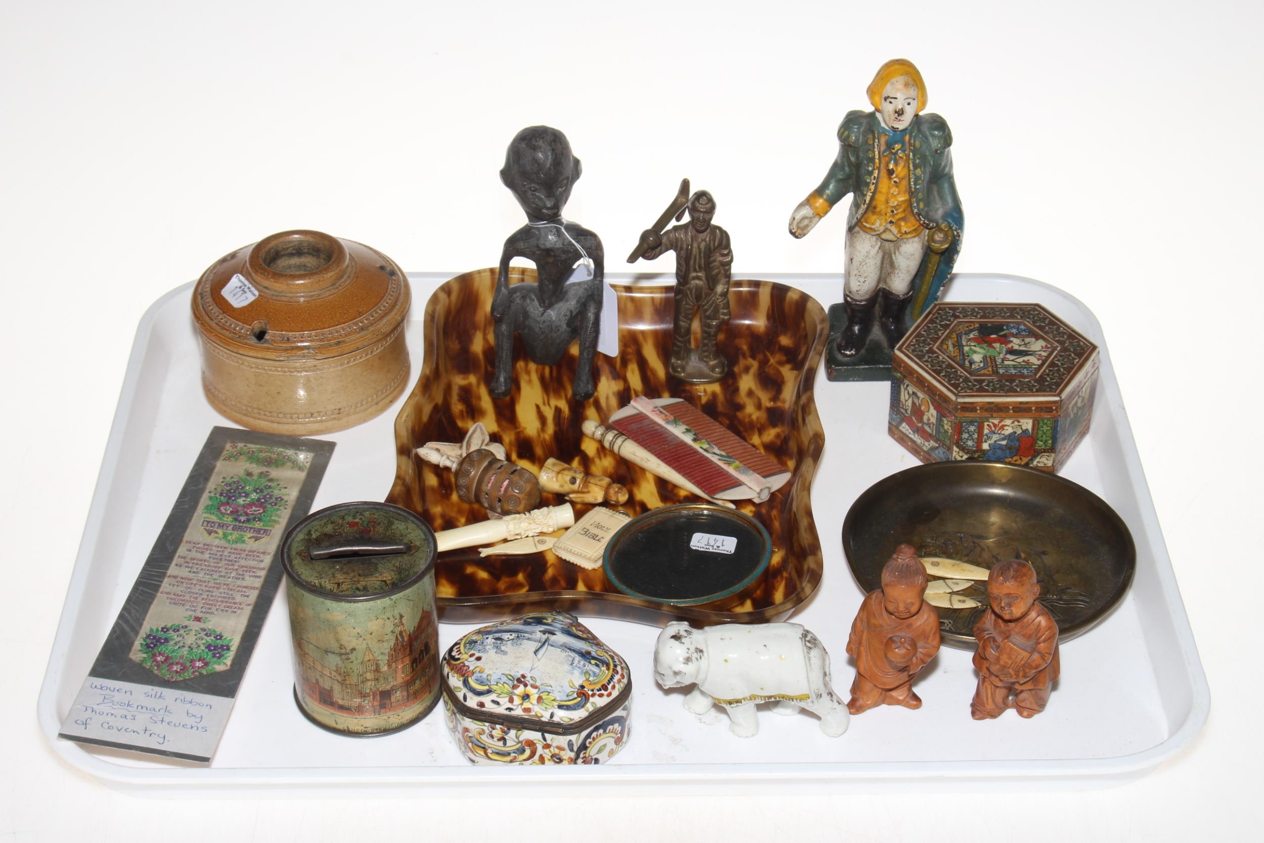 Tray lot of collectors pieces including antique Delft box, Indian inlaid box, miner figure, Stevengraph bookmark, etc.