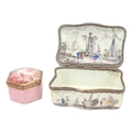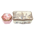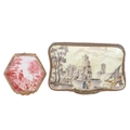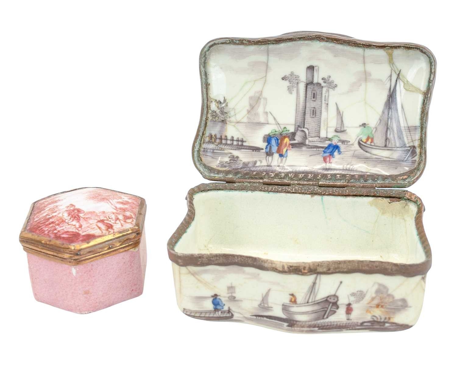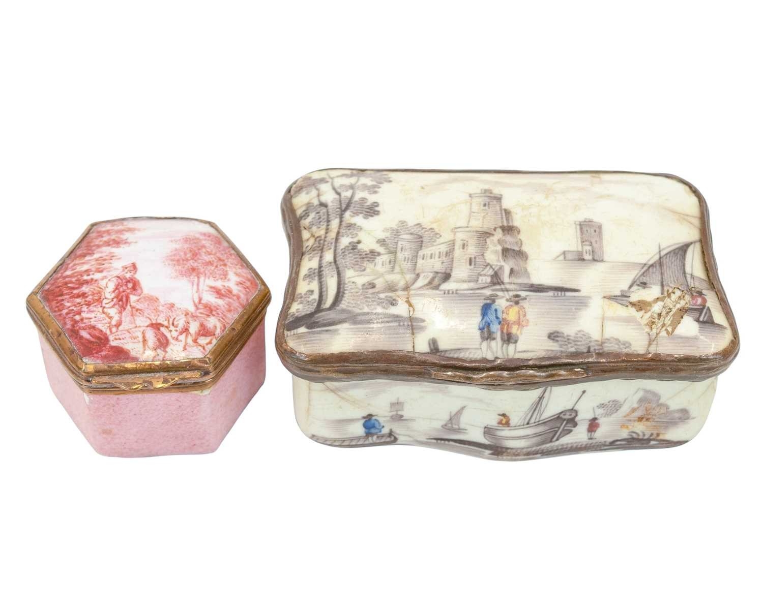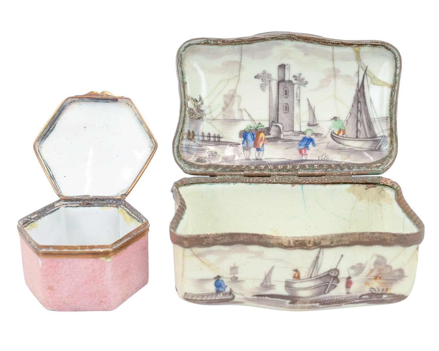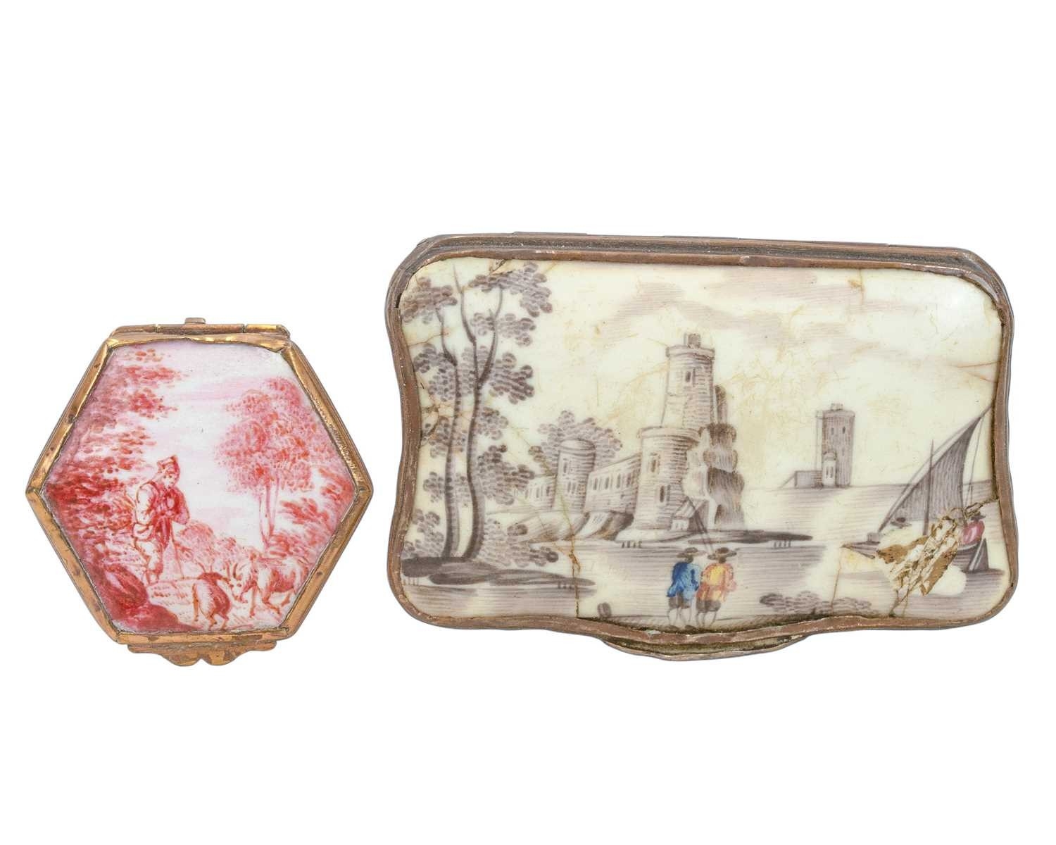 A hexagonal enamel patch box. 18th century, South Staffordshire or Battersea, the cover painted puce en camieau with a shepherd, width 4.7cm, together with another 18th century enamel box, painted with harbour and coastal views, width 8.5cm (2).