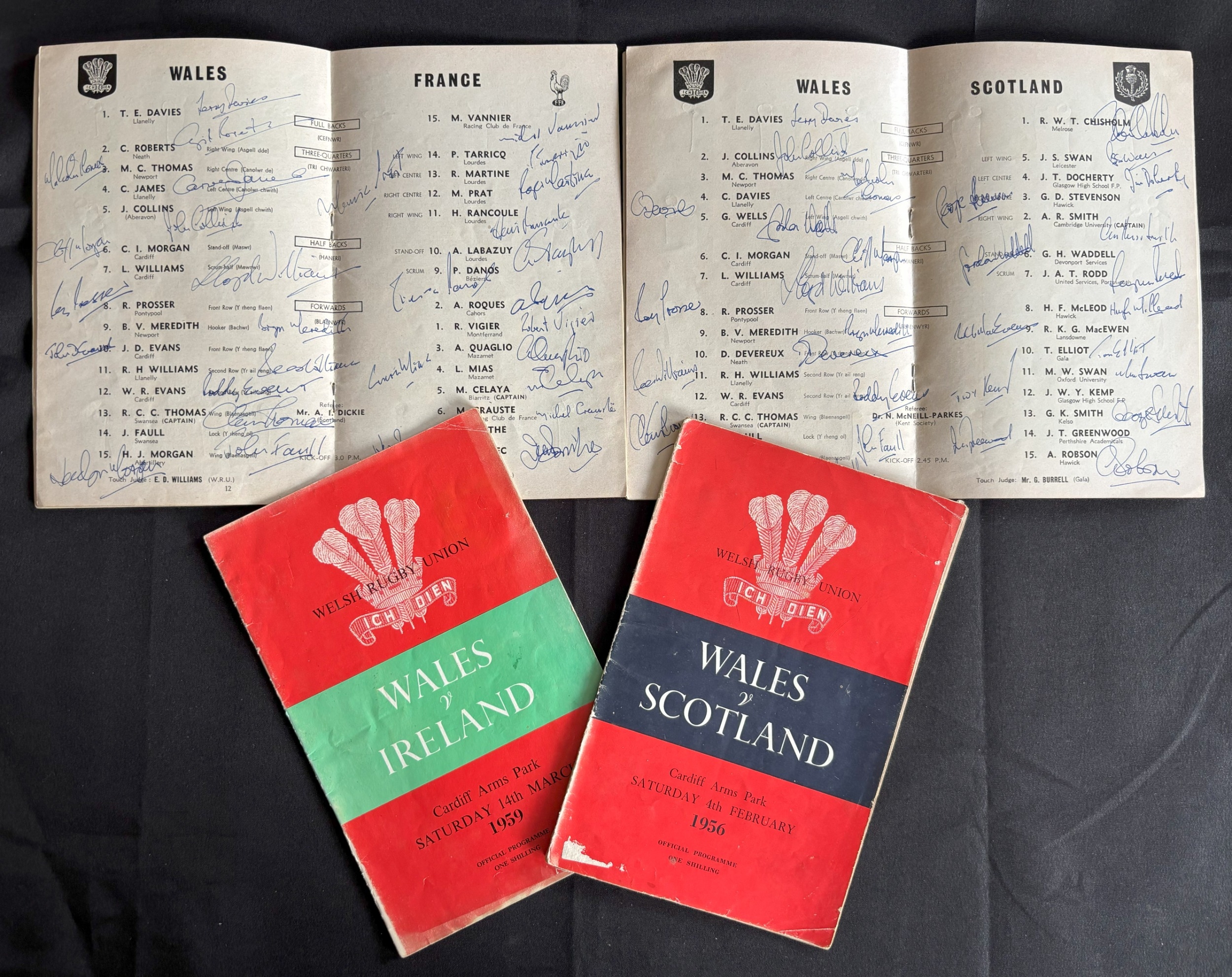 1950s Wales Home Multi-Signed Rugby Programmes (4): v Scotland 1956 and 58; v France 58 and v Ireland 59. 19 A few written comments/marks but outweighed by the comprehensive autographing of every one - teams, officials, guests, writers of the articles etc etc