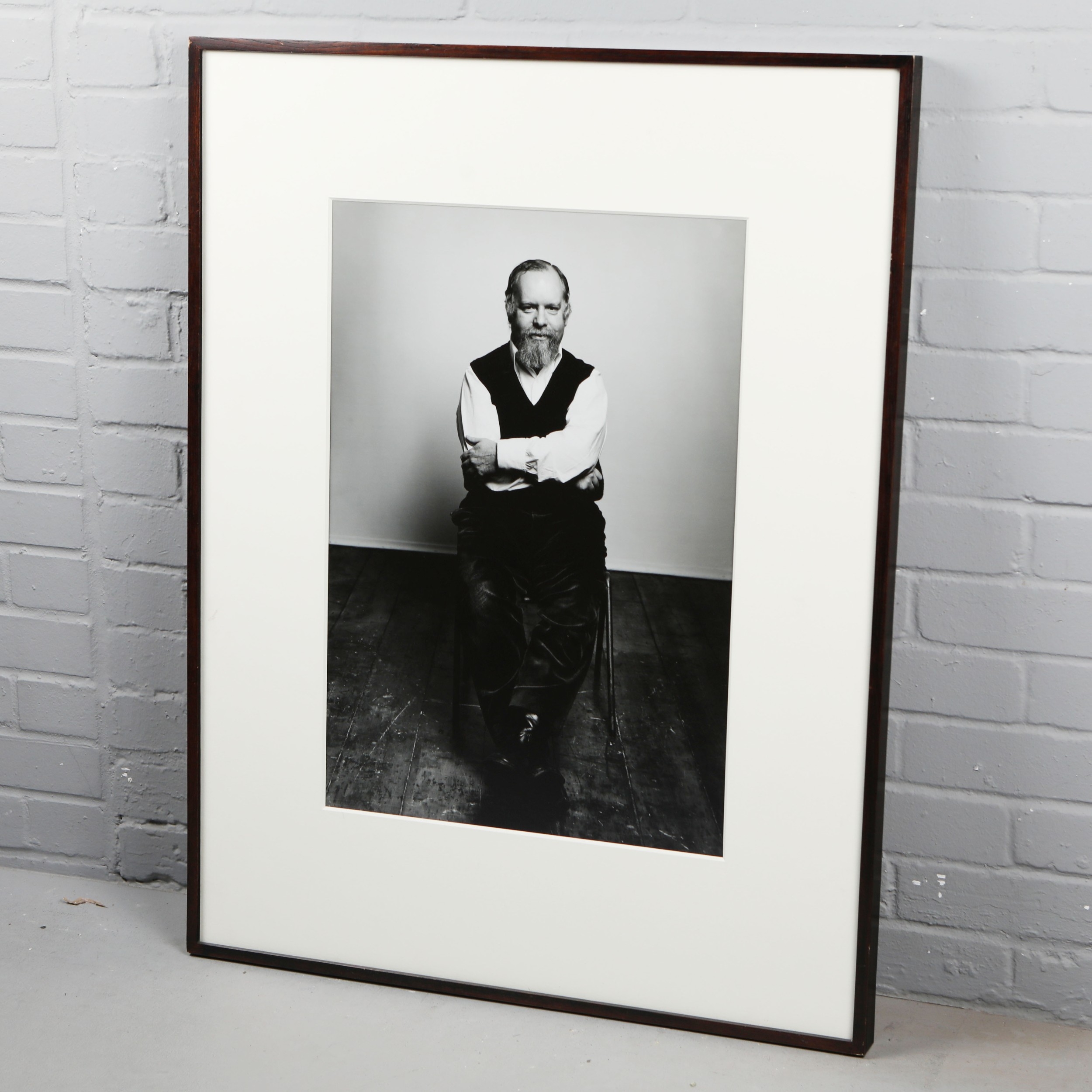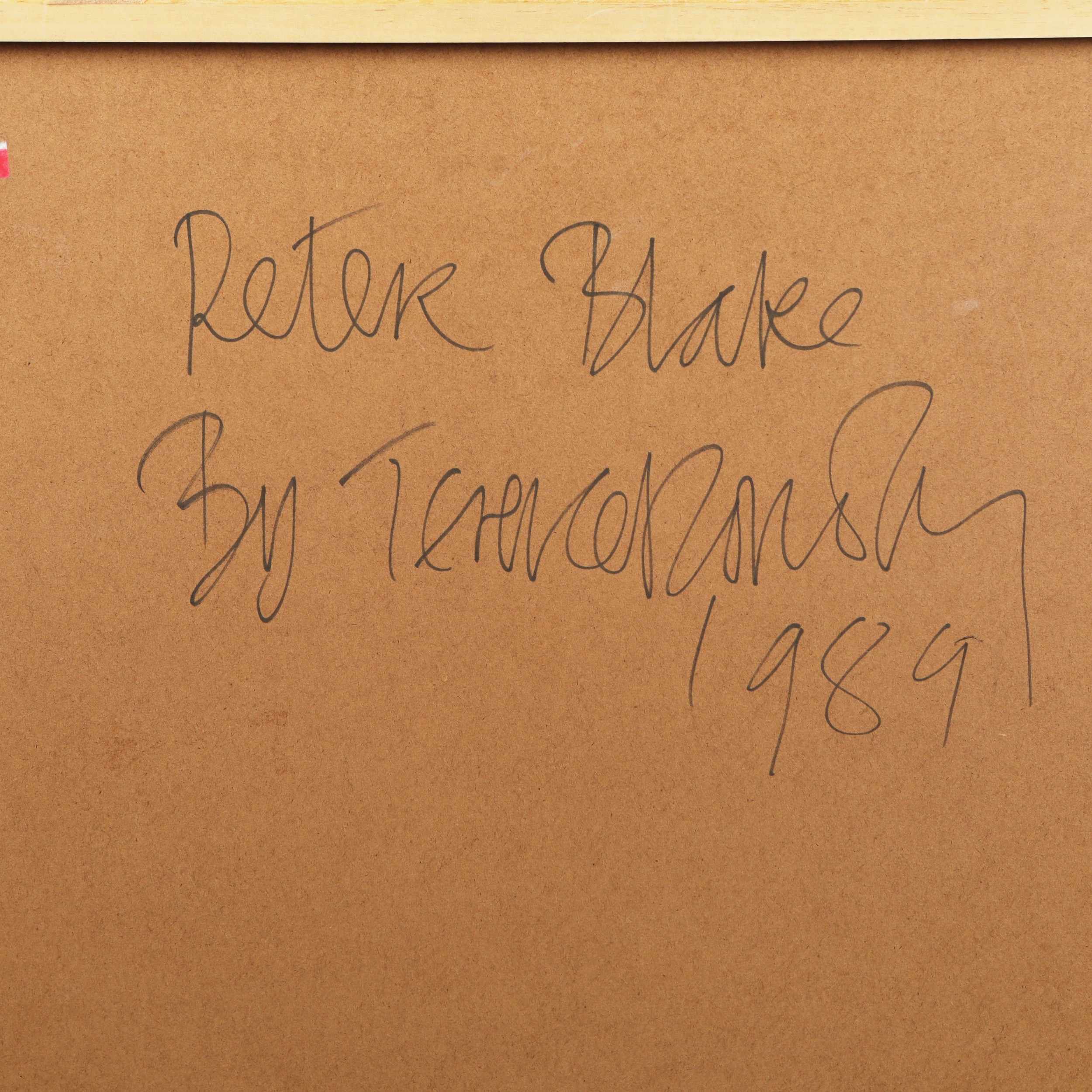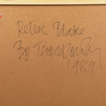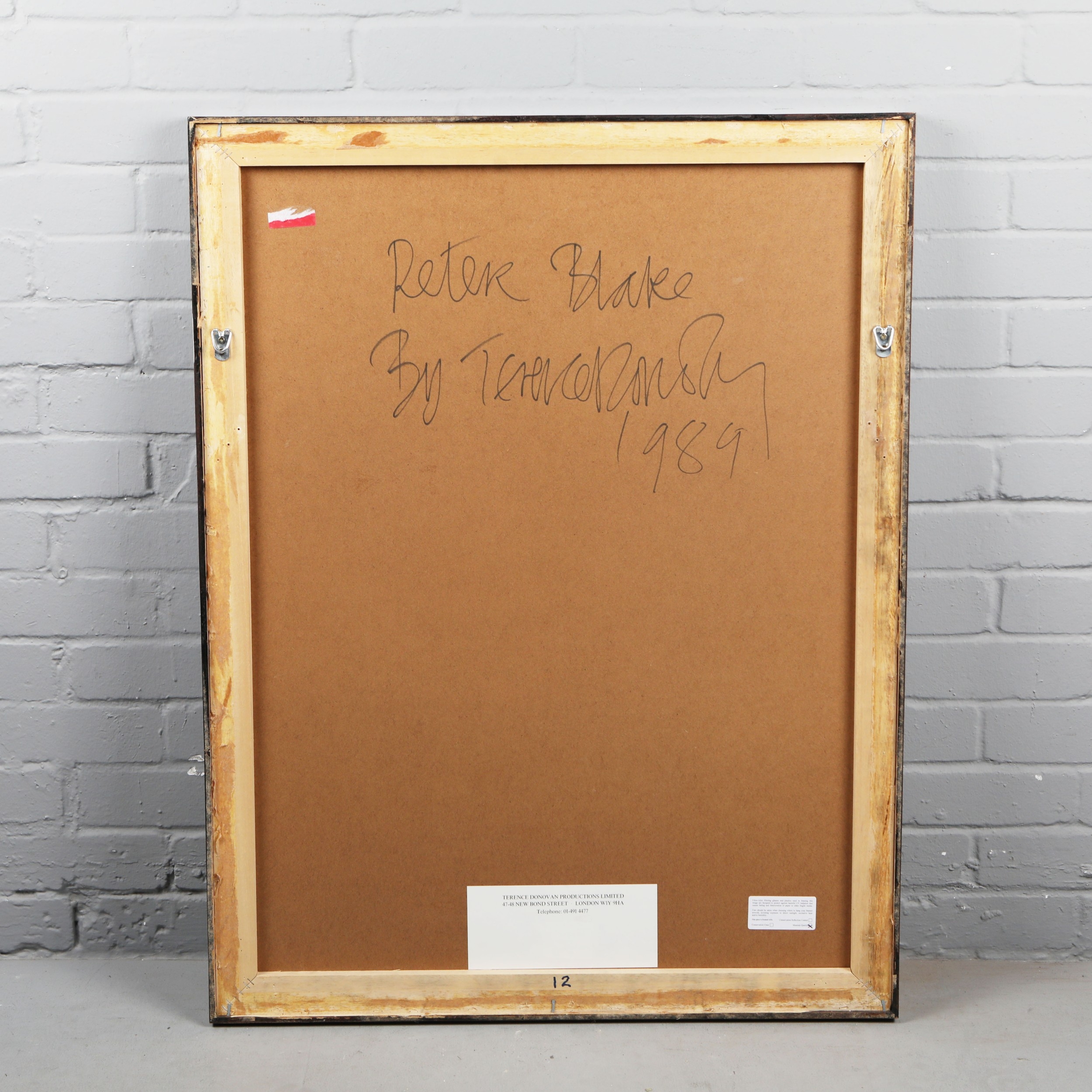 TERENCE DONOVAN (1936 – 1996). PETER BLAKE, 1989. silver print, mounted. Signed, titled and dated in black pen on the back of the frame, photographer's label affixed to the back of the frame, 99 cm H x 76.5 cm W (framed).