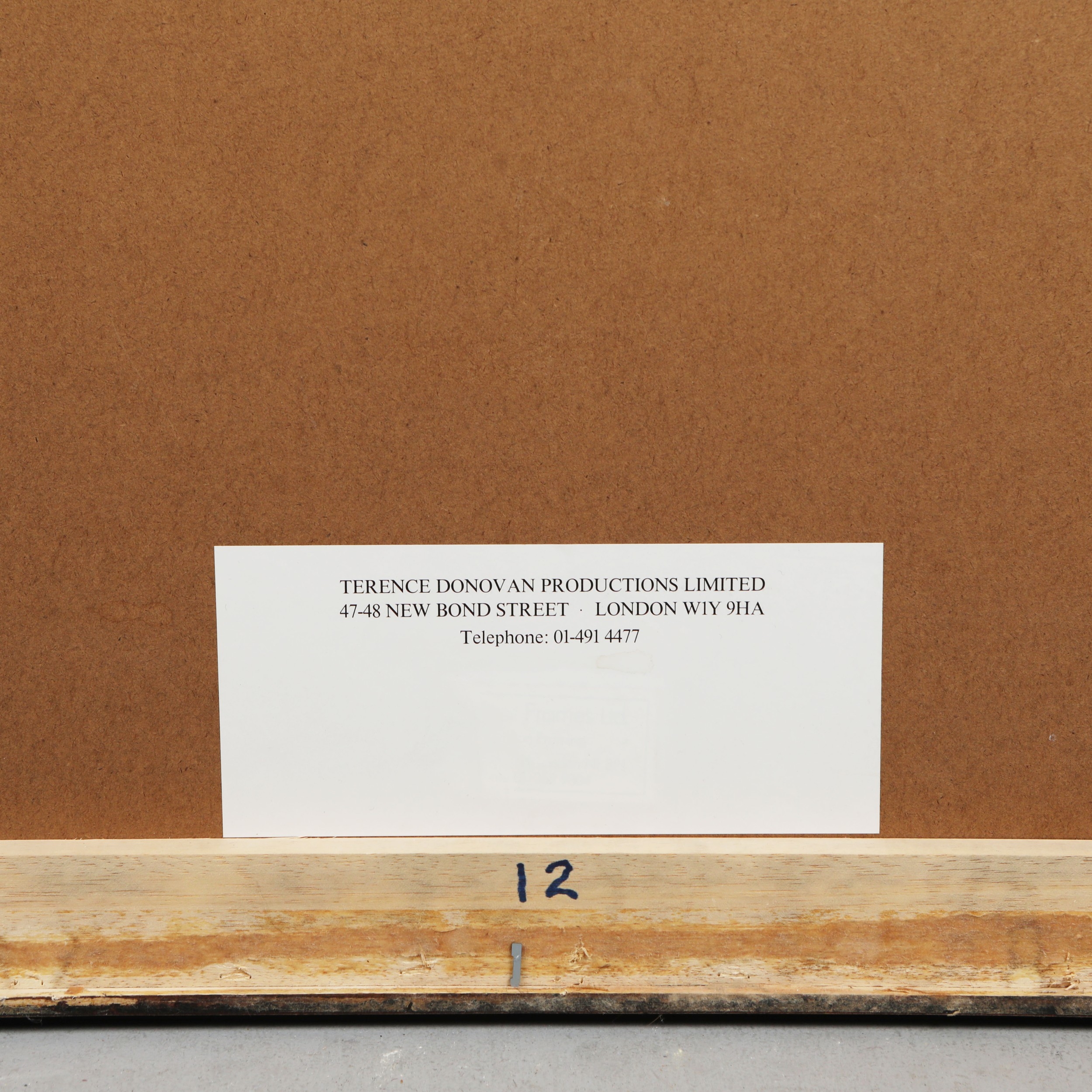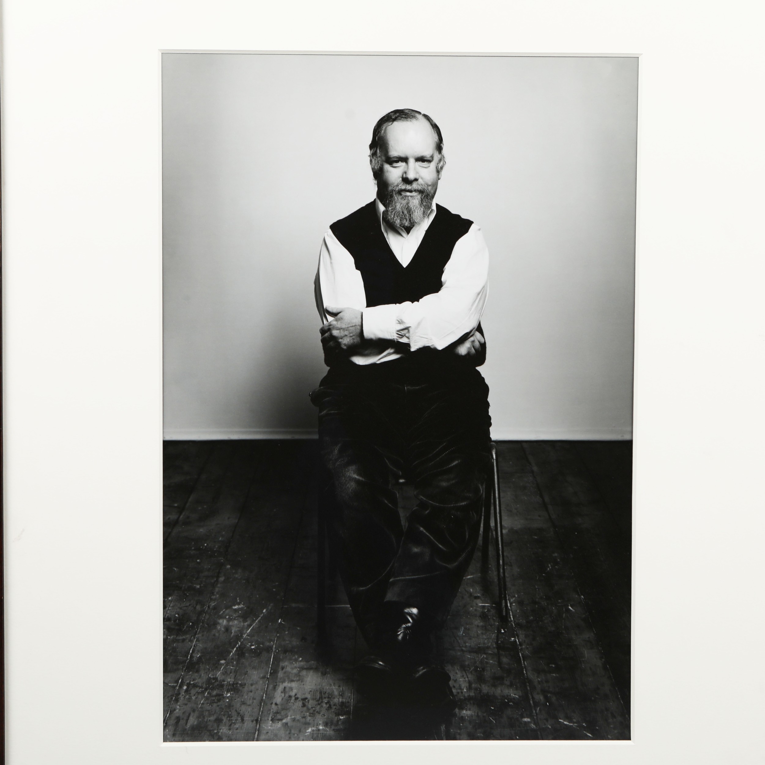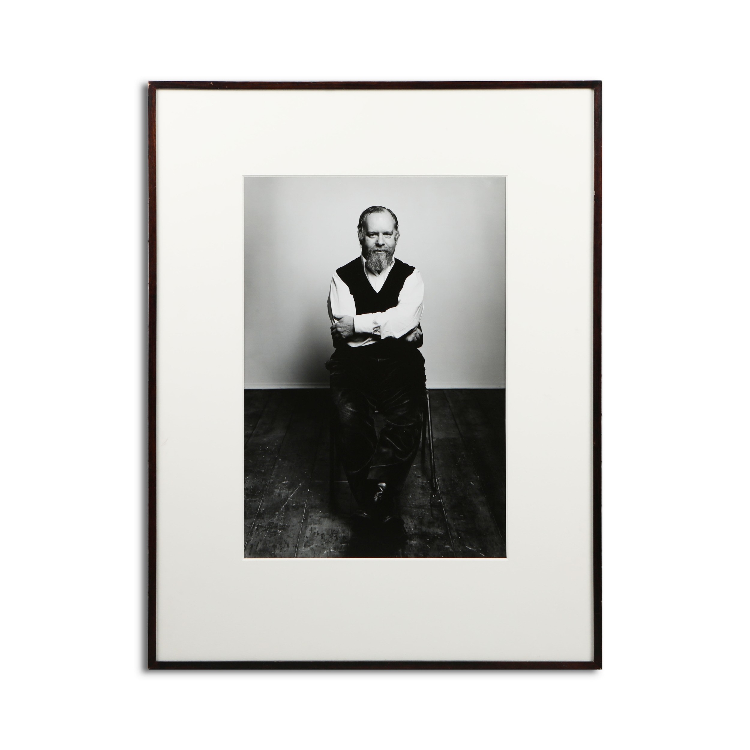 TERENCE DONOVAN (1936 – 1996). PETER BLAKE, 1989. silver print, mounted. Signed, titled and dated in black pen on the back of the frame, photographer's label affixed to the back of the frame, 99 cm H x 76.5 cm W (framed).