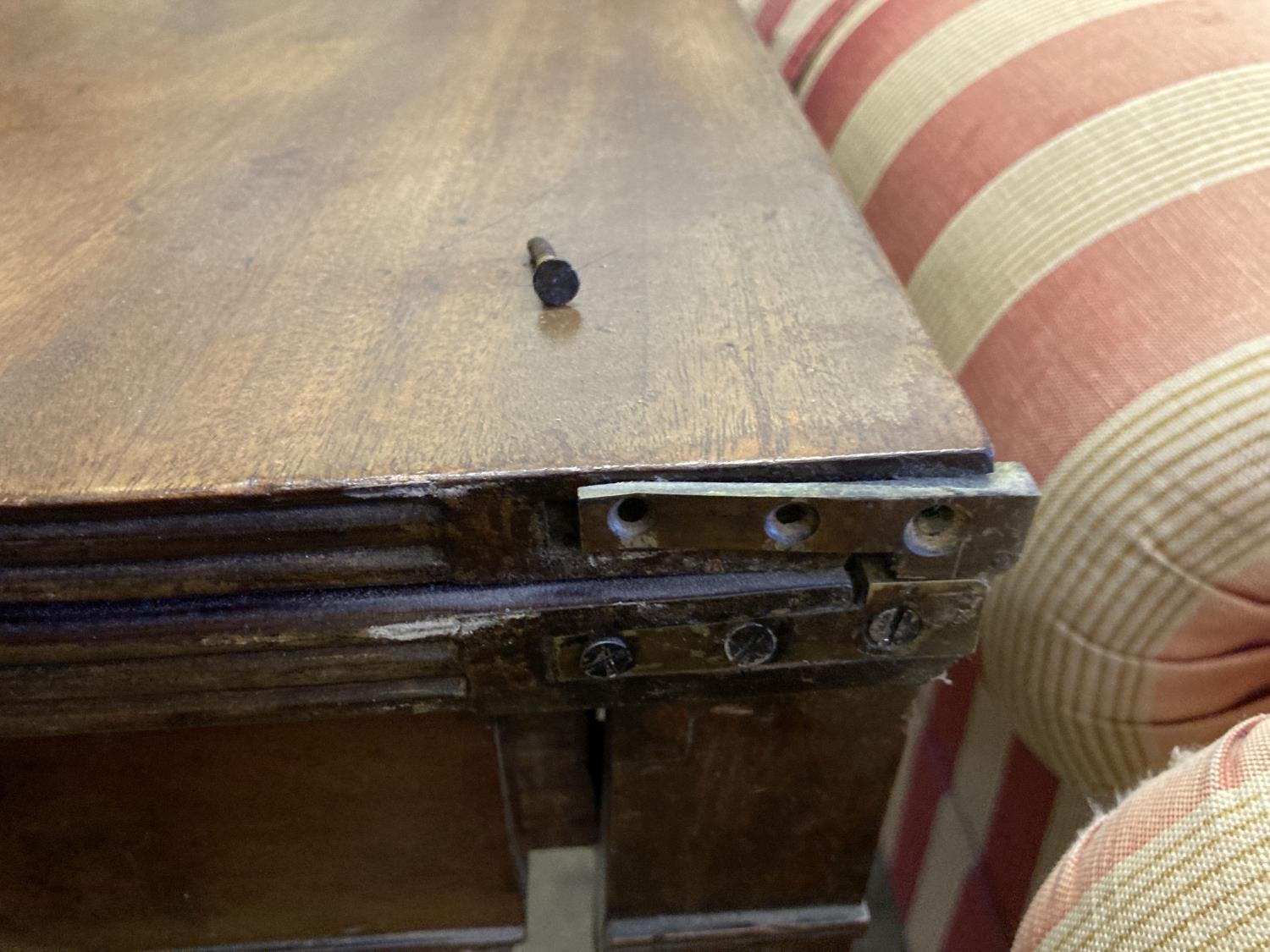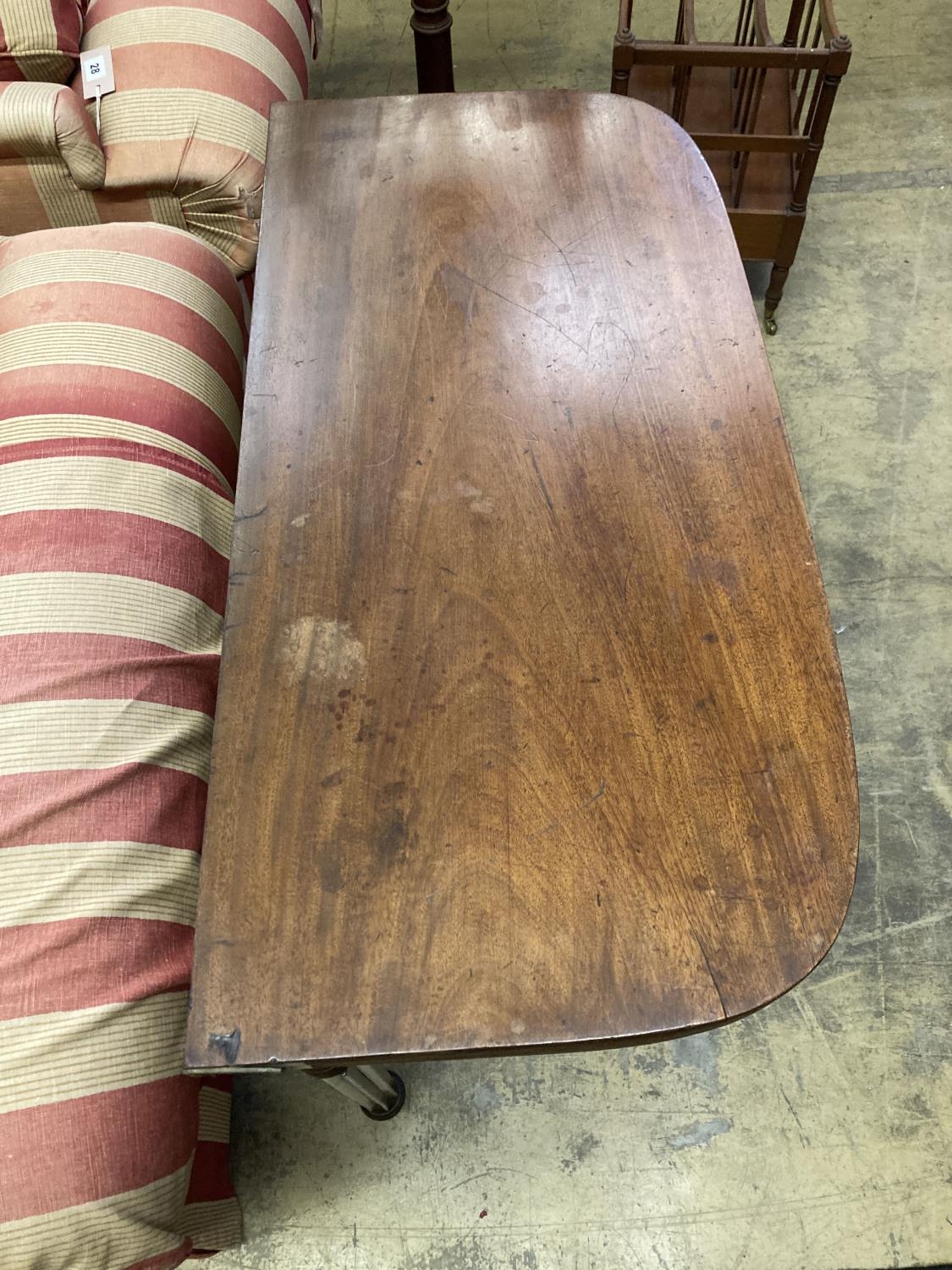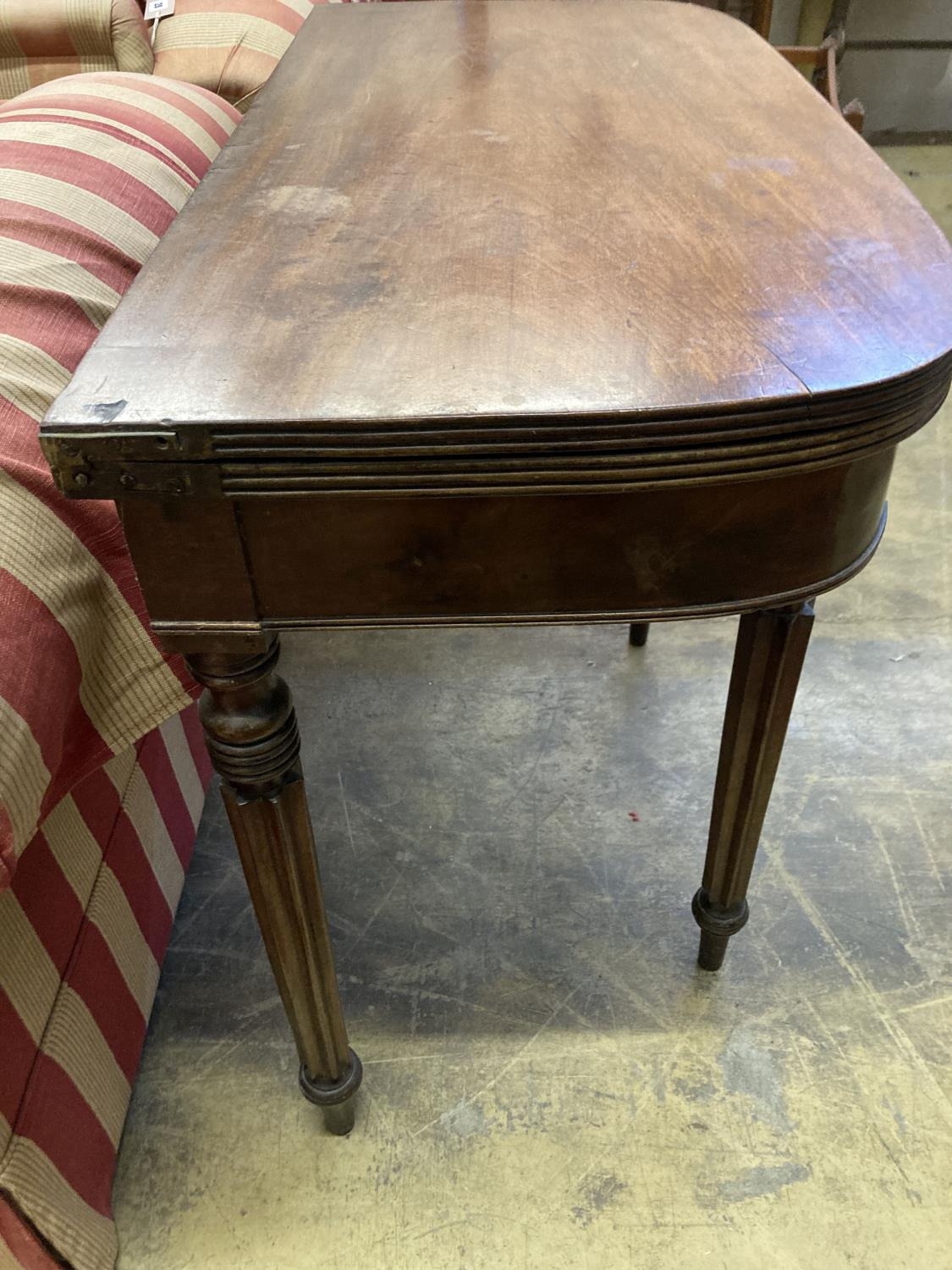 A Regency D shape mahogany folding tea table, width 93cm, depth 45cm, height 74cm