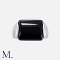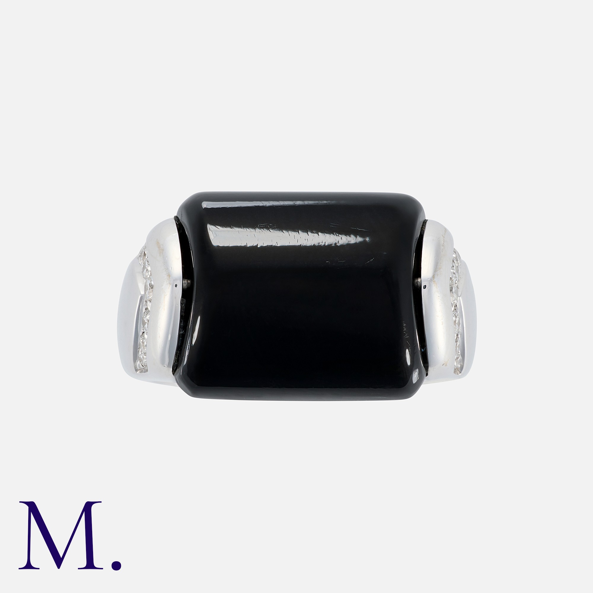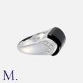 BULGARI. An Onyx and Diamond Tronchetto Ring in 18K white gold set with a principal polished onyx with diamond accents. Signed Bulgari and Italian marks for 18ct gold.