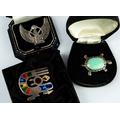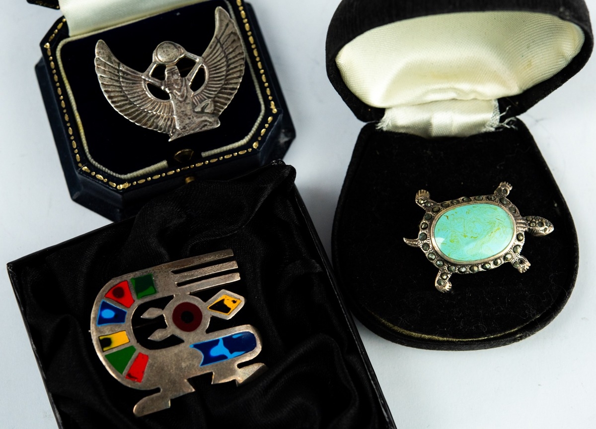 STERLING SILVER BROOCH in the form of the Egyptian winged goddess Isis; an INCA STERLING SILVER AND ENAMELLED 'QUETZEL BIRD' BROOCH; and a MARCASITE TORTOISE BROOCH with green body (3)