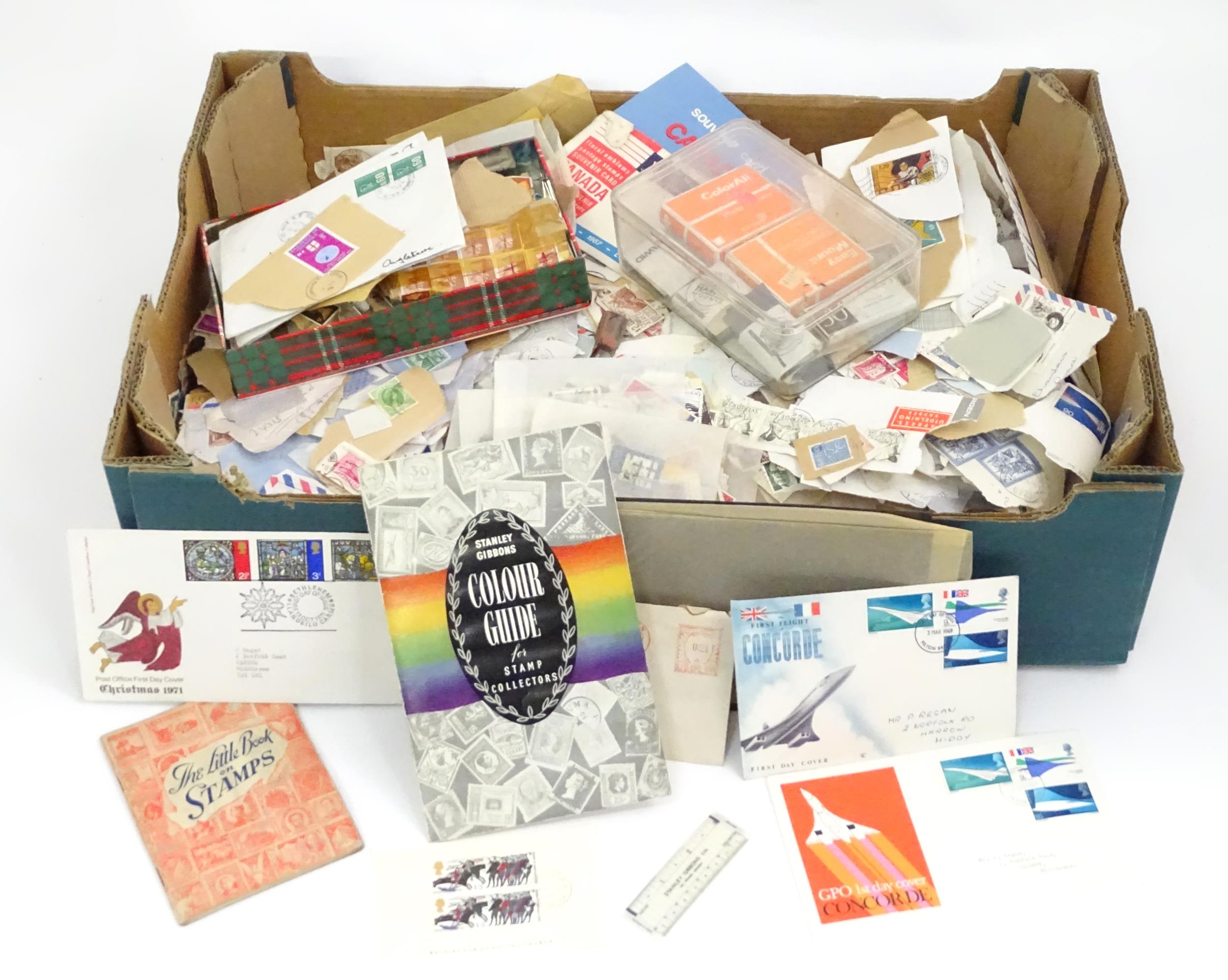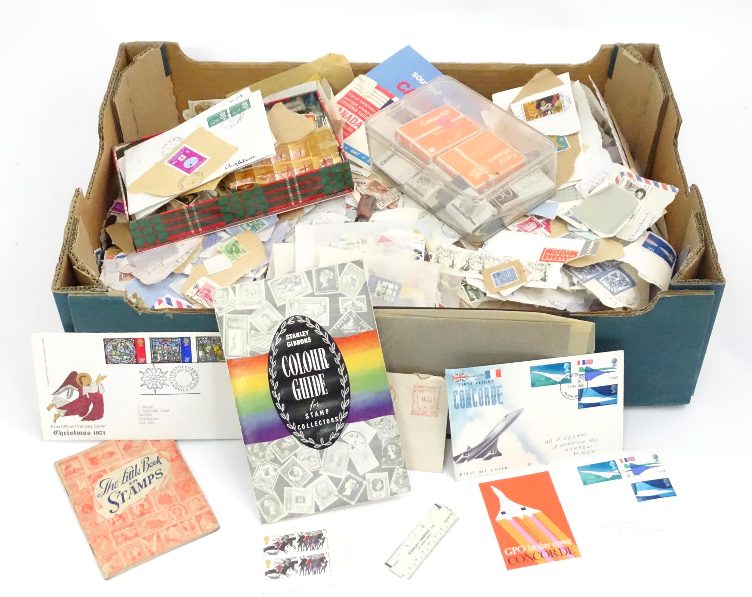 Stamps / Postal History : A quantity of assorted stamps and first day covers, to include British, Commonwealth & Worldwide stamps. Together with a Stanley Gibbons Colour Guide for Stamp Collectors, and a Stanley Gibbons Rule