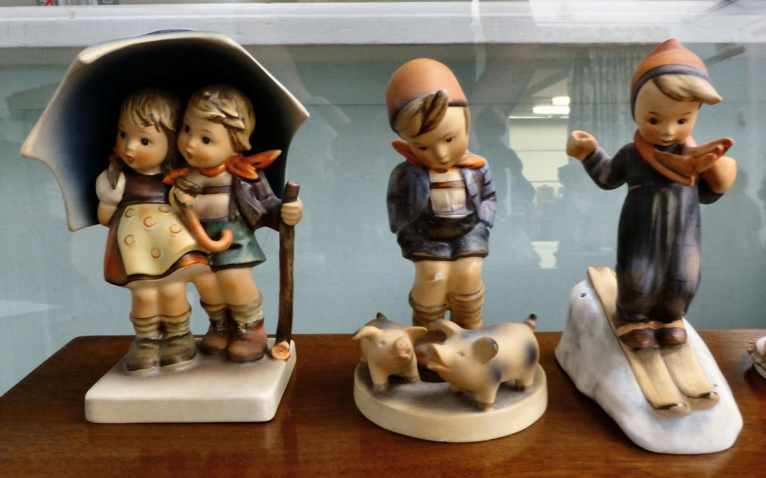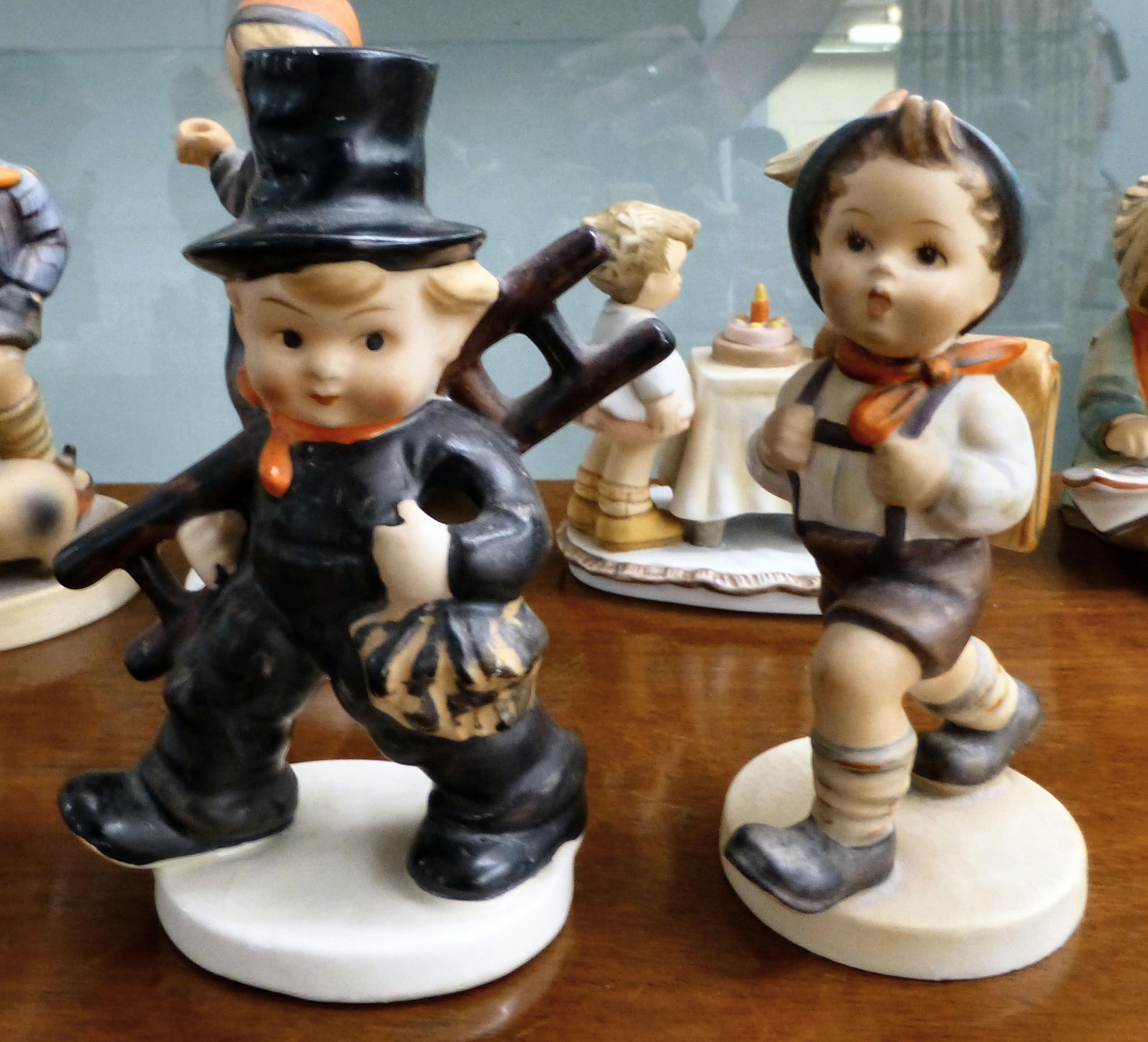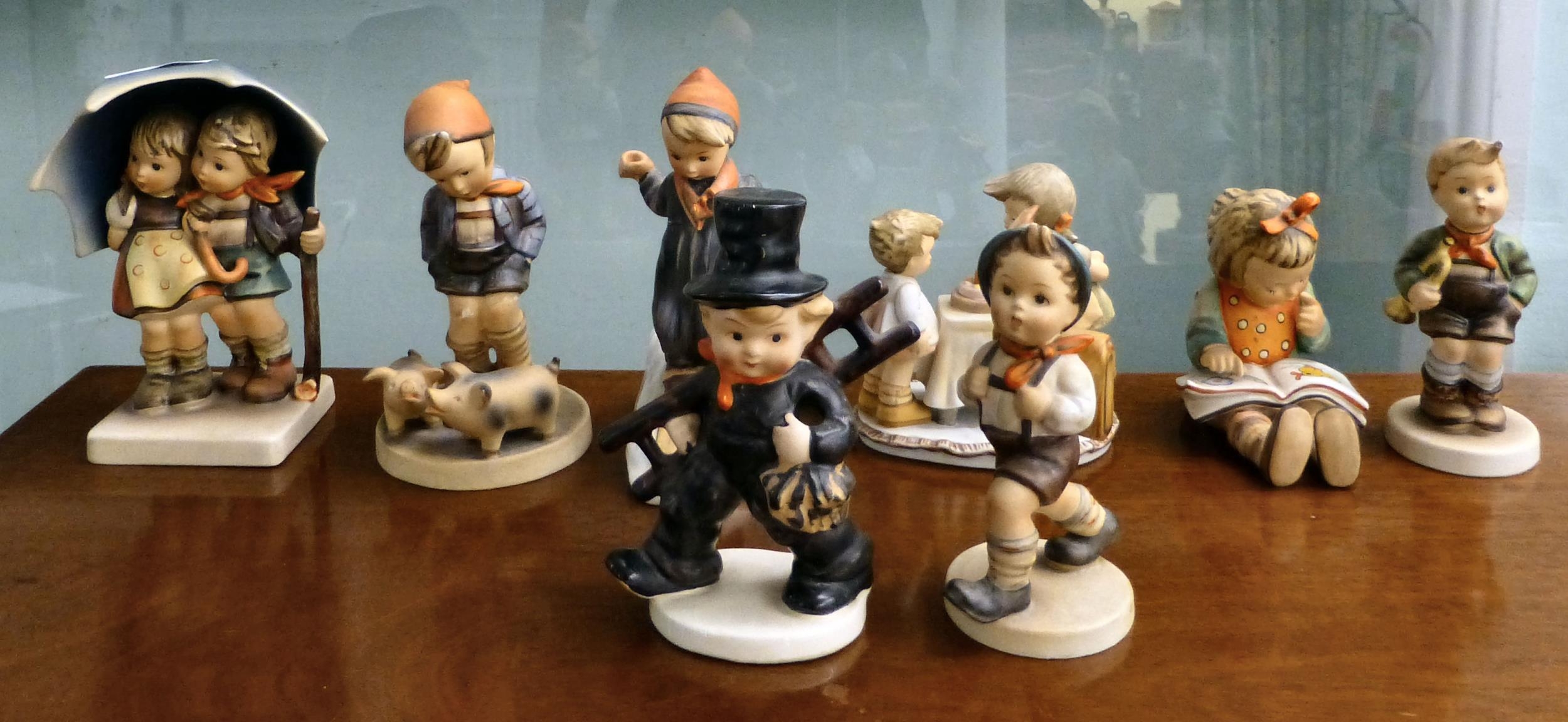 Eight Goebel china figures: to include a boy with an umbrella 7"h