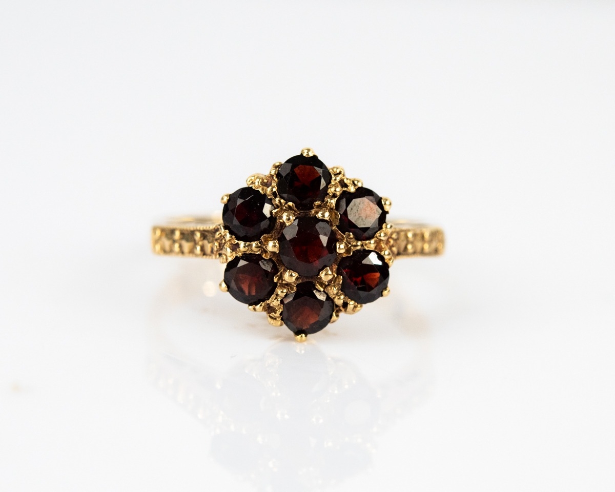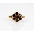 9ct GOLD DAISY CLUSTER RING set with seven garnets, ring size ‘L’, 2.4gms