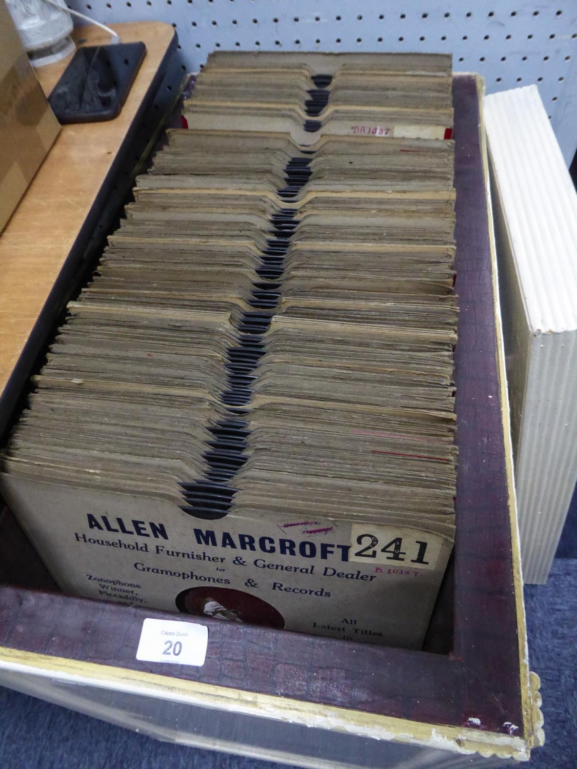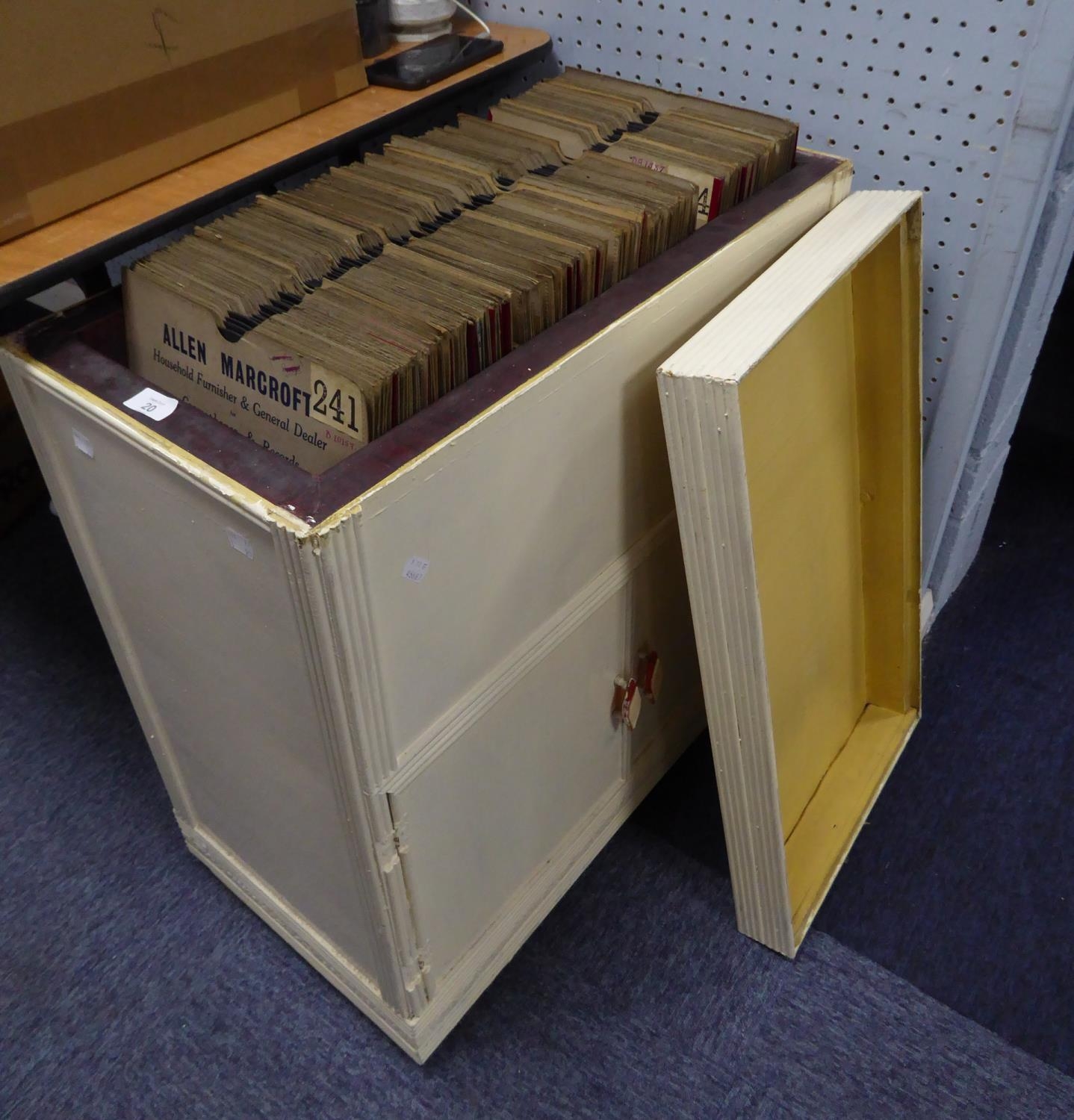 VINYL RECORDS JAZZ. A large selection of 78rpm records housed in a homemade wooden storage unit, with lid section and front opening doors. Mixture of genre easy listening, operatic classical, country, vocal, jazz dixie etc. Various artists to include The Hillbillies, Paul Robeson, The Ink Spots, Foden’s Motor Works Band, Tino Rossi, Ray Kinney, Debroy Somers Band, Hedley Ward Trio. (approx 190).