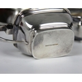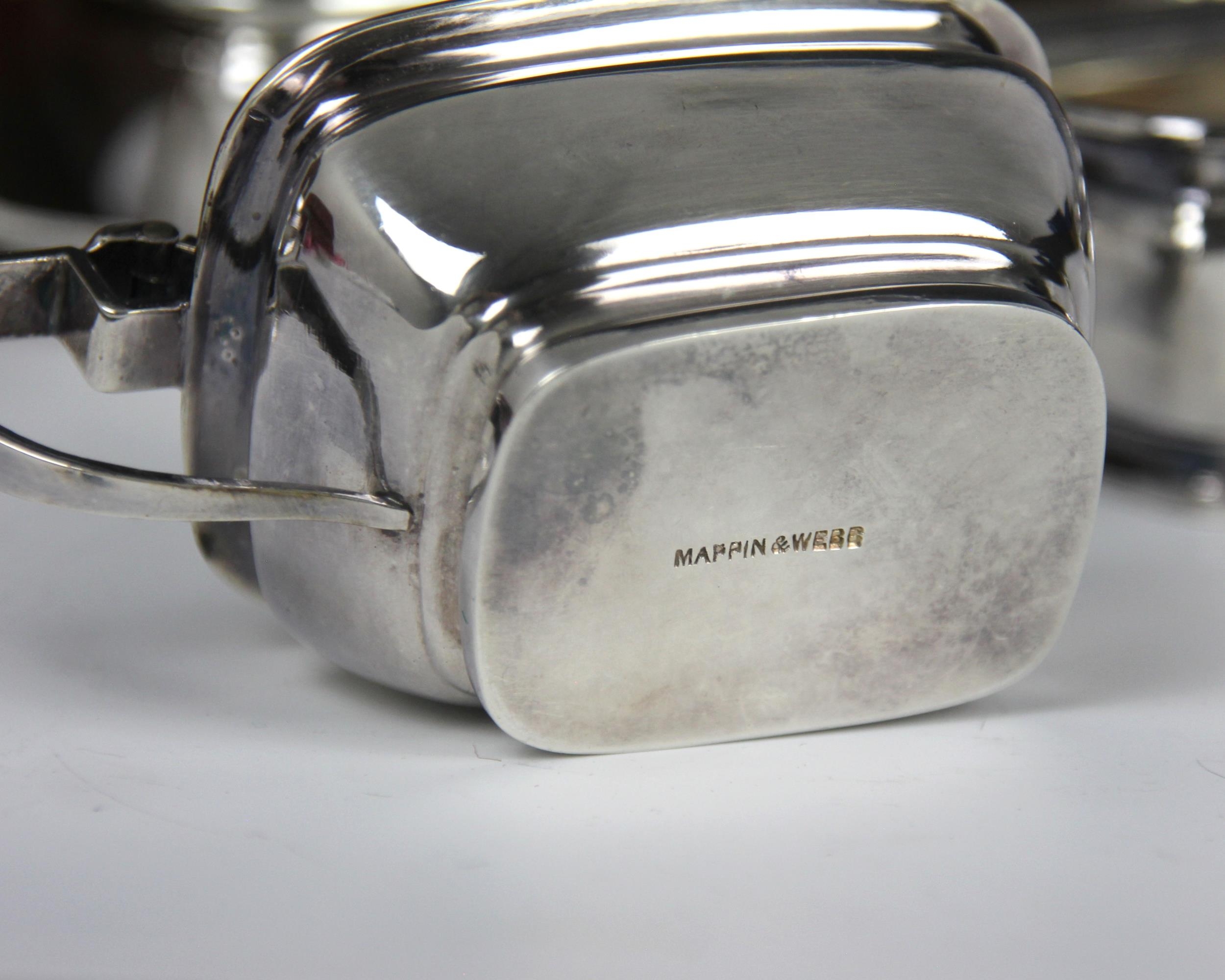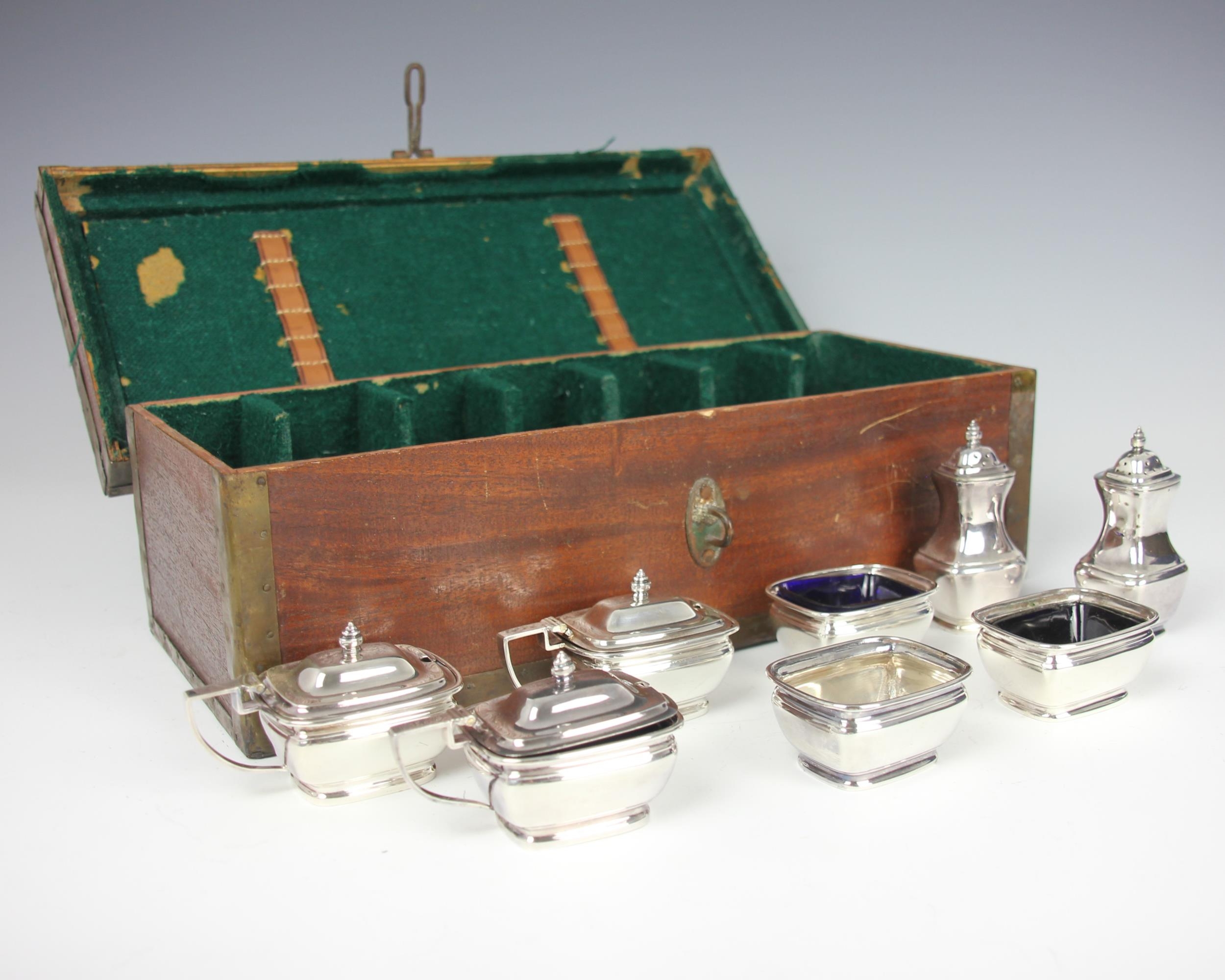 A cased set of silver plated Mappin and Webb condiment sets, comprising three pepperettes, three wet mustards, and three open salts, of plain polished form with grooved detail, stamped 'Mappin and Webb' to base, within fitted case (at fault)