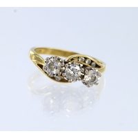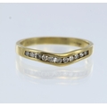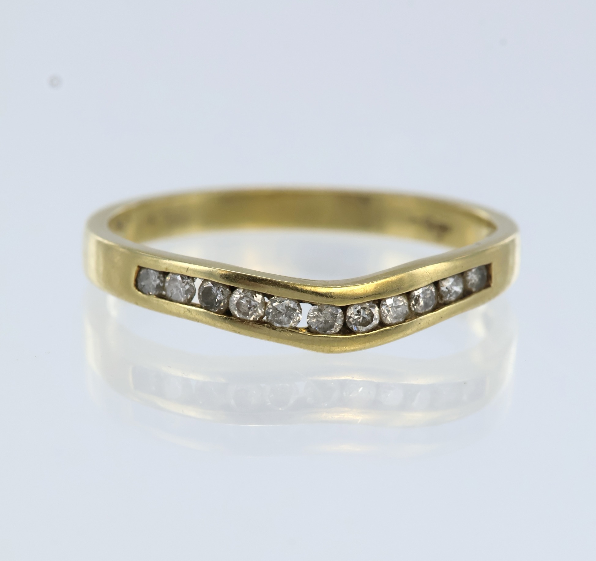 18ct yellow gold diamond channel set shaped band ring, eleven round brilliant cuts, known diamond weight 0.20ct, finger size P, weight 2.3g