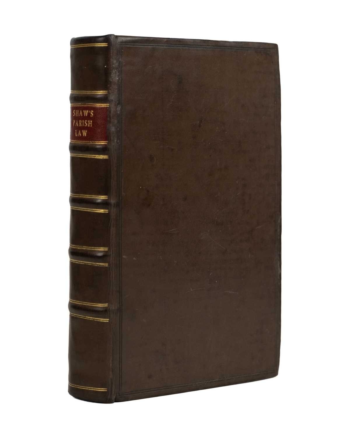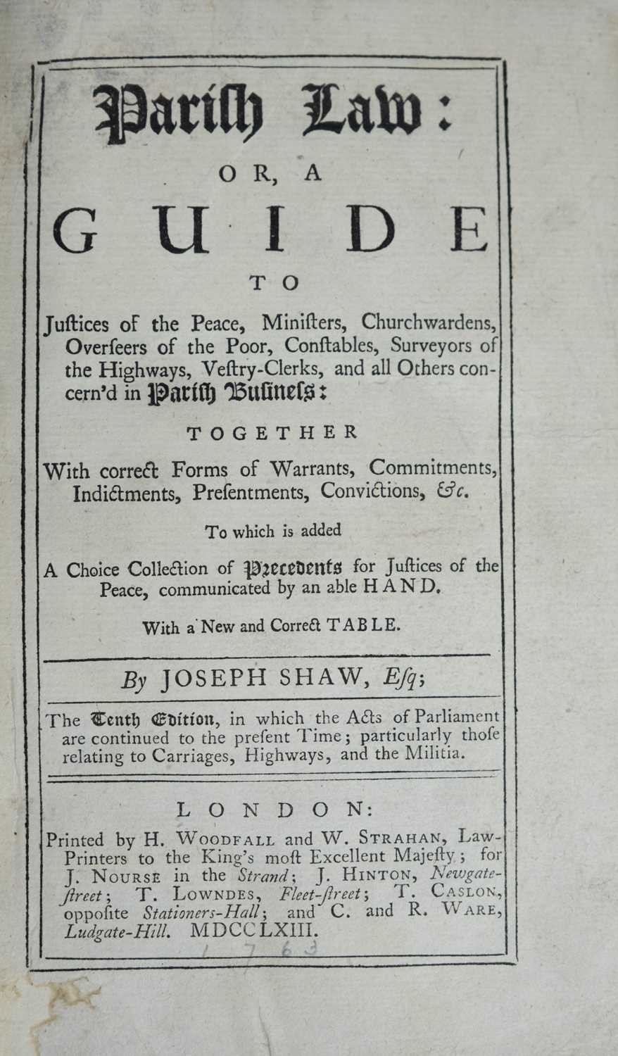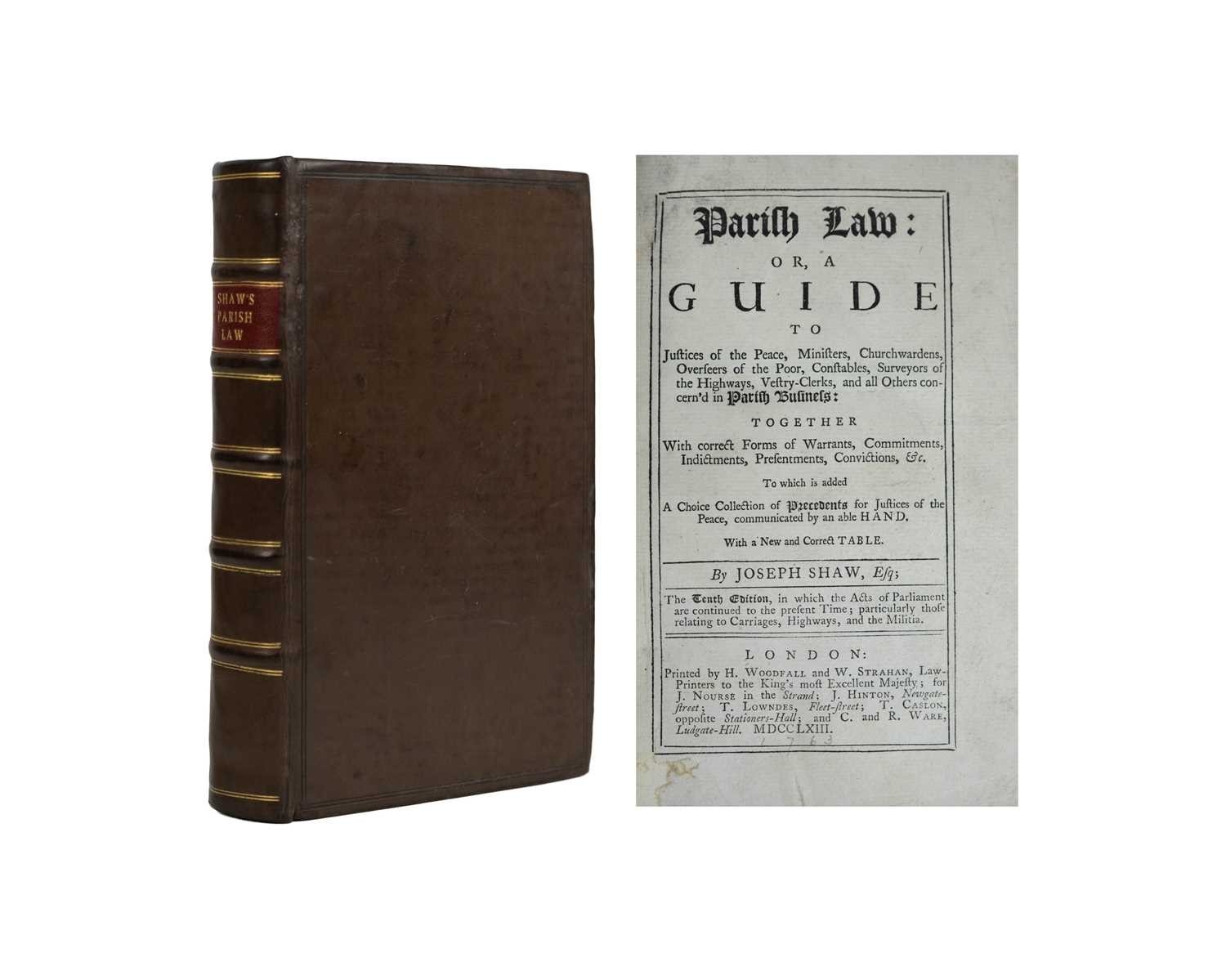 Joseph Shaw Parish Law: Or, A Guide to Justices of the Peace, Ministers, Churchwardens..... Tenth edition, rebound in a sturdy full polished calf, raised bands and morocco label to spine, marbled endpapers, conservation to bottom gutter edge of title page, vg, H. Woodfall and W. Strahan, London, 1763.