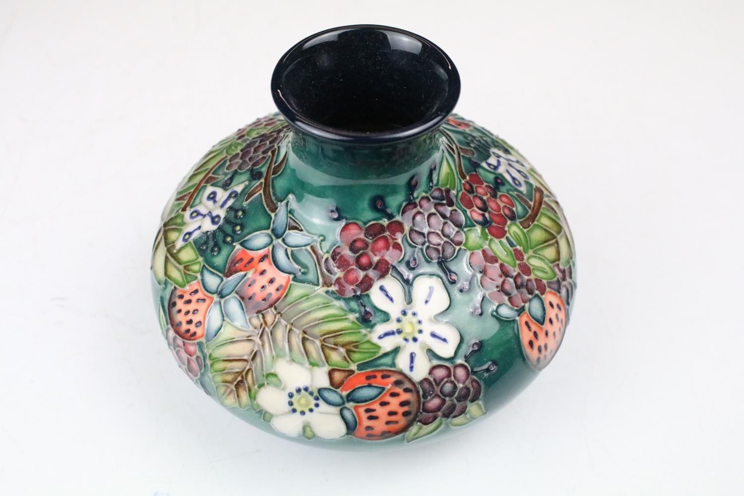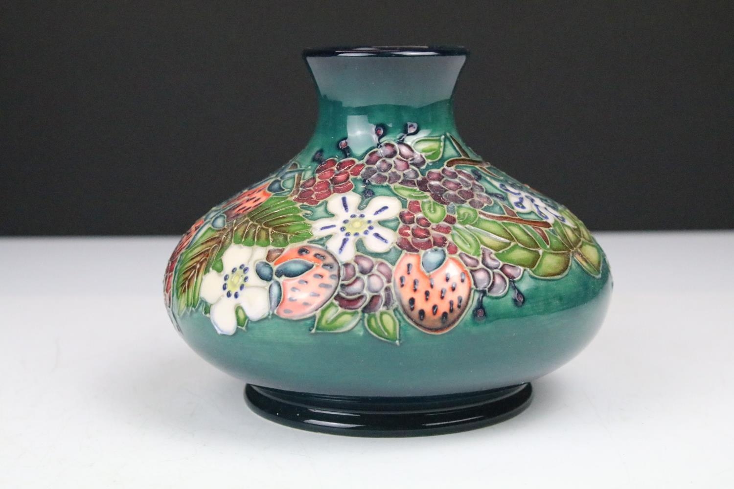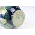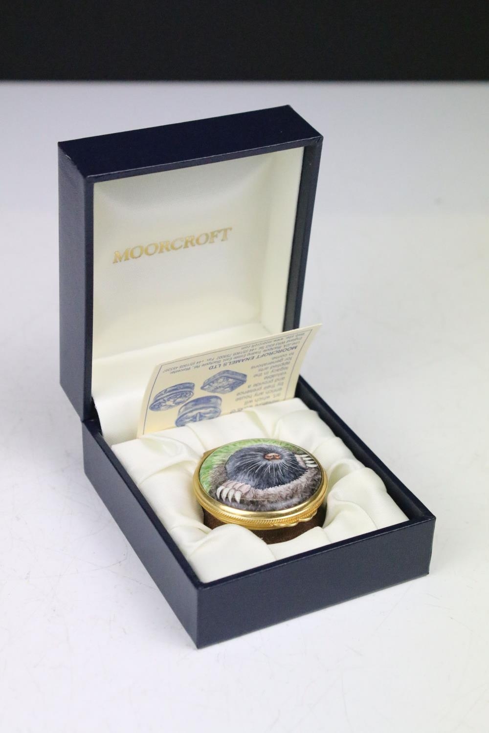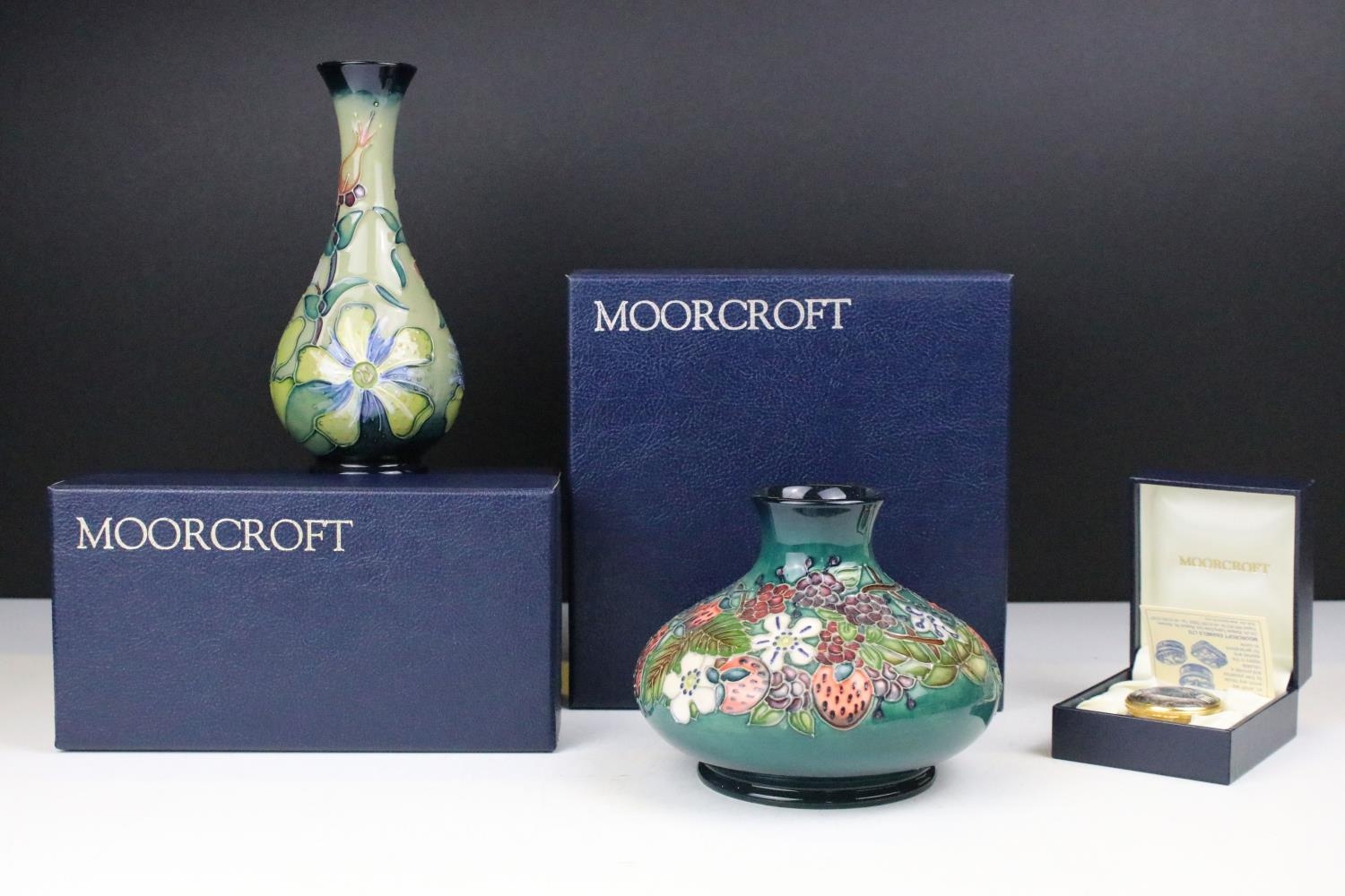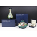 Two boxed Moorcroft pottery vases to include a Carousel squat vase (11cm tall), and a Hypericum baluster vase, plus a boxed Moorcroft enamel pill box with mole decoration