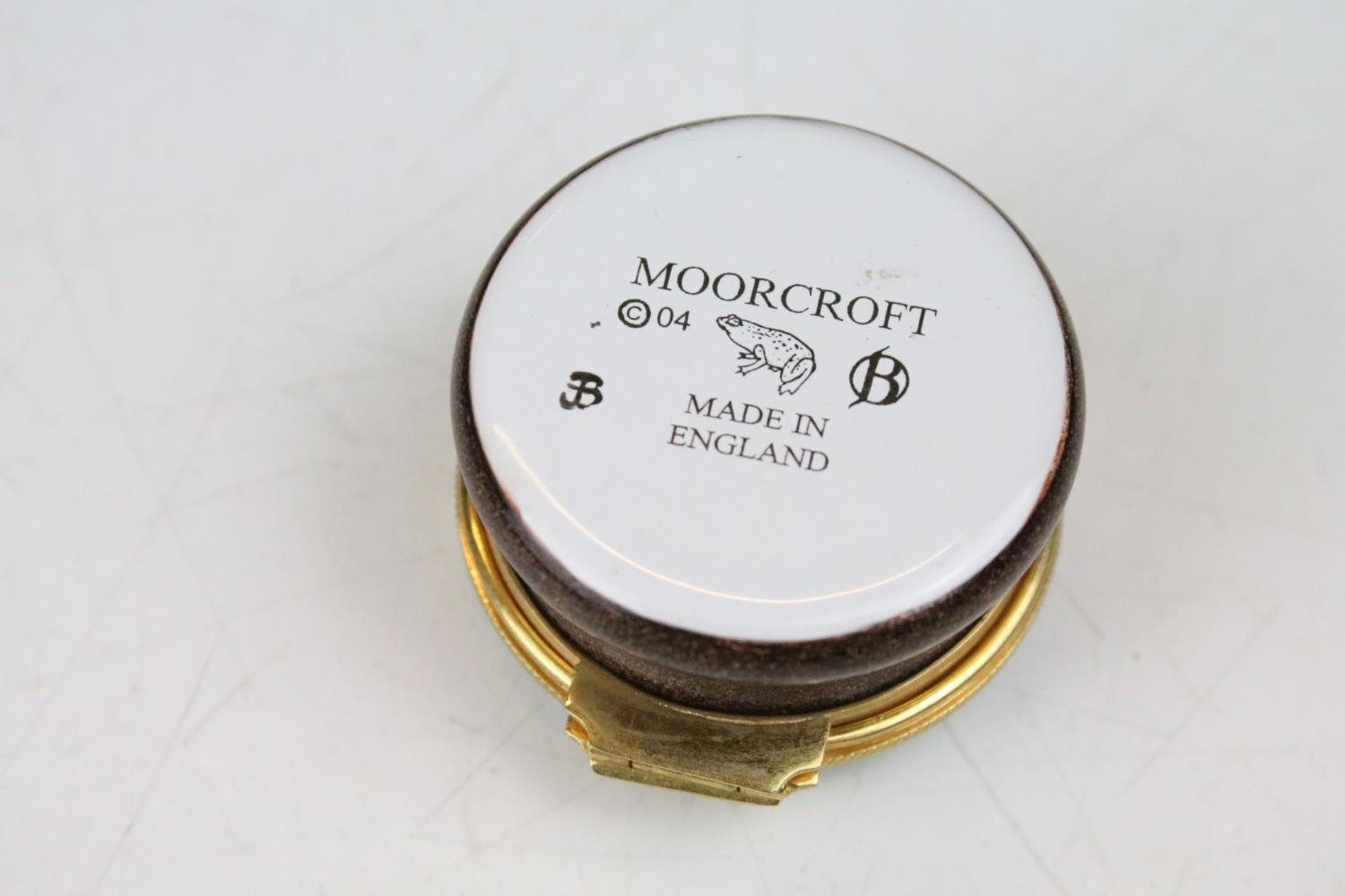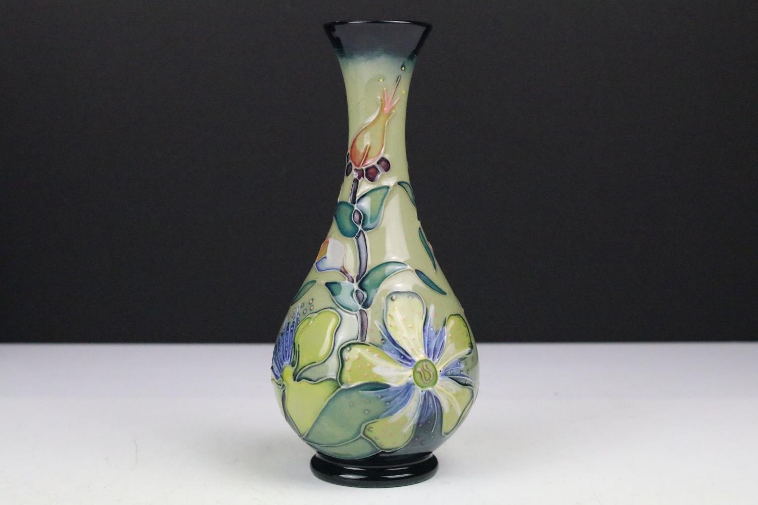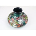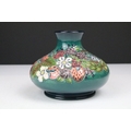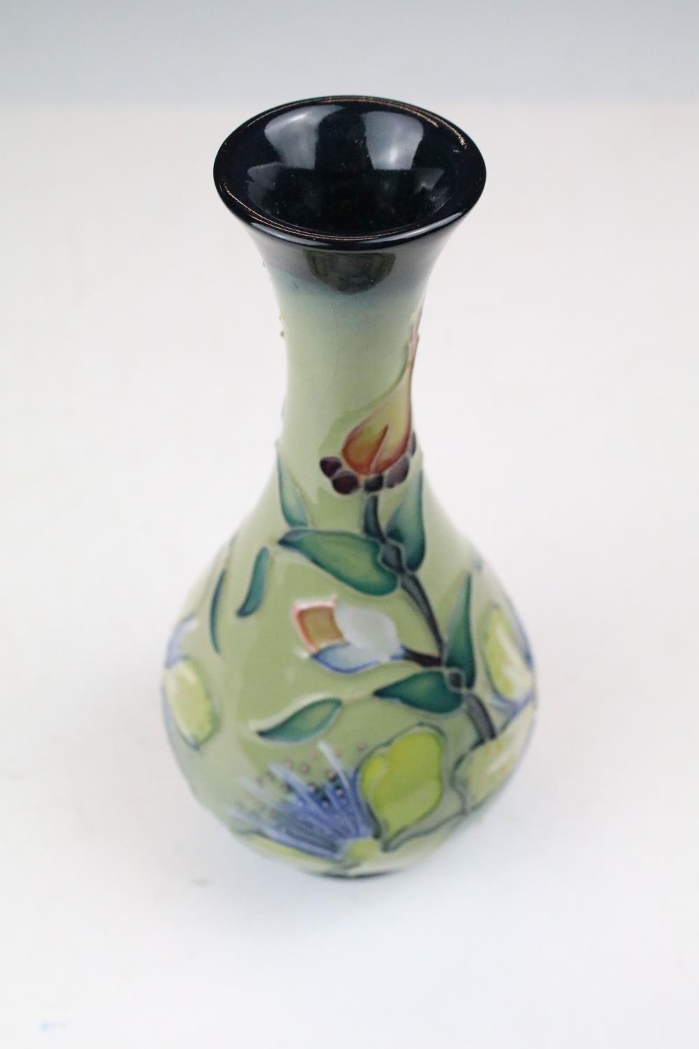 Two boxed Moorcroft pottery vases to include a Carousel squat vase (11cm tall), and a Hypericum baluster vase, plus a boxed Moorcroft enamel pill box with mole decoration