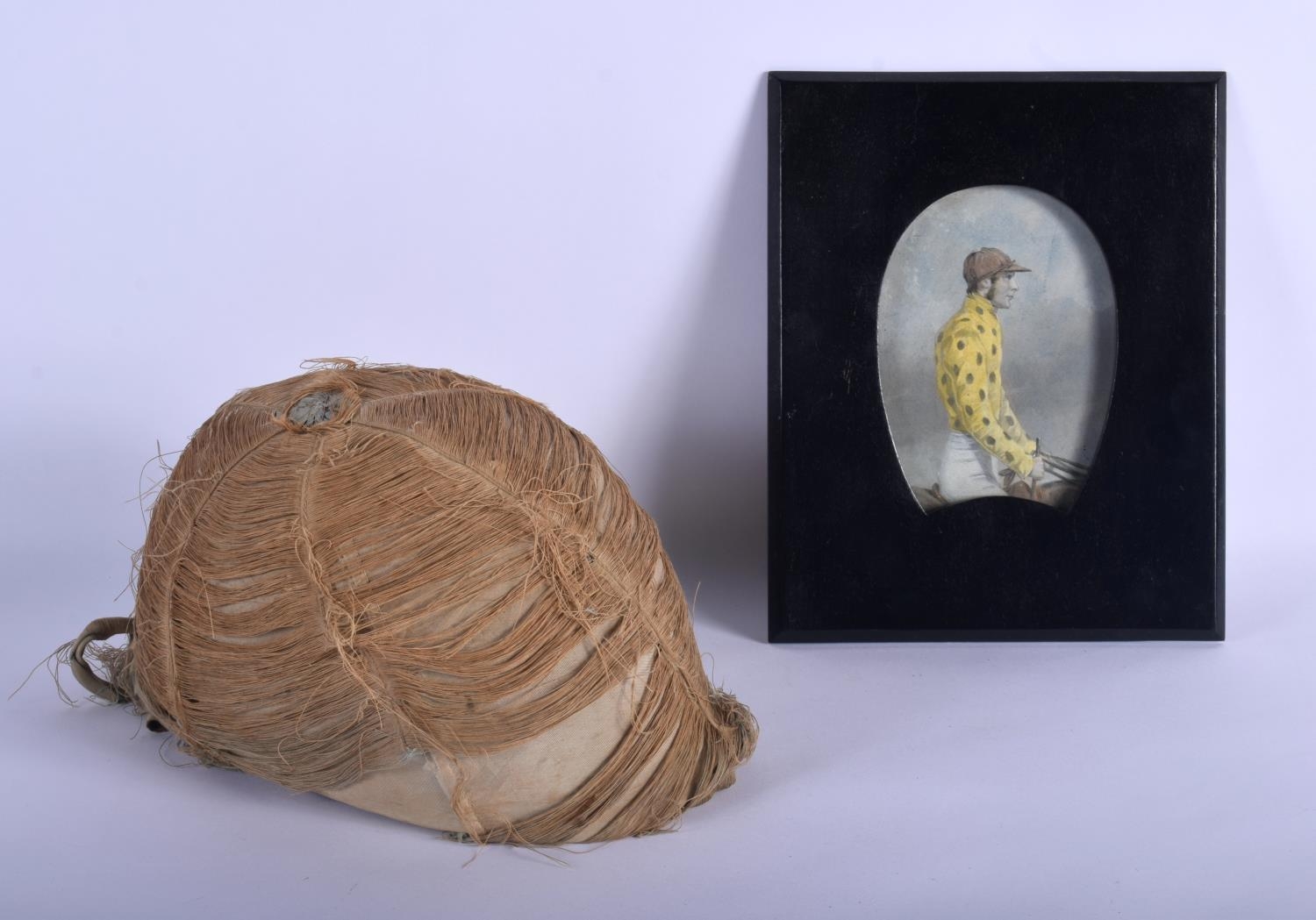 A VERY RARE EARLY 19TH CENTURY CHRISTYS LONDON CORK JOCKEY EQUESTRIAN HAT with possibly original engraving of a jockey wearing the hat. Hat 24 cm x 15 cm. (2)