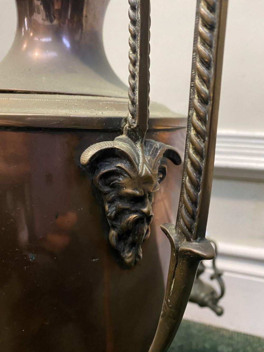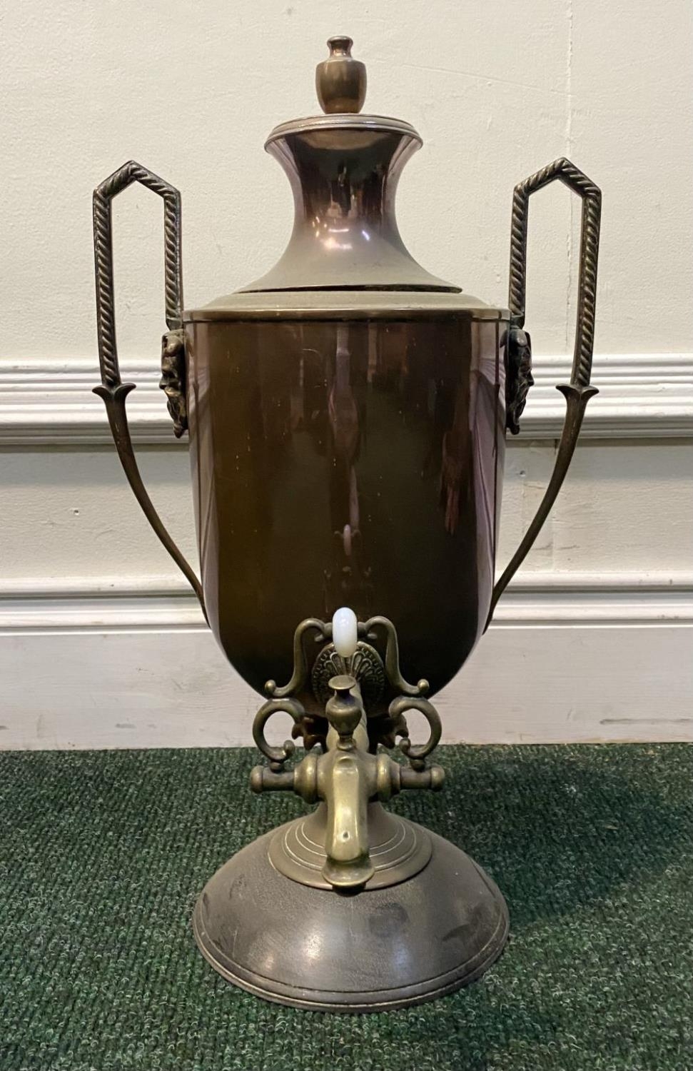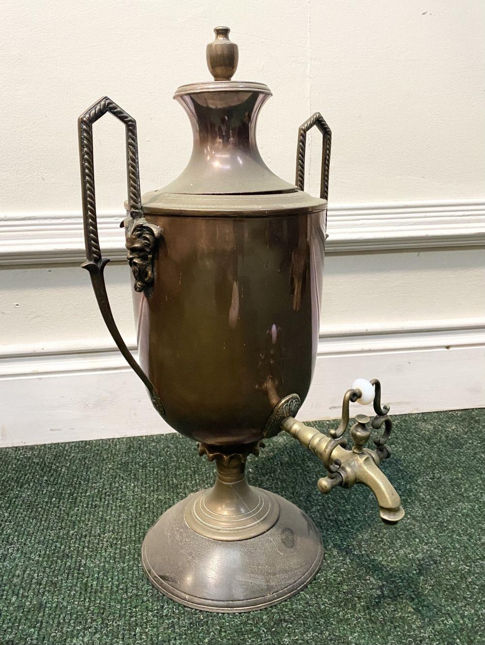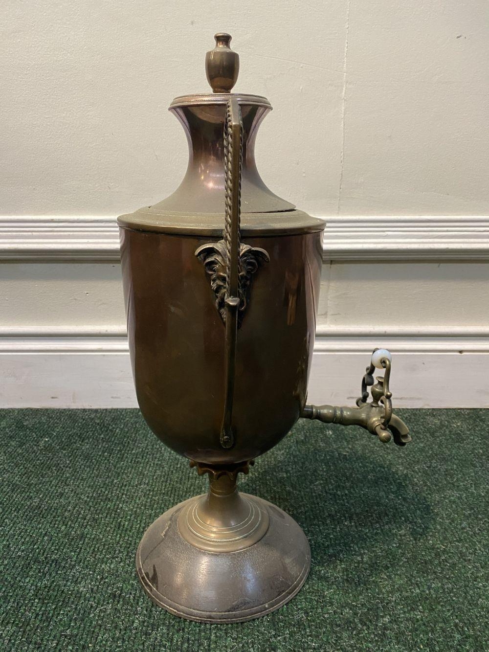 AN ANTIQUE WILLIAM C. BURTON COPPER SAMOVAR, urn form with shaped engraved handles, decorative tap, raised on circular base. Marked 'William S. Burton, 29 Oxford Street, London'. Dimensions: 53cm high x 32cm wide approx