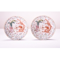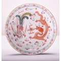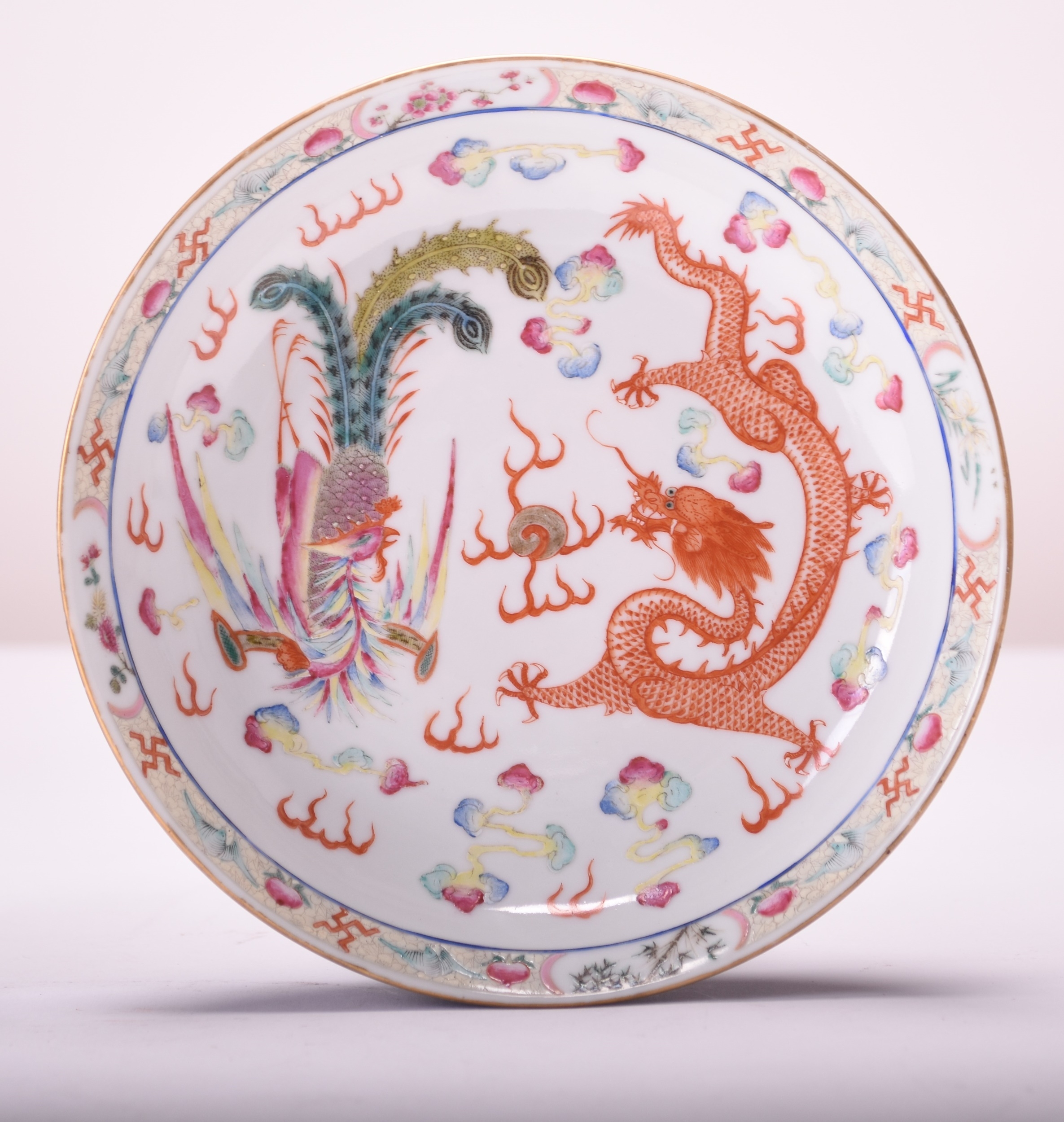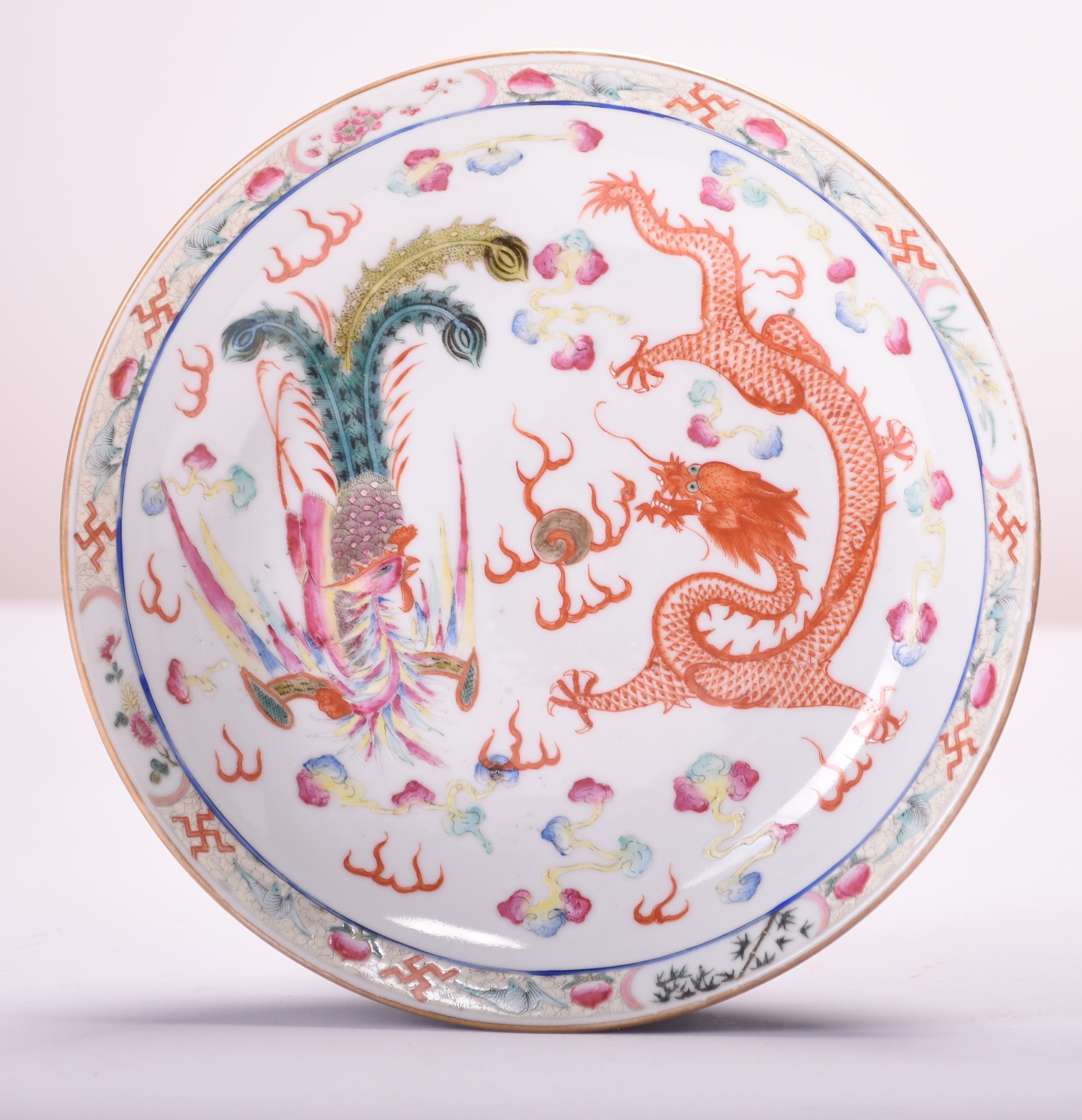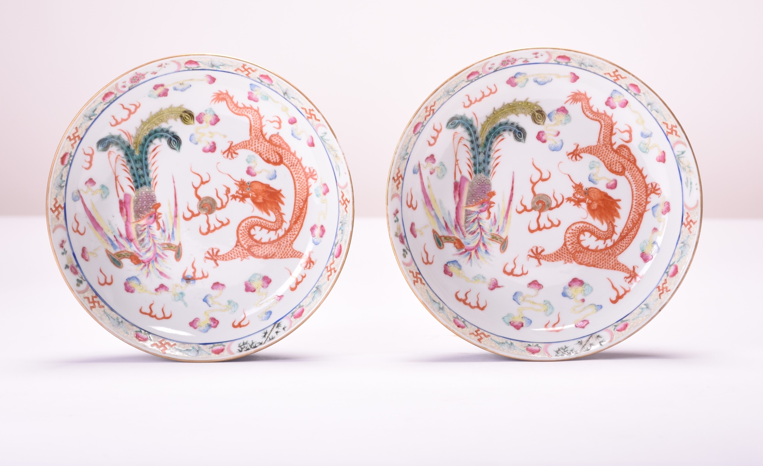 A pair of Chinese dragon and phoenix dishes, Qing Dynasty Of circular form, the deep dishes painted in enamel colours with a dragon chasing a flaming pearl and a phoenix, amid clouds and flames, the rim with a border of peaches, bats and Buddhist emblems, the undersides in powder blue, four-character marks reading 'Precious object of pure spleandour'. 19cm dia. (2) Private English collection, the property of a lady.
