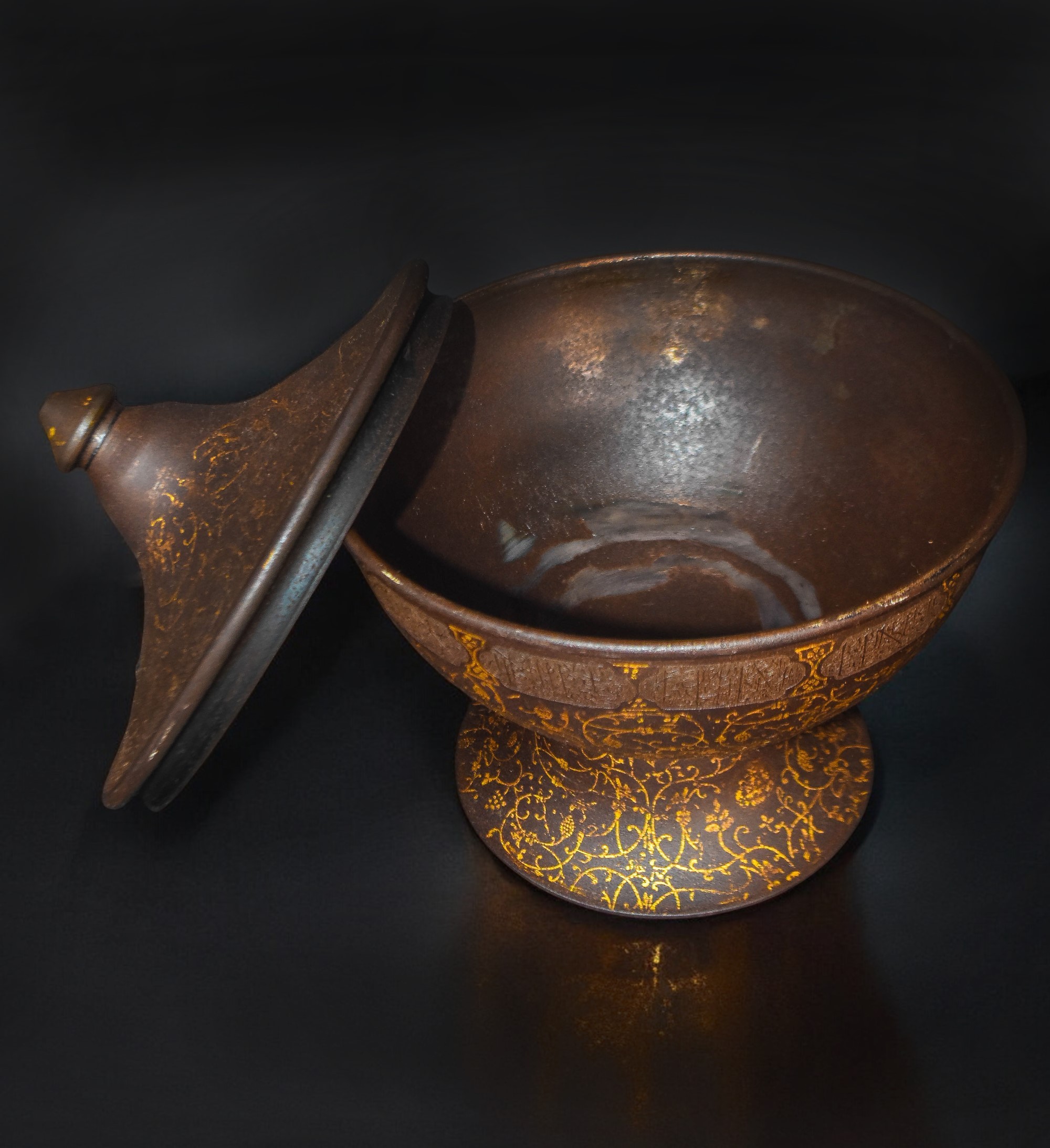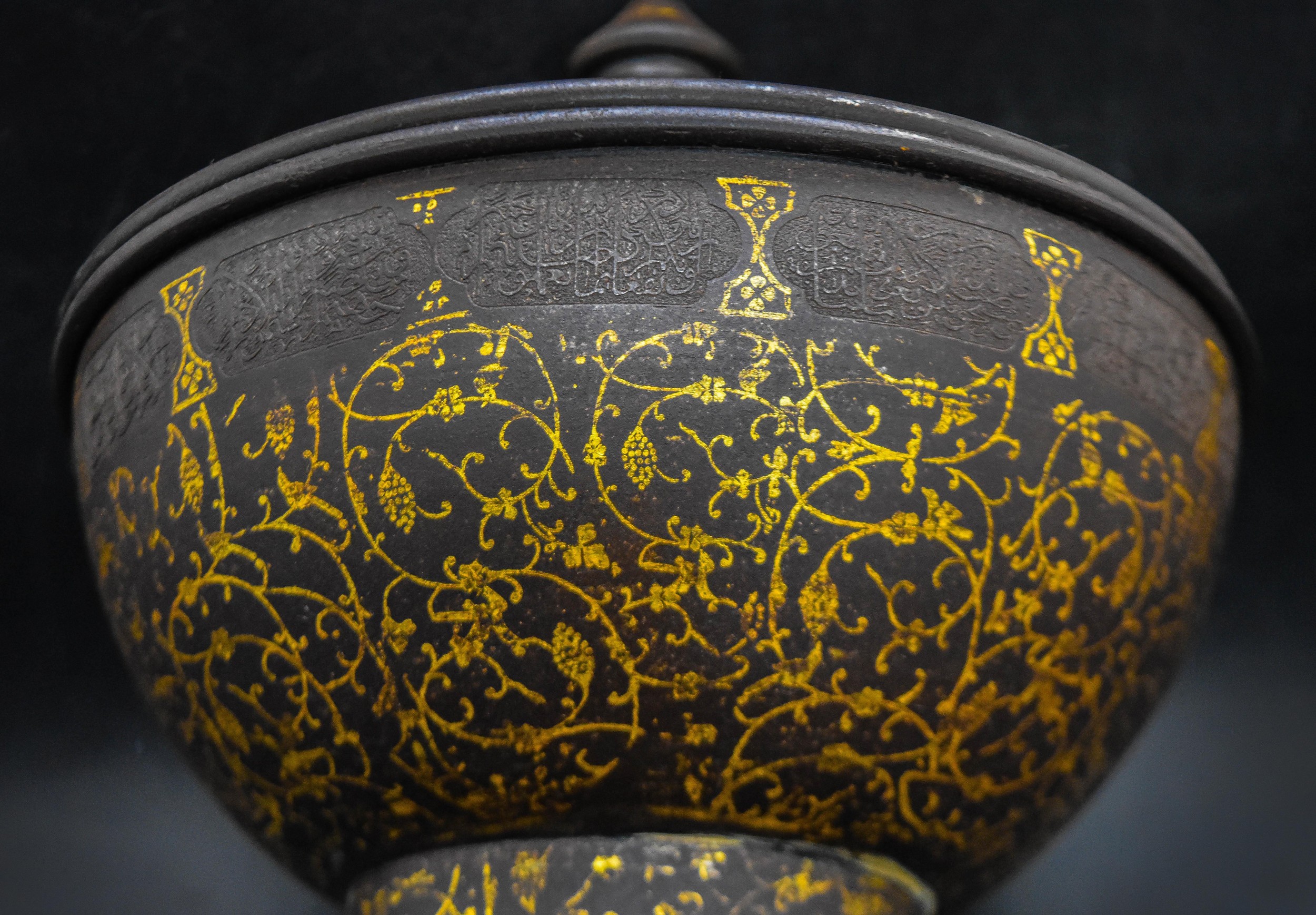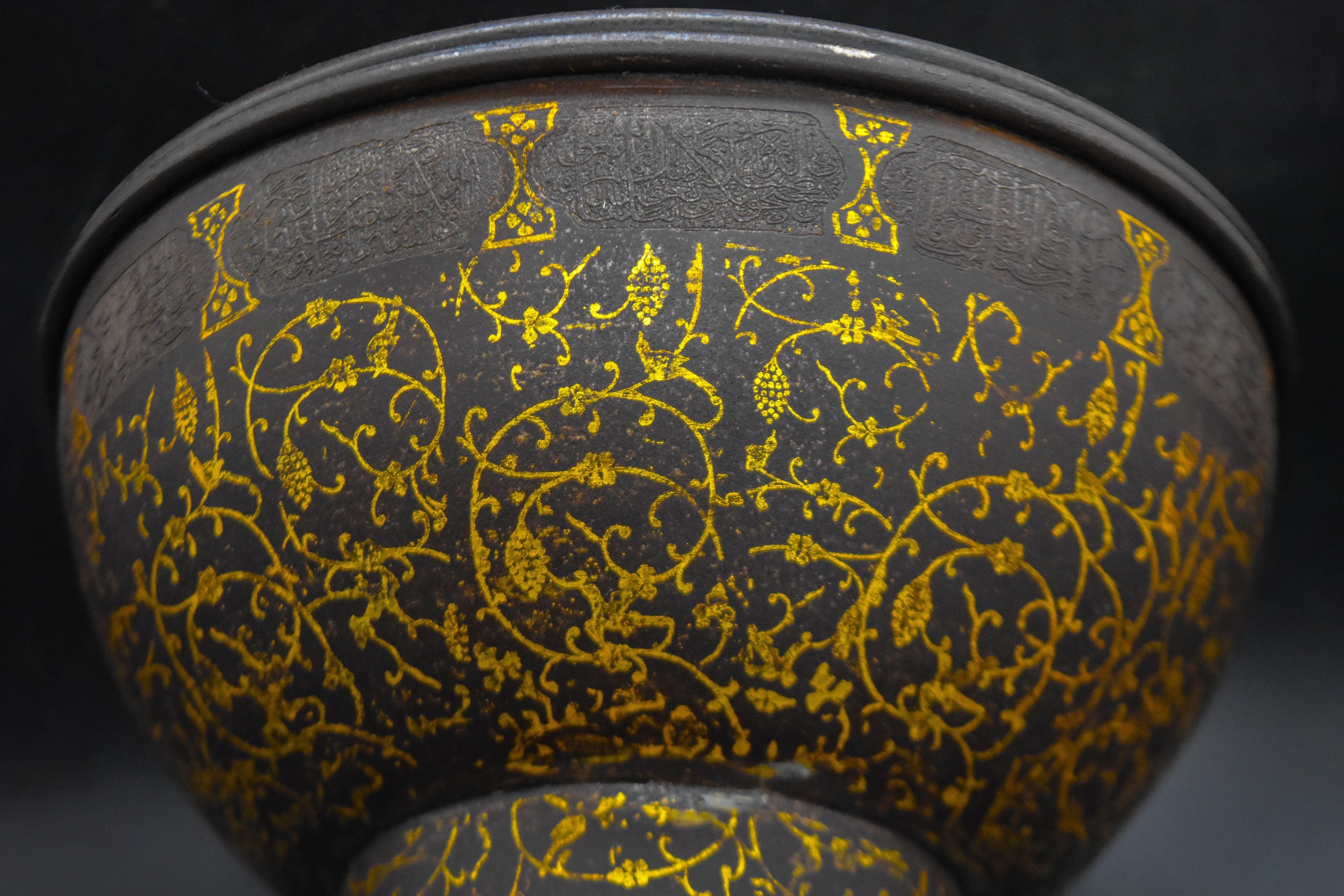 Islamic Qajar/Mughal Lidded Bowl with Gold Kuftgari Inlay and Islamic Calligraphic Ornamentation, Islamic Eastern